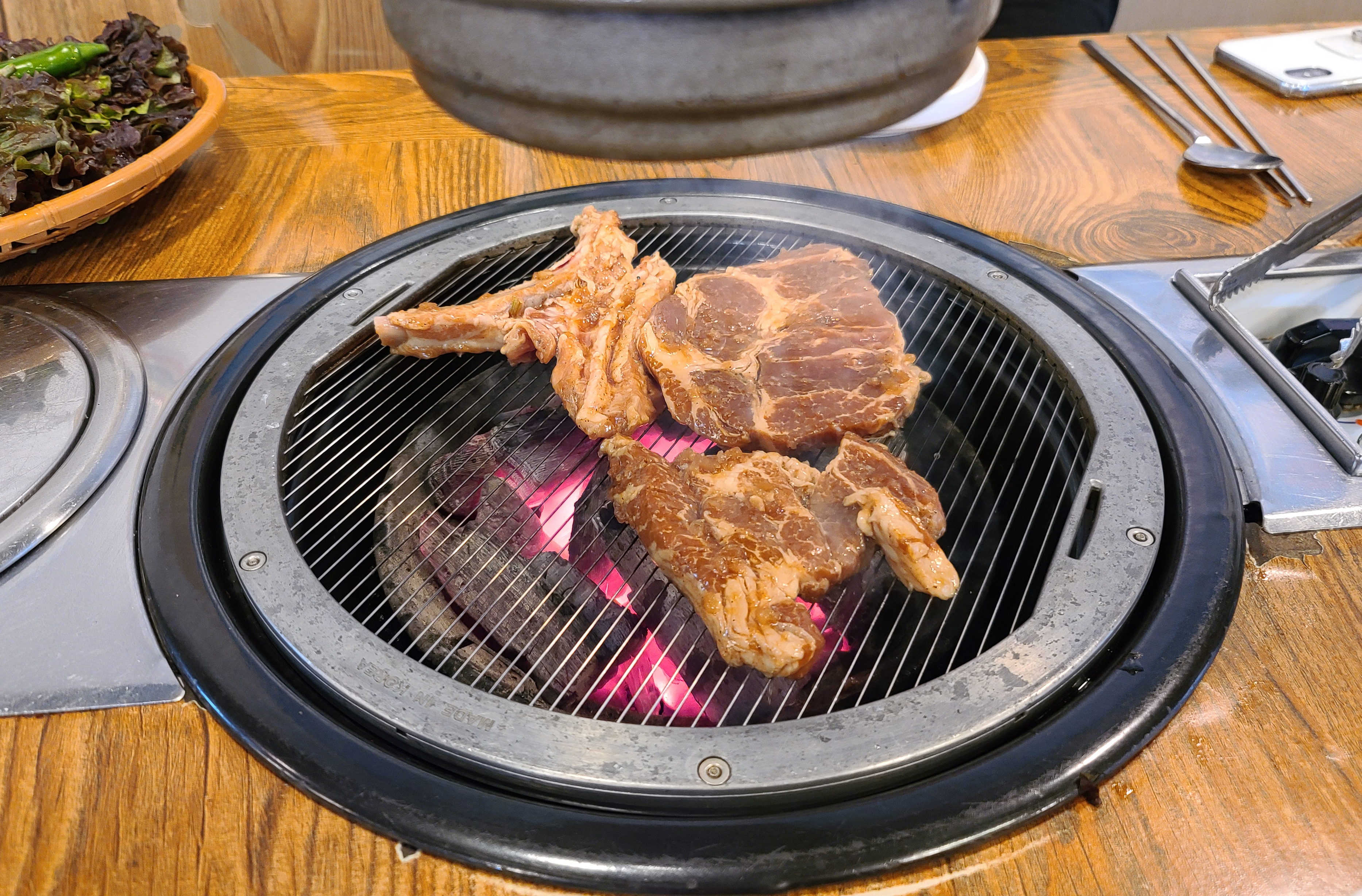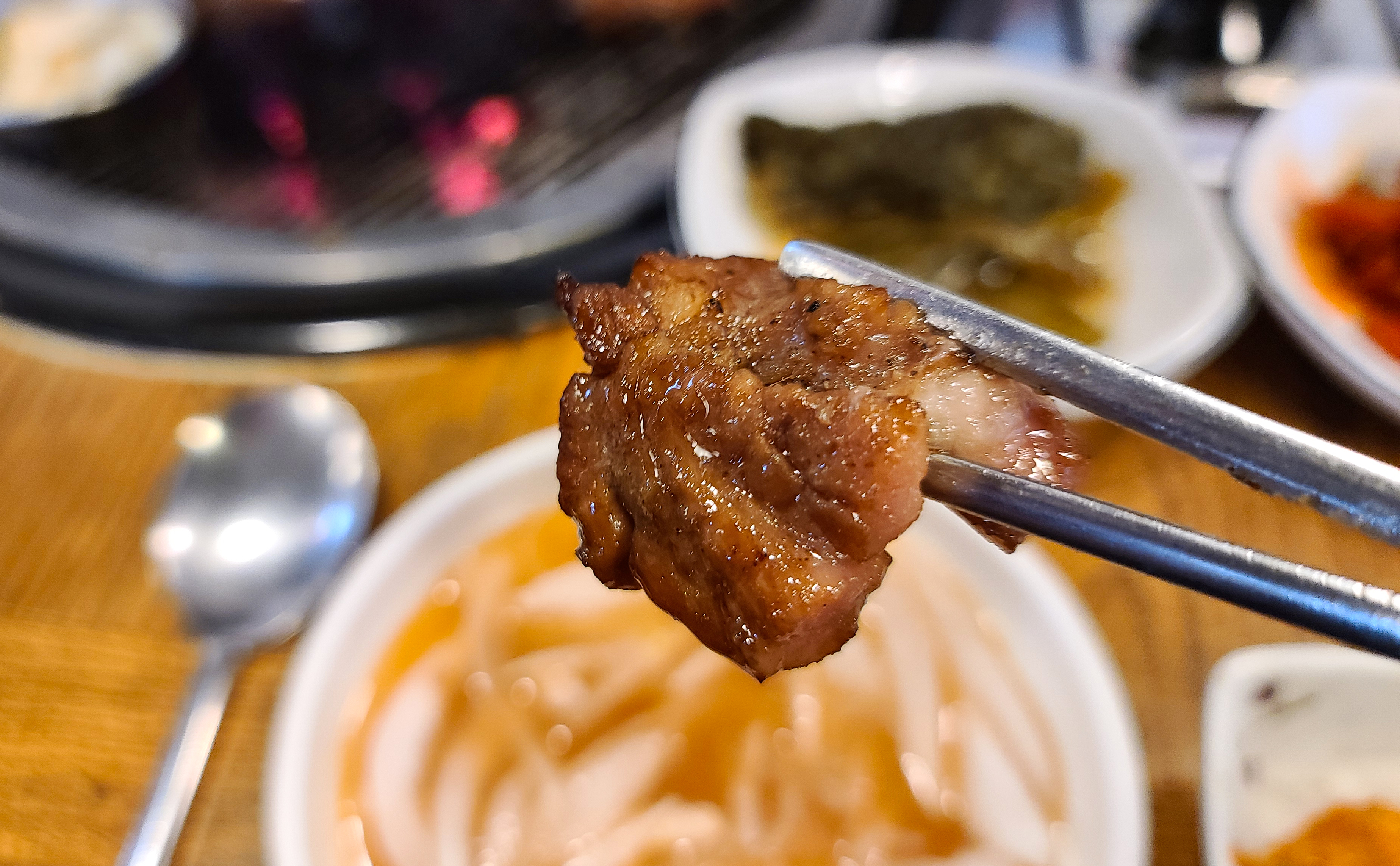 기다리던 갈비가 거의 다 익어갔습니다. 사장님께서 직점 만드신 달달한 갈비 양념에 숯불향이 은은하게 배어 맛이 있는 돼지갈비가 완성되었고요. 돼지갈비는 직접 갓으로 만 듯 피클과 곁들여 먹으면 더욱 깔끔한 맛을 느낄 수 있었습니다.