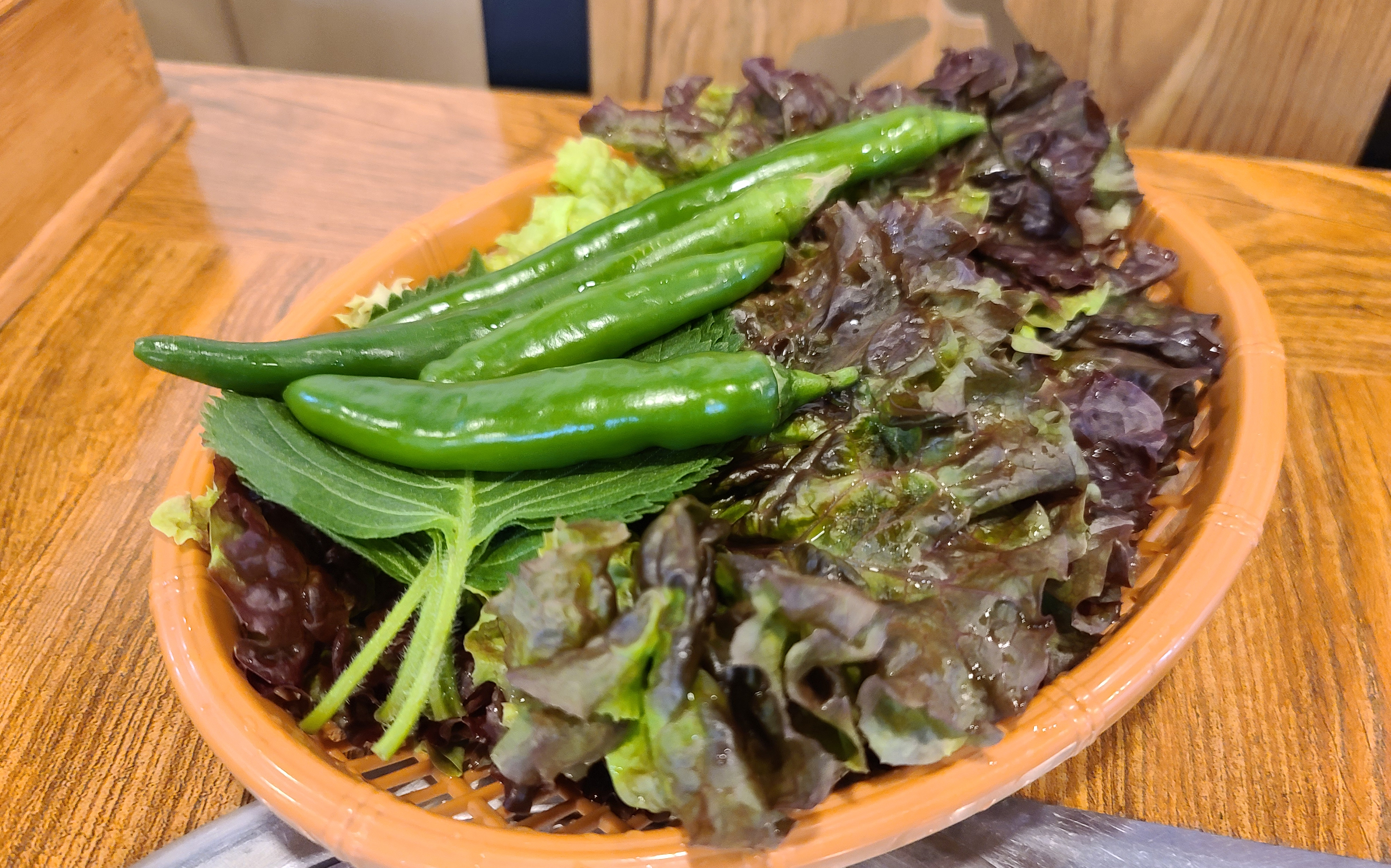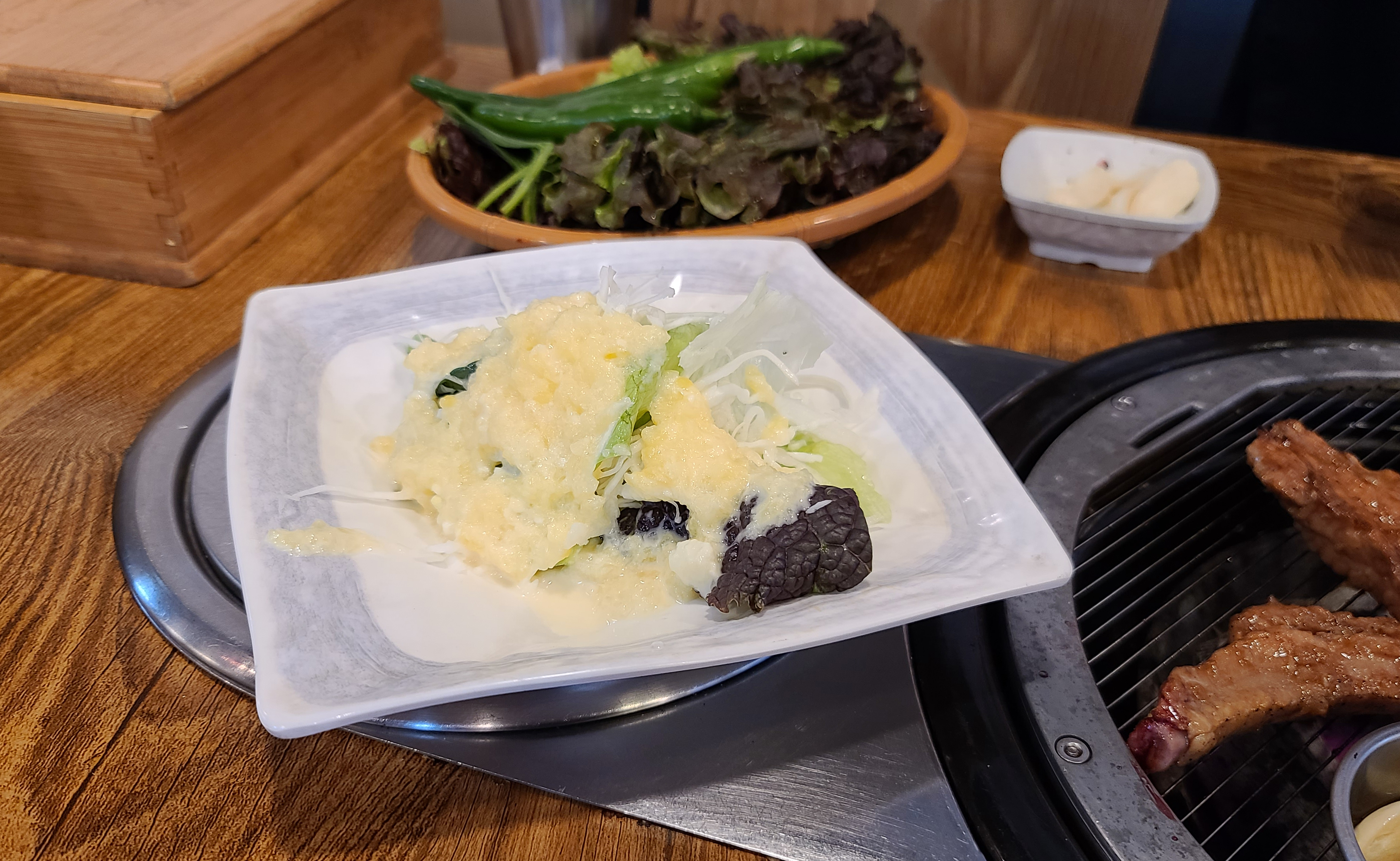 저희는 풍년참숯갈비의 양념갈비 2인분을 주문하였고, 곧이어 상차림이 준비되었습니다. 양파장아찌, 쌈채소, 쌈장, 샐러드, 명태채, 파절이, 도토리묵, 가게에서 직접 갓으로 담근 피클도 함께 제공되었습니다.