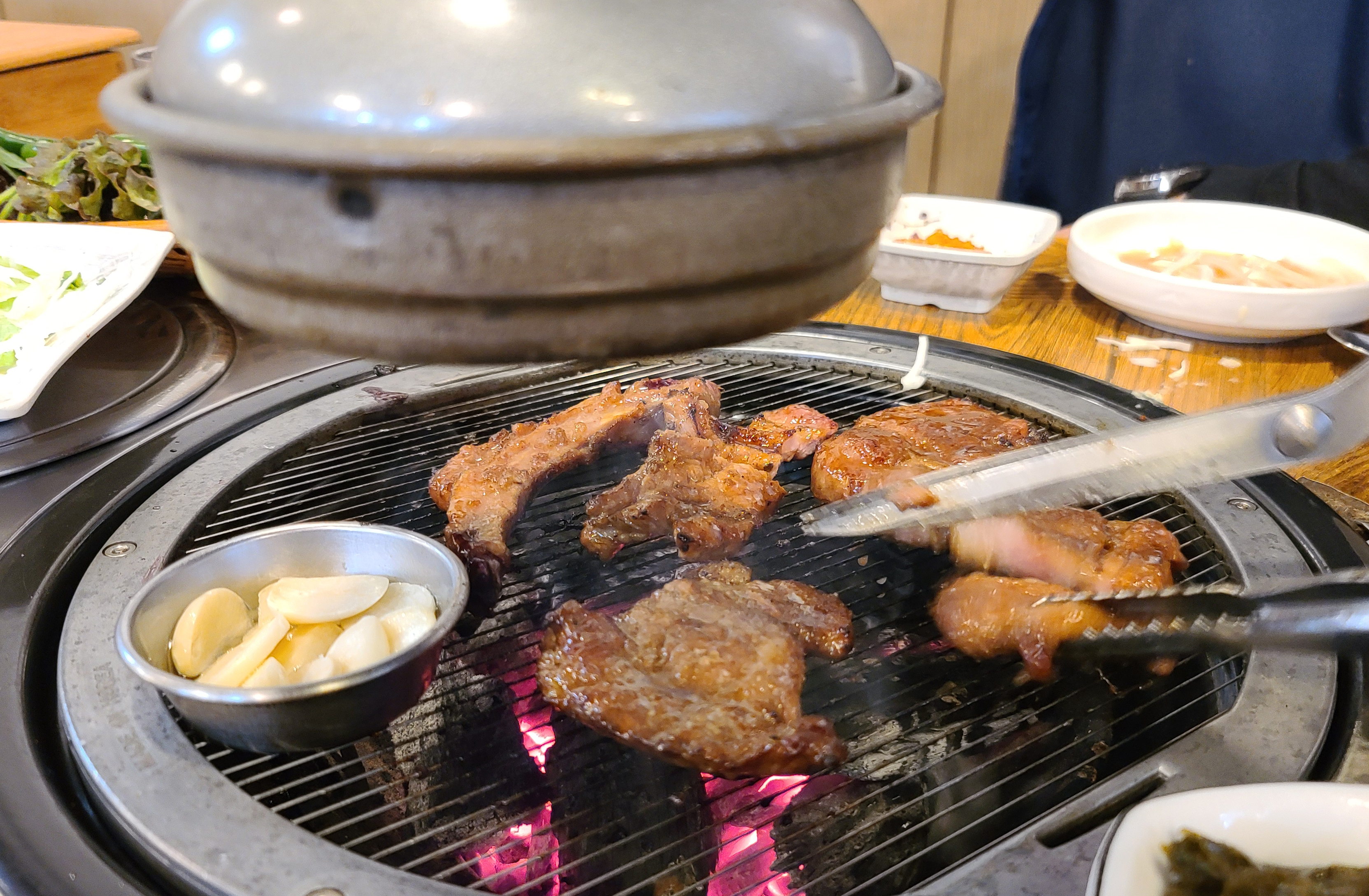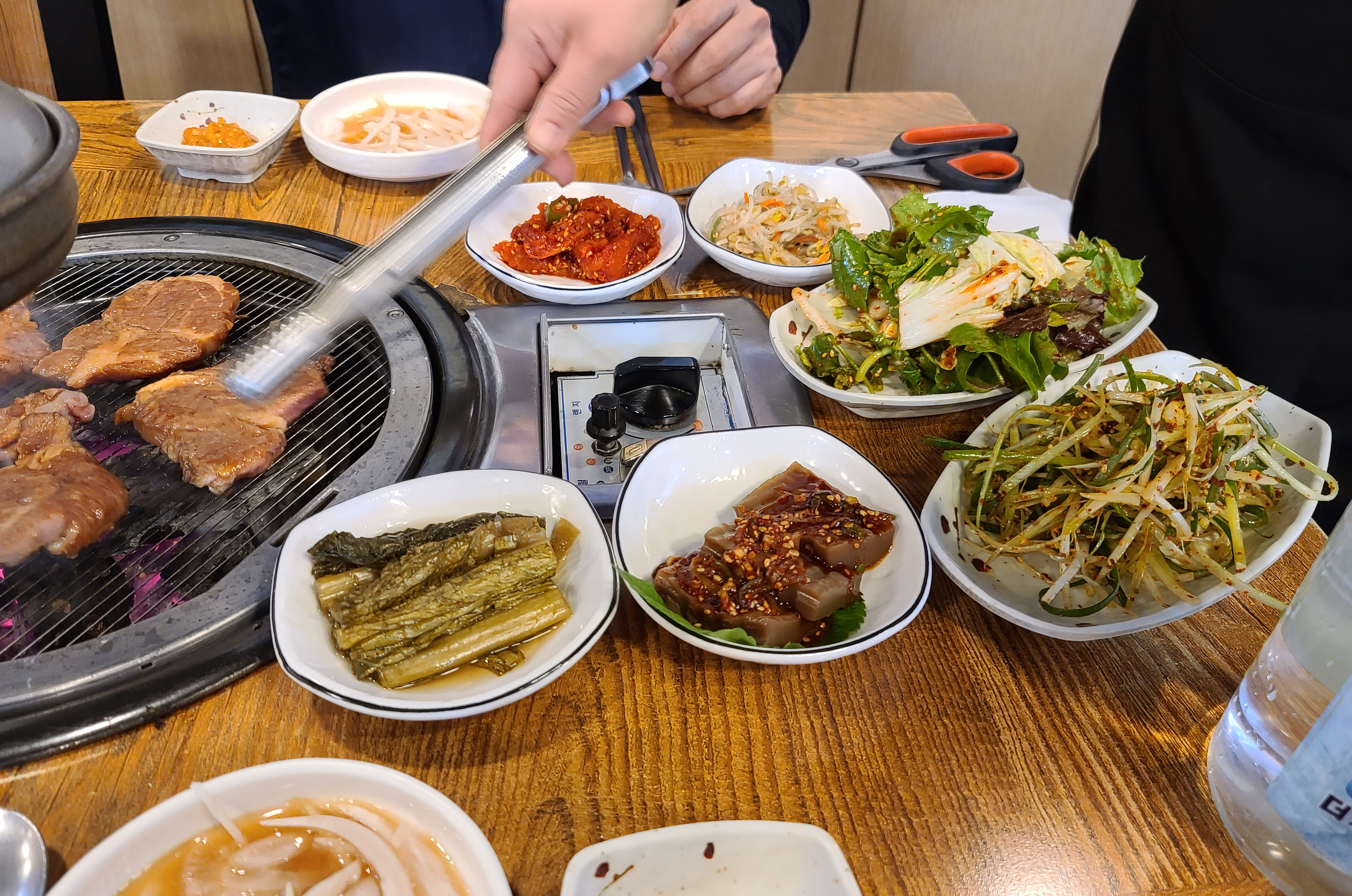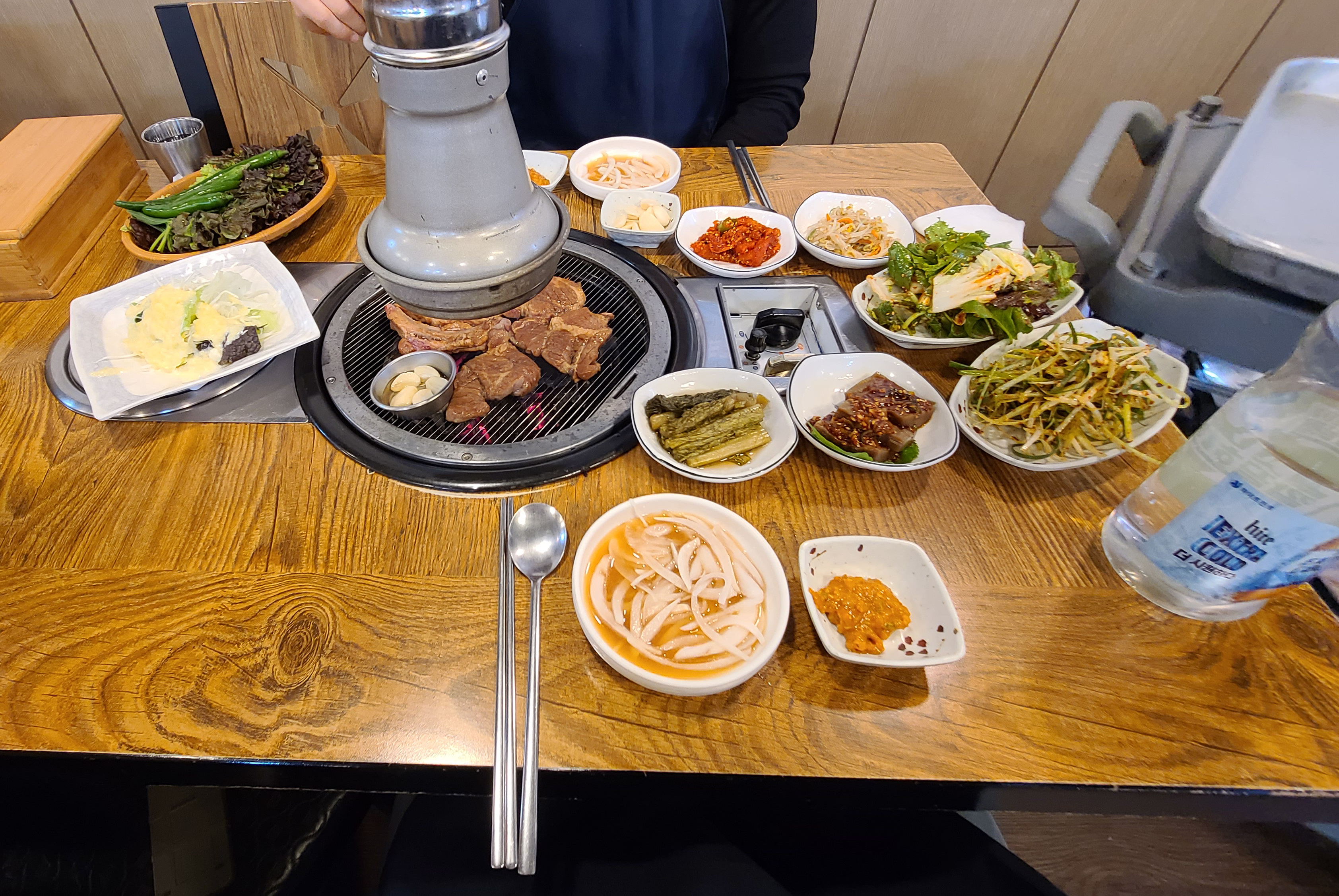 저희는 풍년참숯갈비의 양념갈비 2인분을 주문하였고, 곧이어 상차림이 준비되었습니다. 양파장아찌, 쌈채소, 쌈장, 샐러드, 명태채, 파절이, 도토리묵, 가게에서 직접 갓으로 담근 피클도 함께 제공되었습니다.