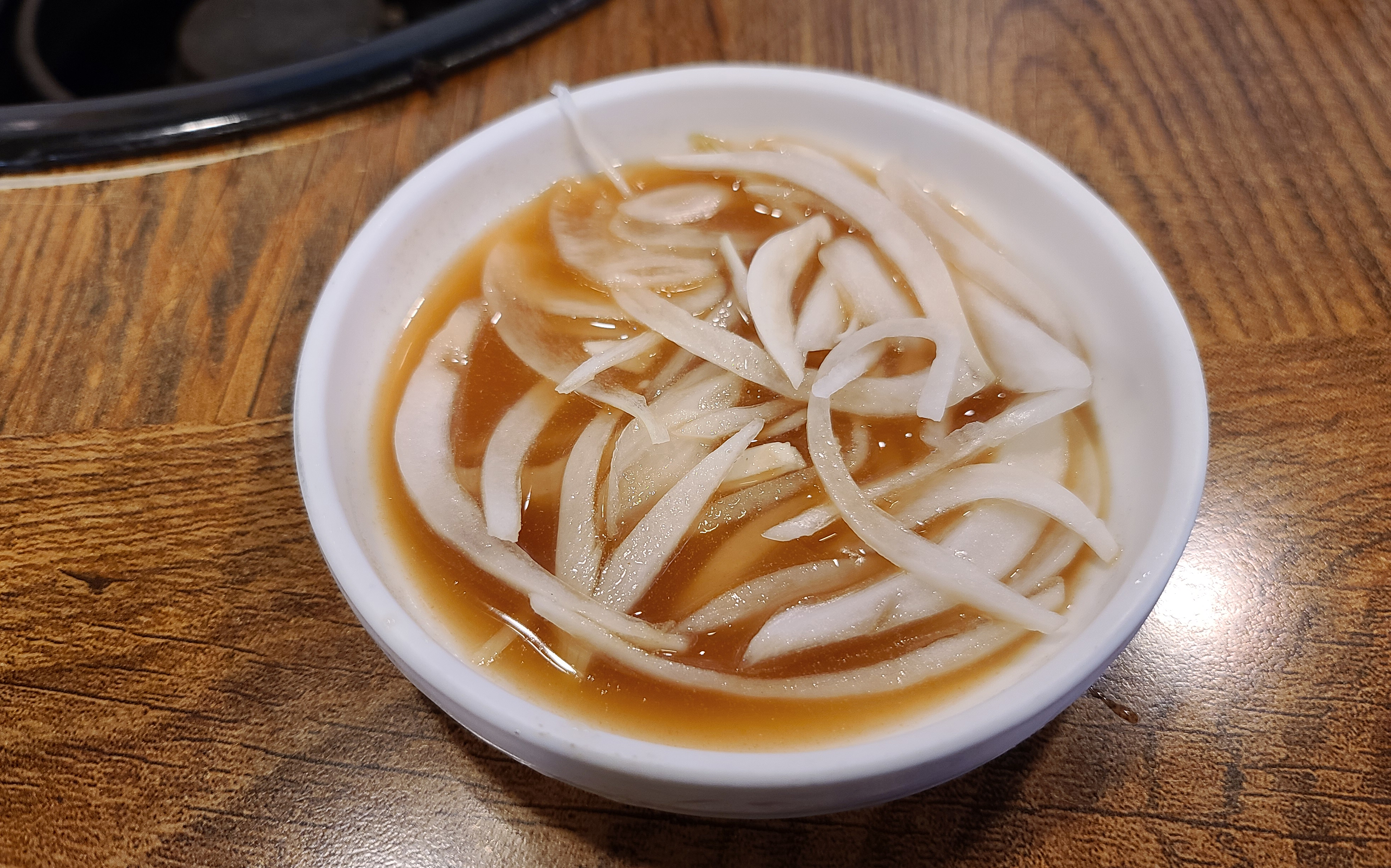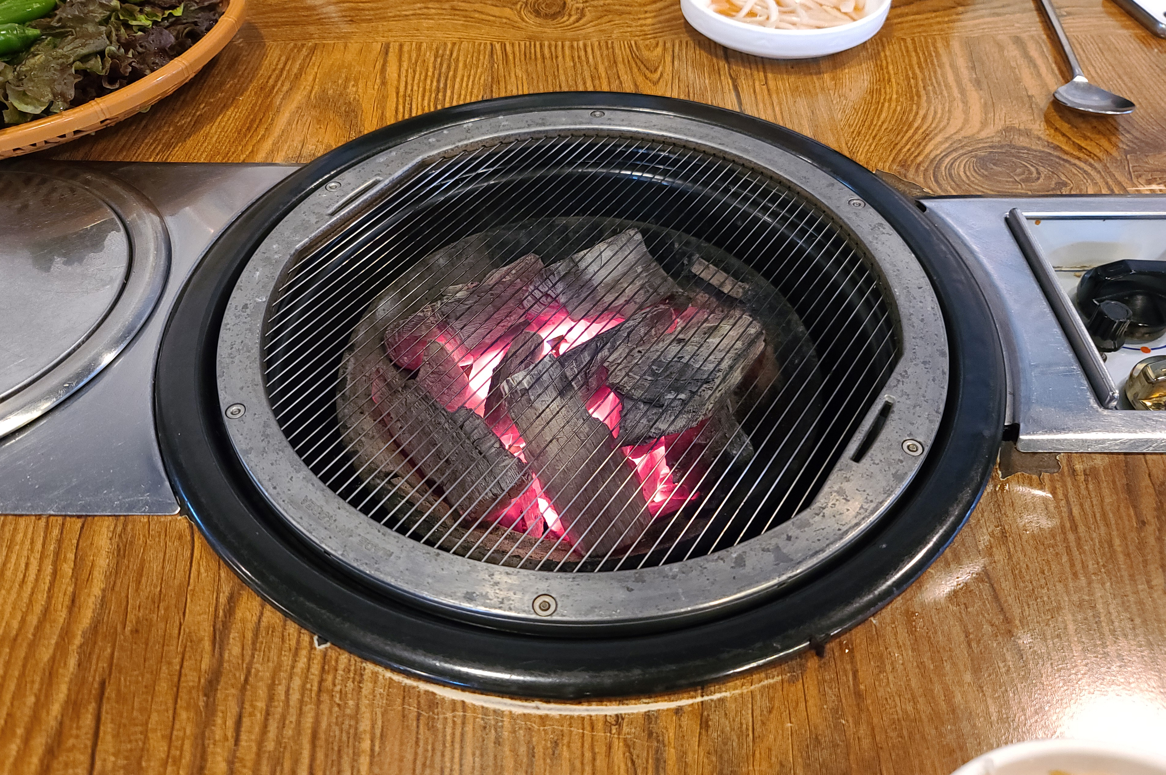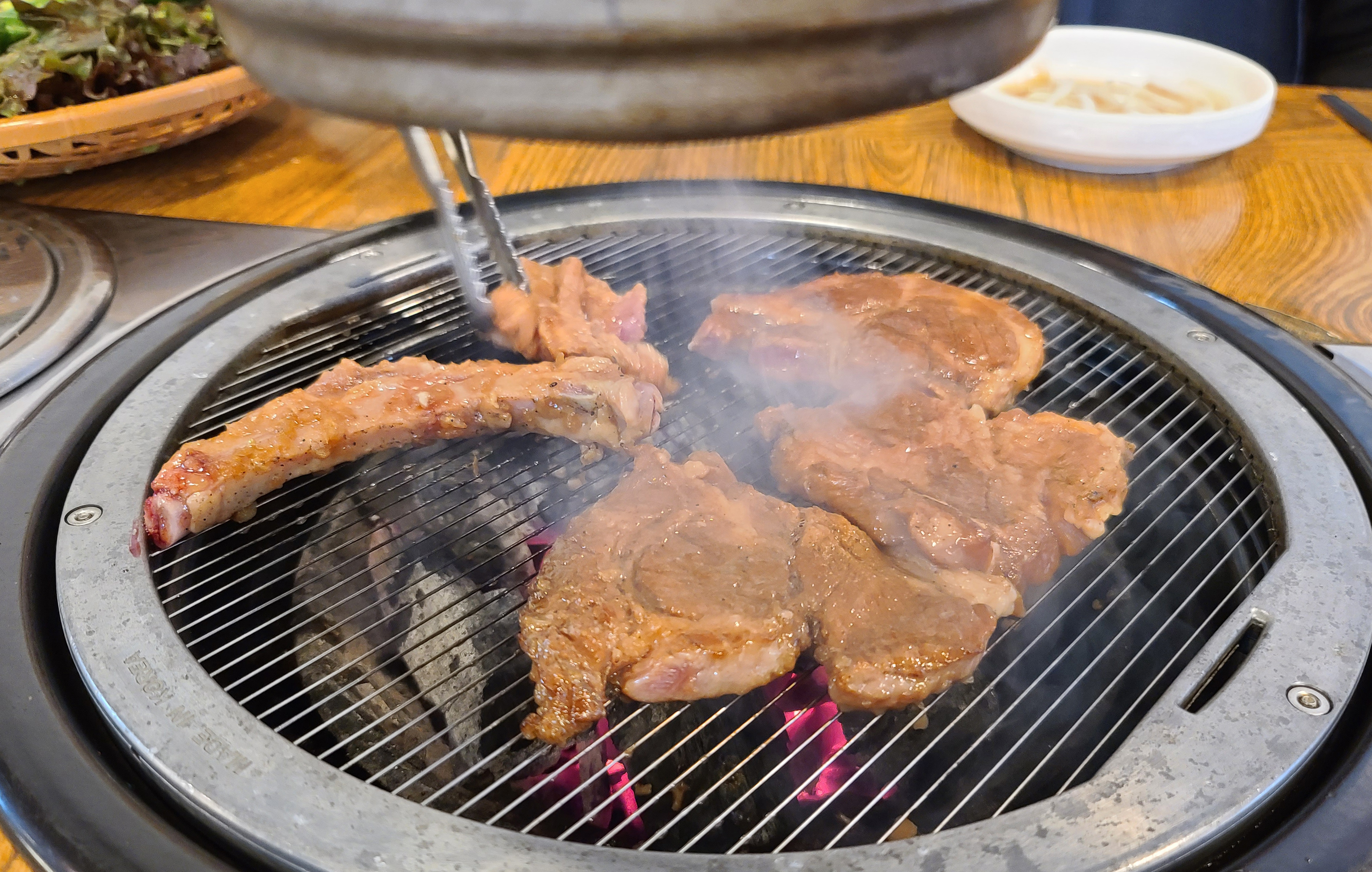 저희는 풍년참숯갈비의 양념갈비 2인분을 주문하였고, 곧이어 상차림이 준비되었습니다. 양파장아찌, 쌈채소, 쌈장, 샐러드, 명태채, 파절이, 도토리묵, 가게에서 직접 갓으로 담근 피클도 함께 제공되었습니다.