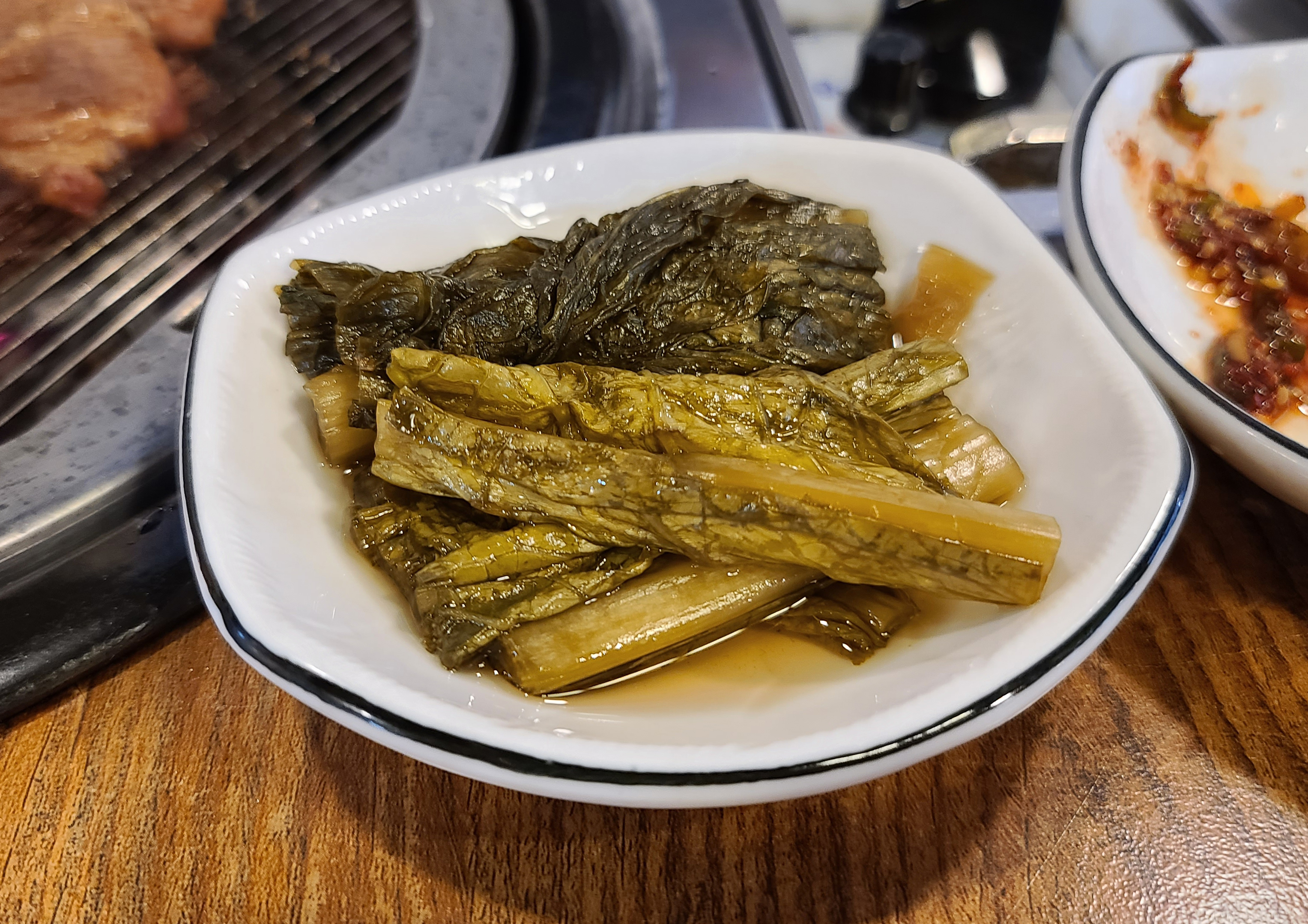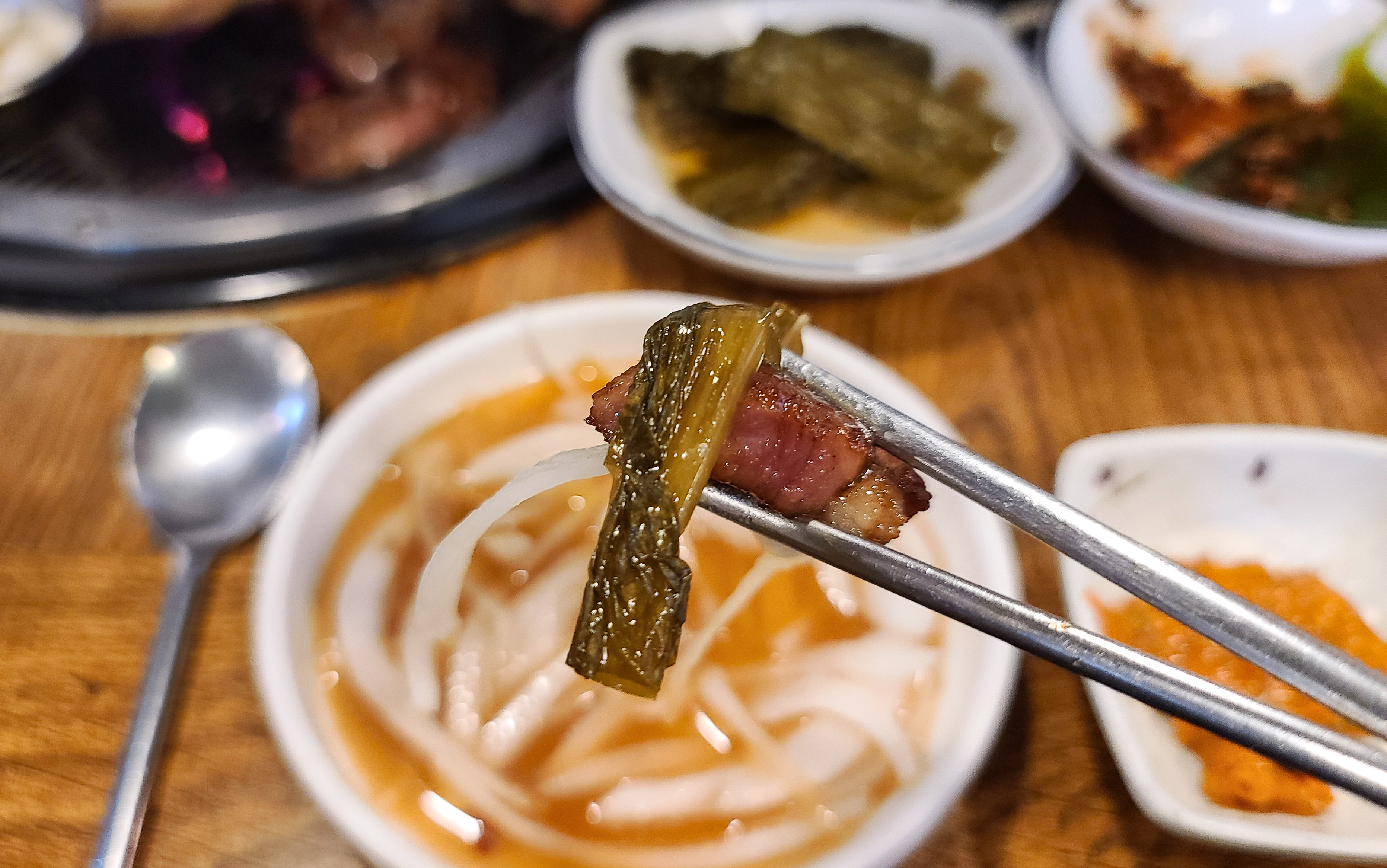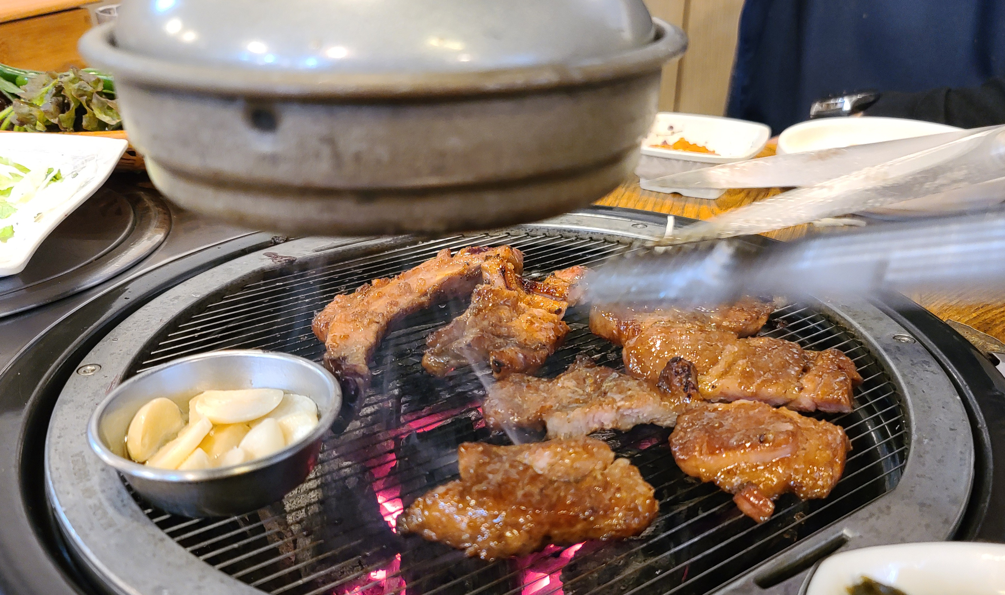 기다리던 갈비가 거의 다 익어갔습니다. 사장님께서 직점 만드신 달달한 갈비 양념에 숯불향이 은은하게 배어 맛이 있는 돼지갈비가 완성되었고요. 돼지갈비는 직접 갓으로 만 듯 피클과 곁들여 먹으면 더욱 깔끔한 맛을 느낄 수 있었습니다.