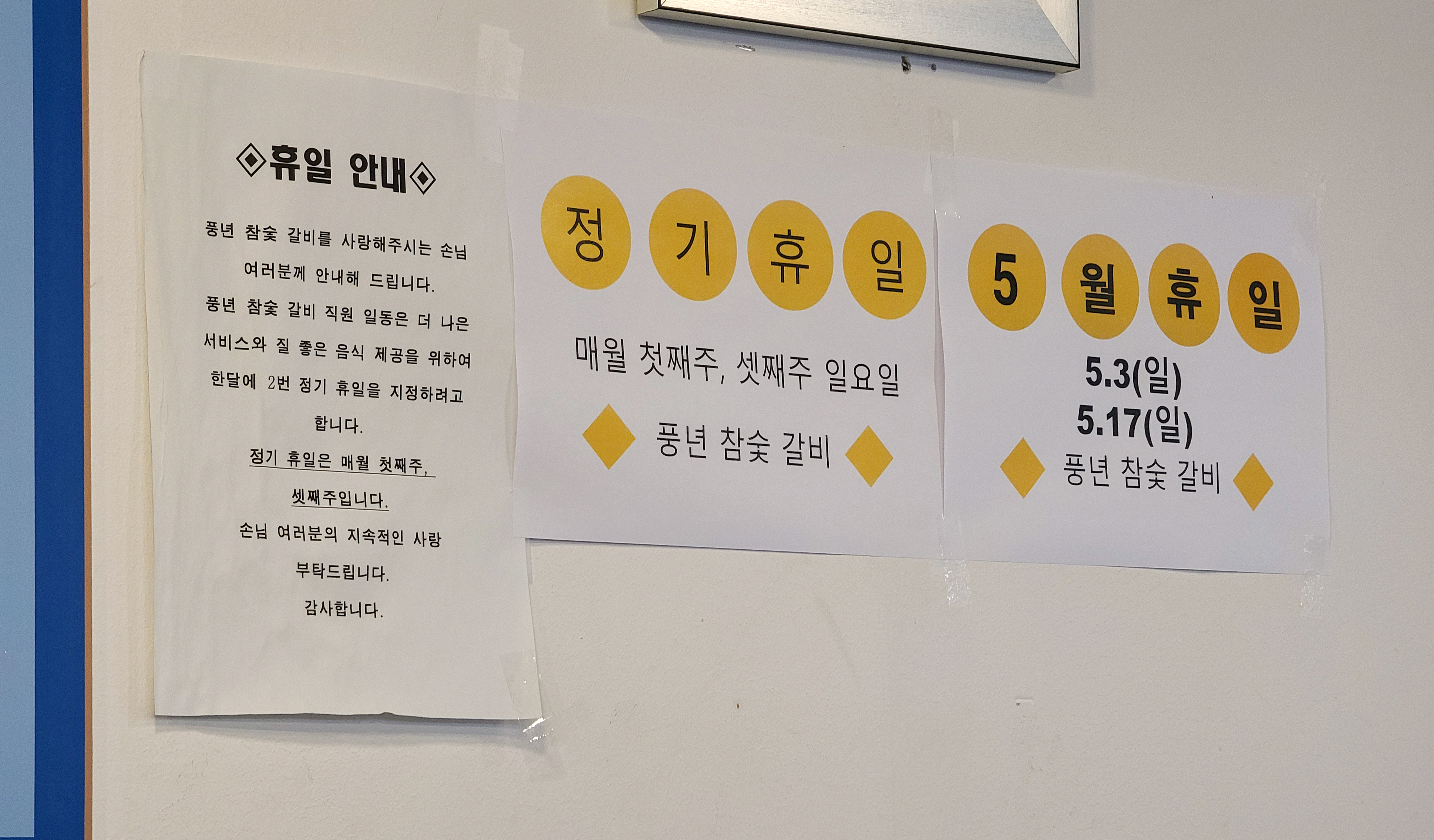 풍년참숯갈비 가게의 모습은 위와 같습니다. 노란색으로 된 가게의 간판이 눈에 들어오며, 가게 앞에는 차량 2대 정도 주차할 수 있는 공간이 있었습니다. 저희는 주차할 수 있는 공간의 여부를 몰라 인근에 주차를 하고 가게에 방문하였습니다.