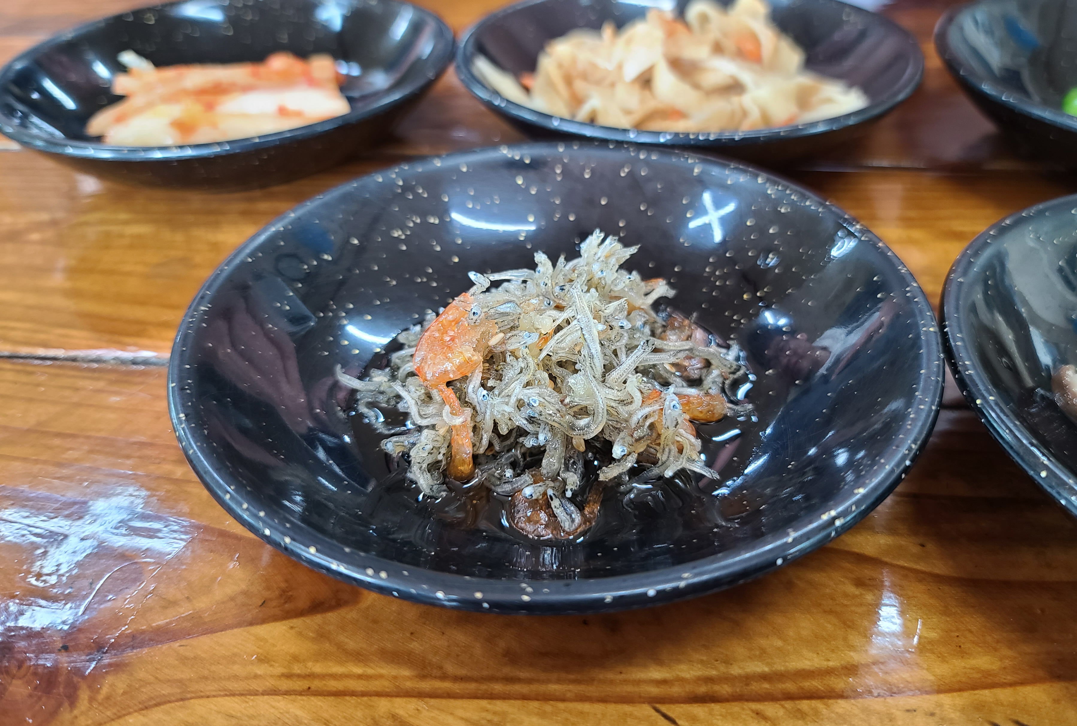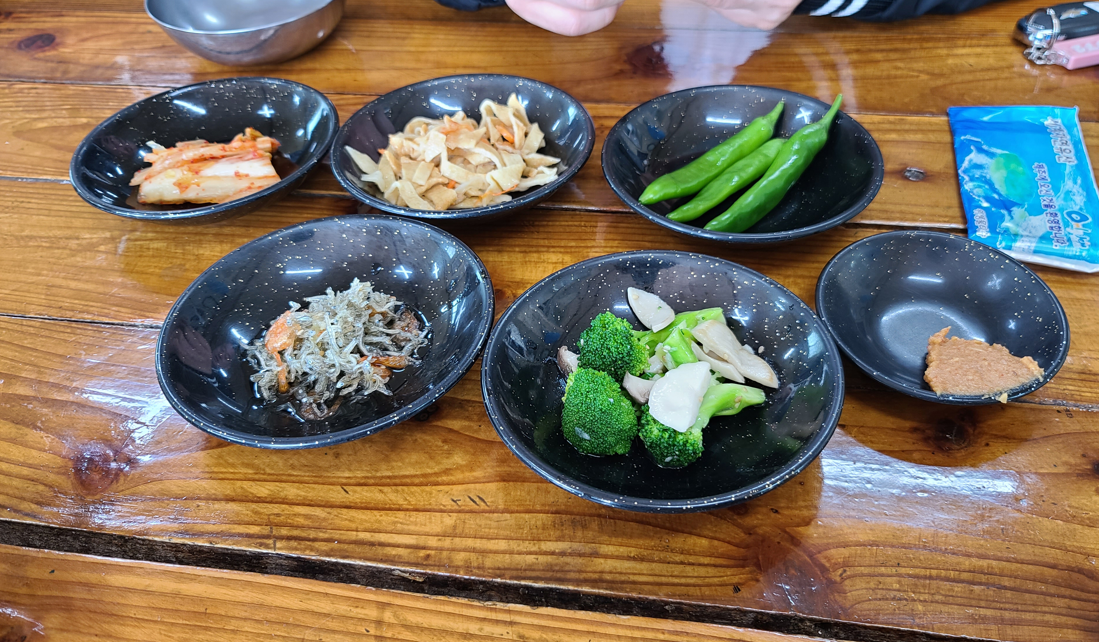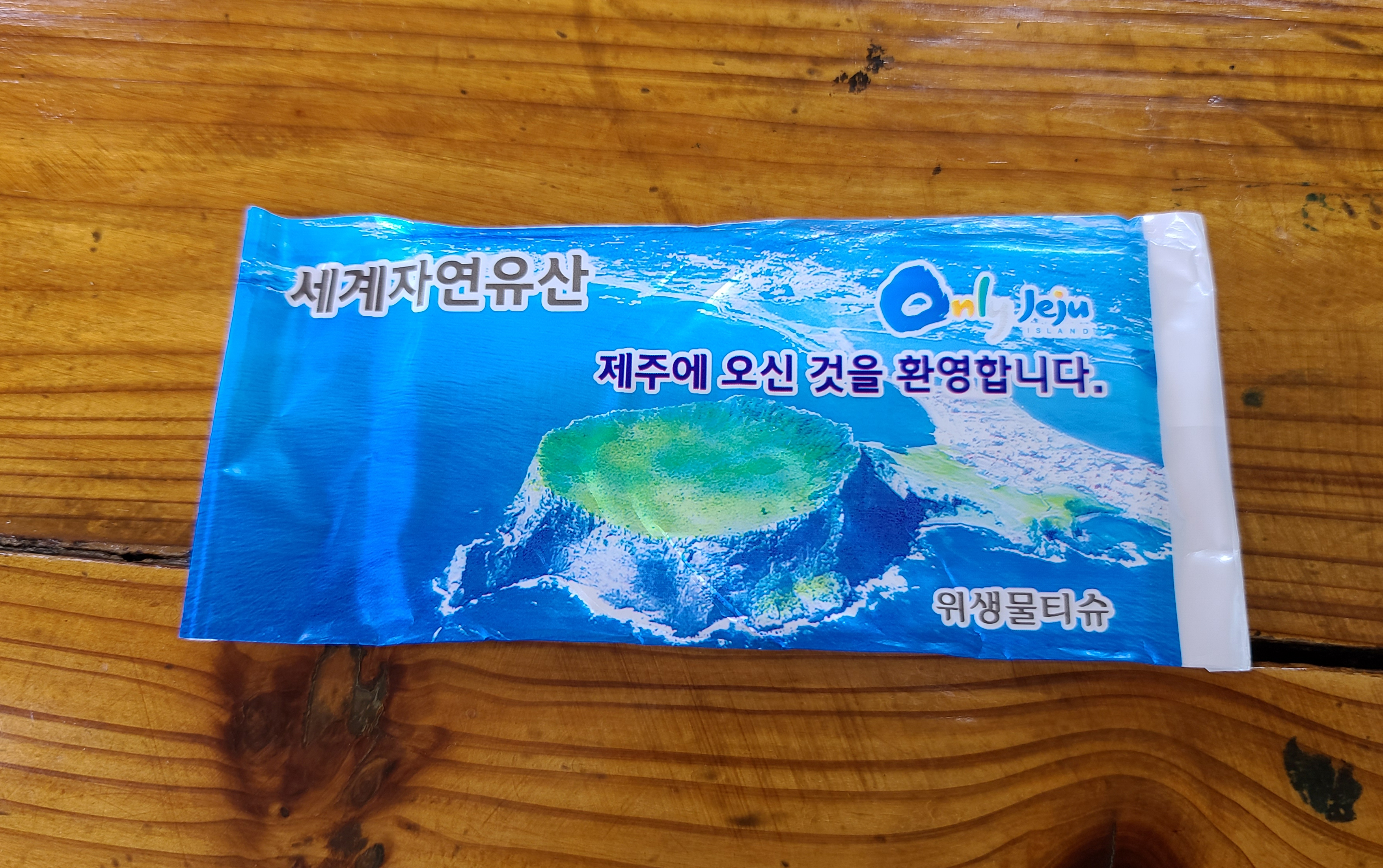 식당에서는 제주도 성산일출봉이 인쇄되어있는 물티슈가 제공되었고, 밑반찬으로는 배추김치, 어묵볶음, 고추, 멸치볶음, 브로콜리, 쌈장이 나왔습니다. 부족한 반찬은 직접 가져다 먹을 수 있는 셀프바도 마련되어 있었습니다.