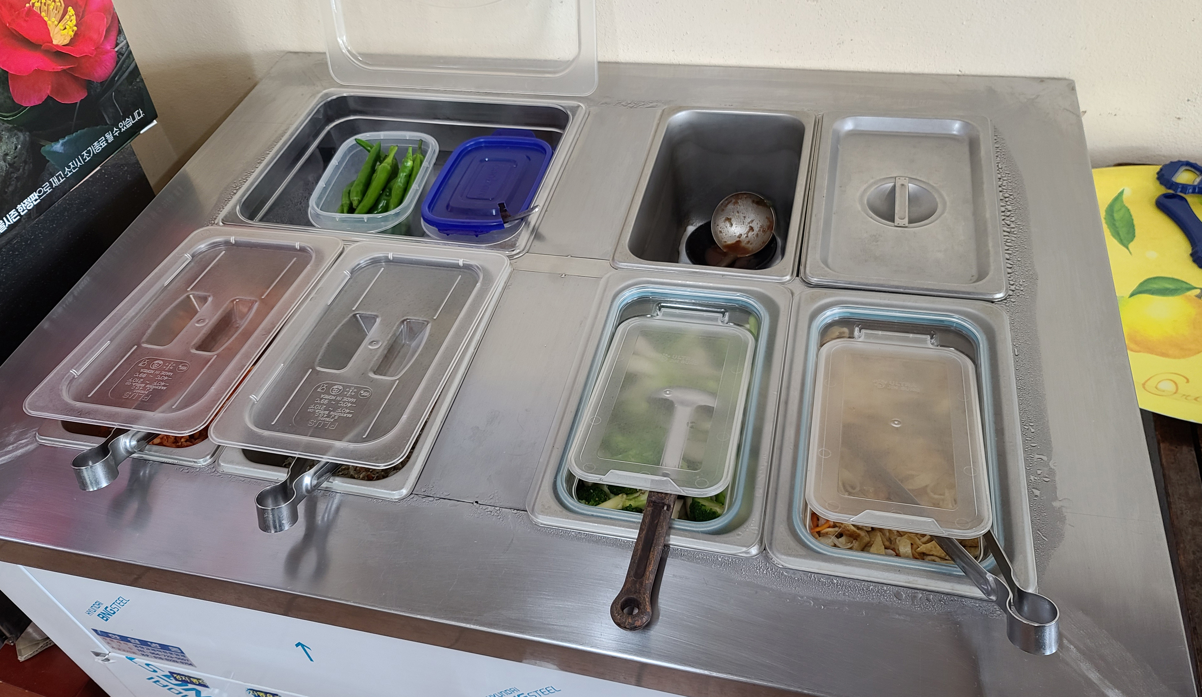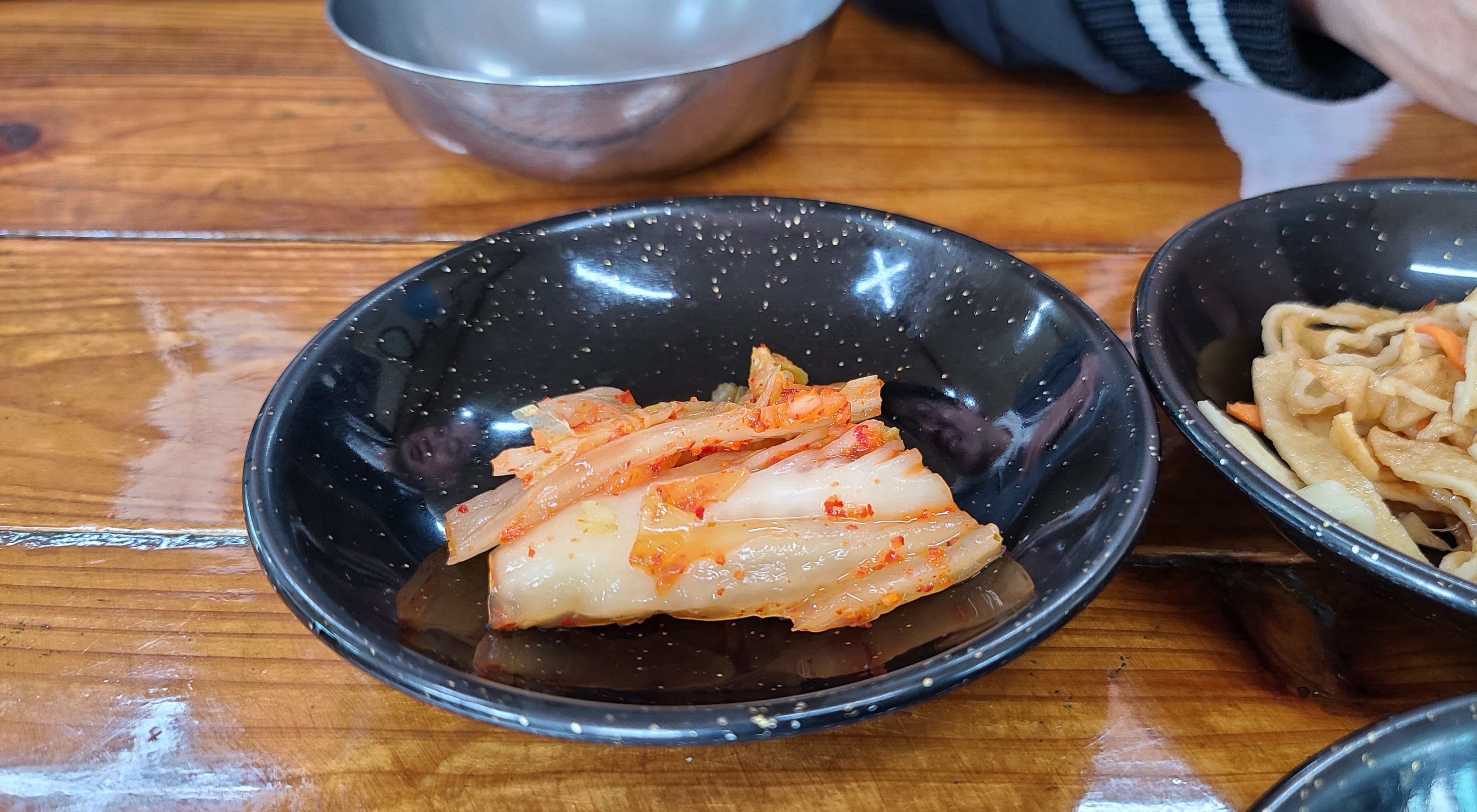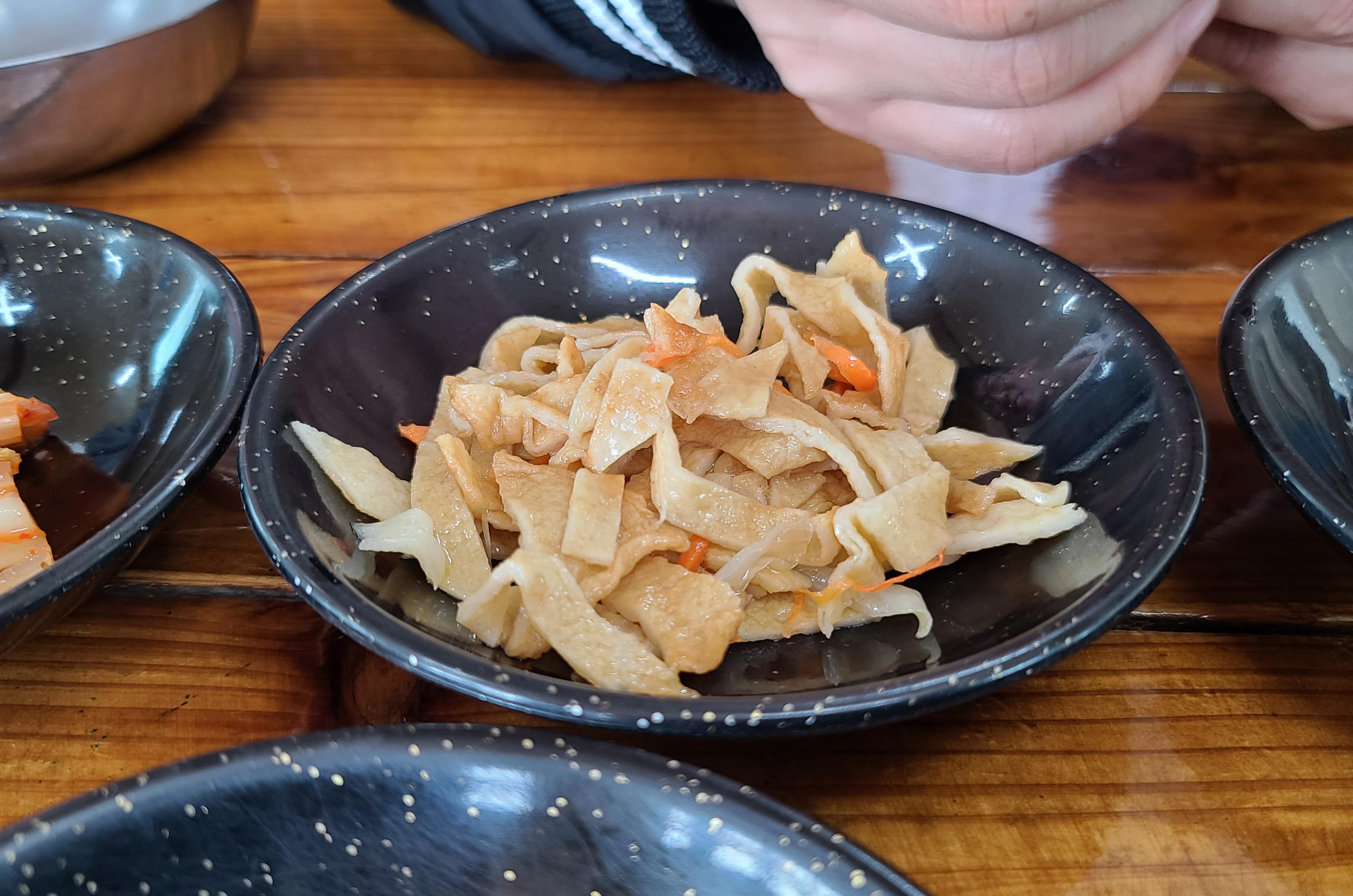 식당에서는 제주도 성산일출봉이 인쇄되어있는 물티슈가 제공되었고, 밑반찬으로는 배추김치, 어묵볶음, 고추, 멸치볶음, 브로콜리, 쌈장이 나왔습니다. 부족한 반찬은 직접 가져다 먹을 수 있는 셀프바도 마련되어 있었습니다.