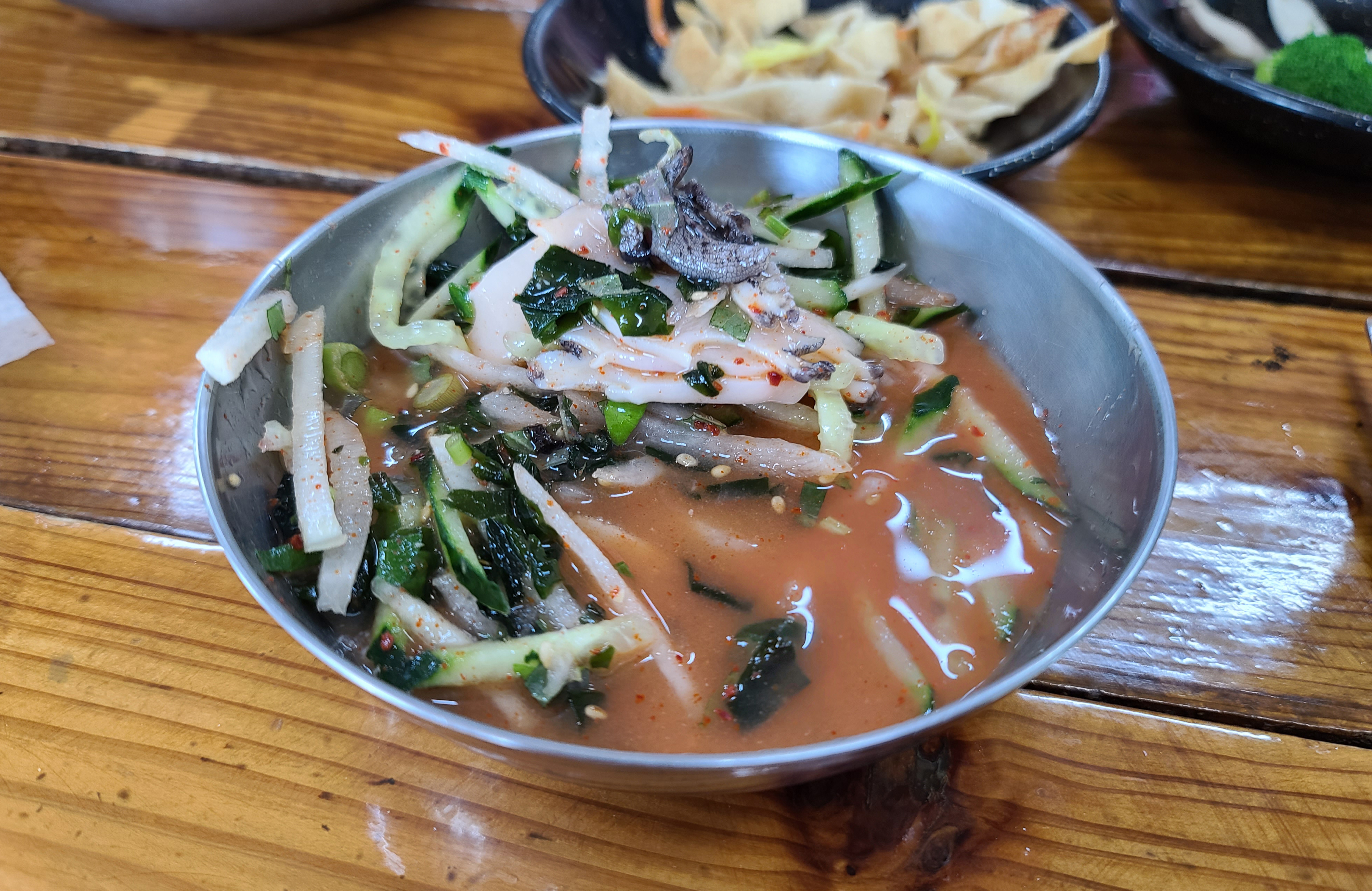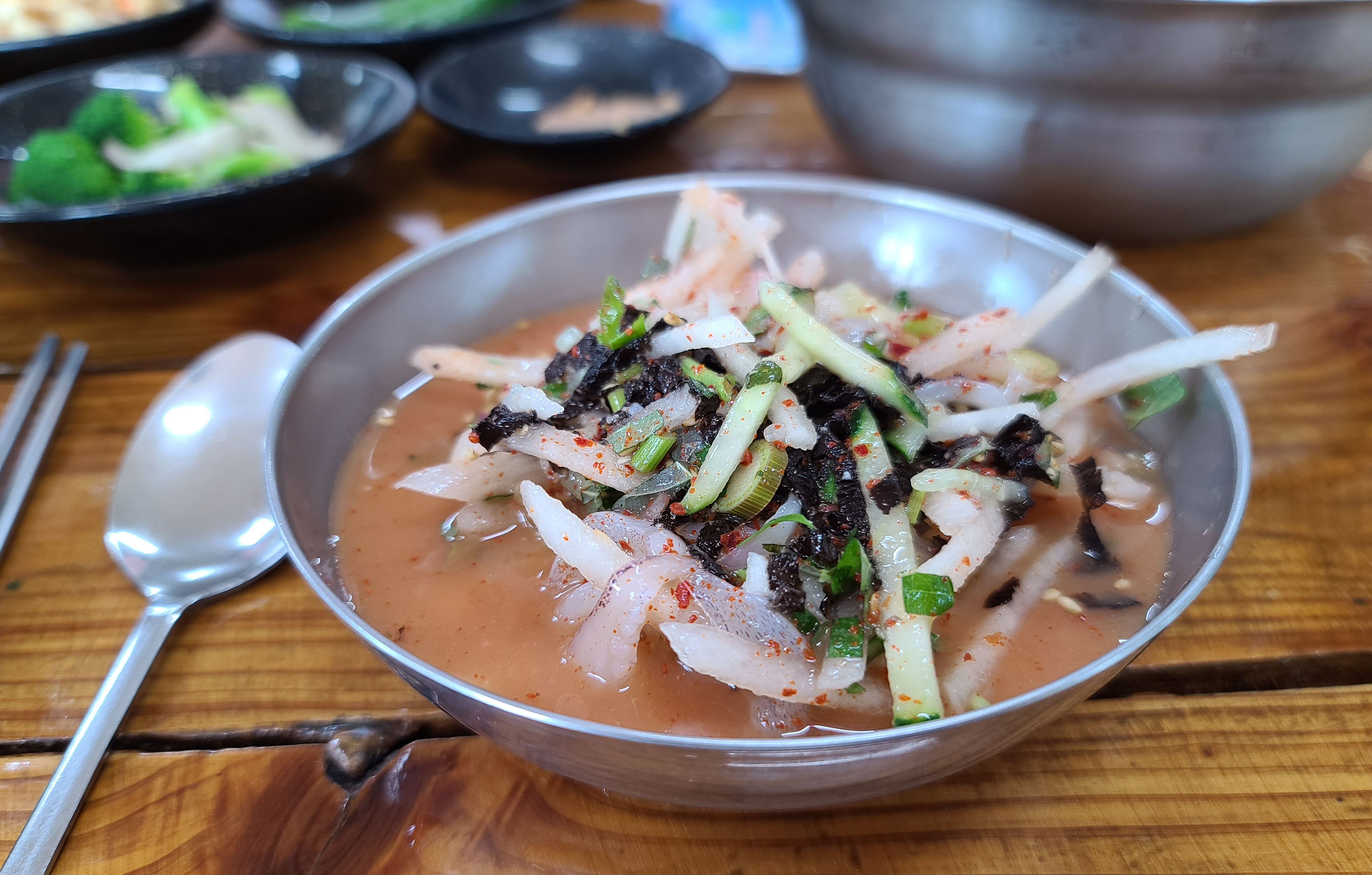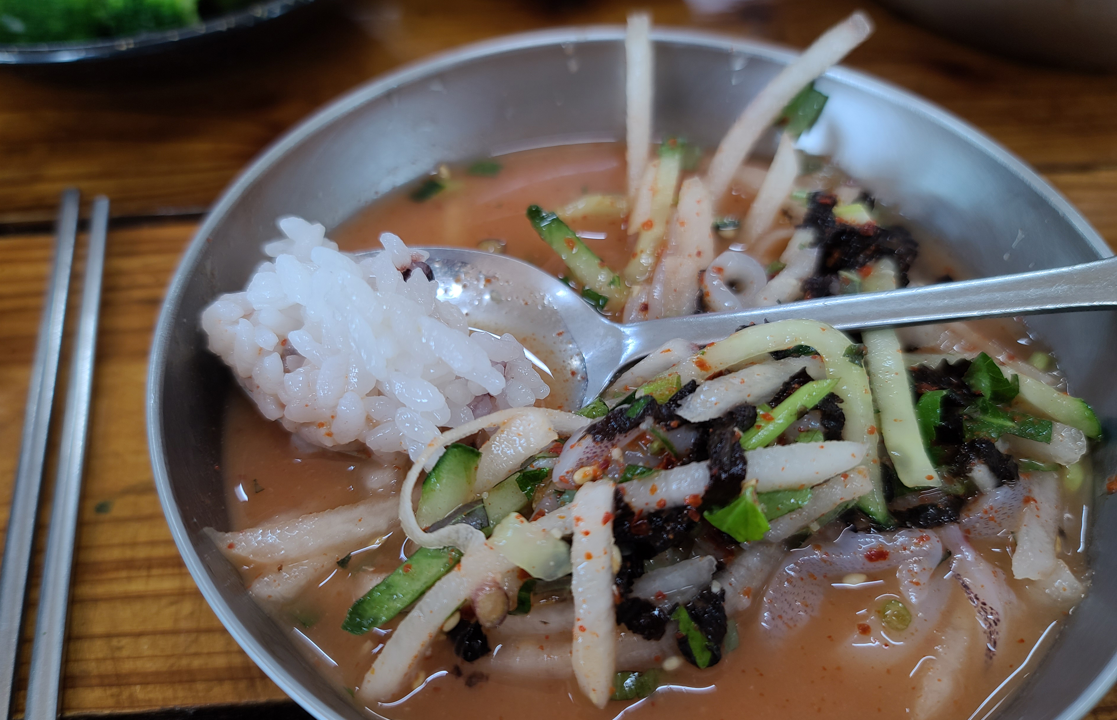 먼저 공천포식당의 한치물회부터 맛을 보았습니다. 제가 오이를 좋아하지는 않지만, 물회의 시원함을 위해 오이를 곁들여 먹었습니다. 한치물회는 중간중간 한치의 쫄깃한 식감이 더해져 씹는 맛이 있었습니다.