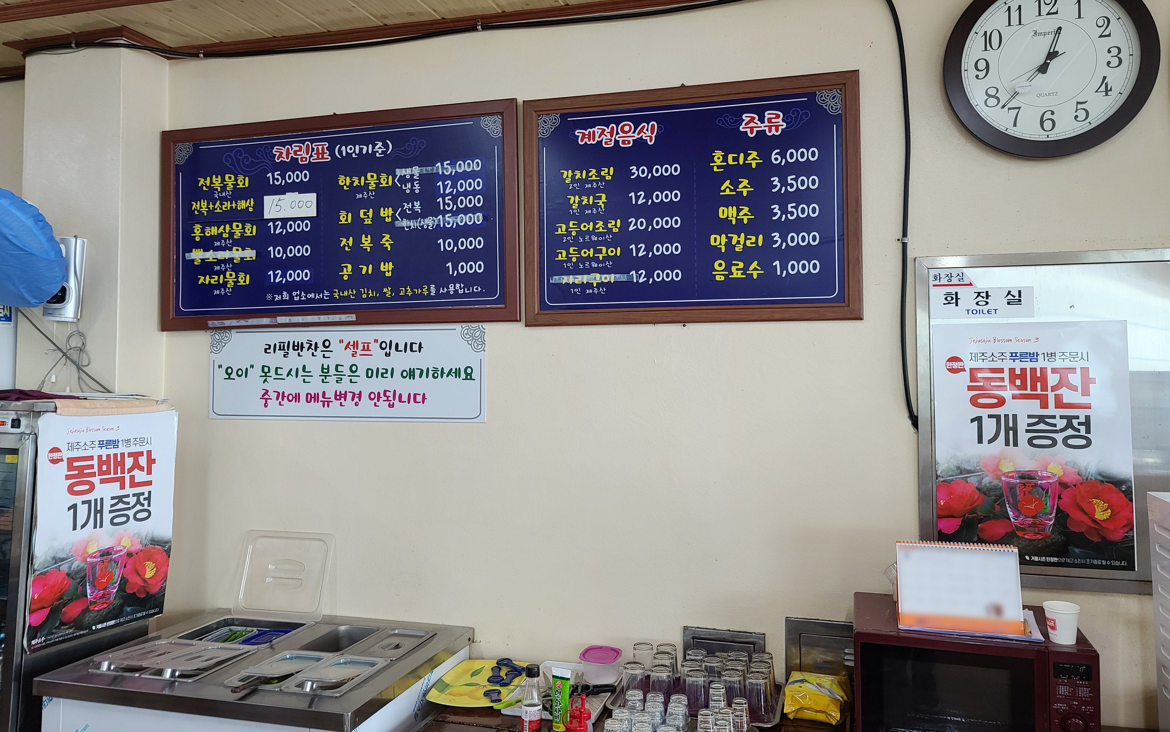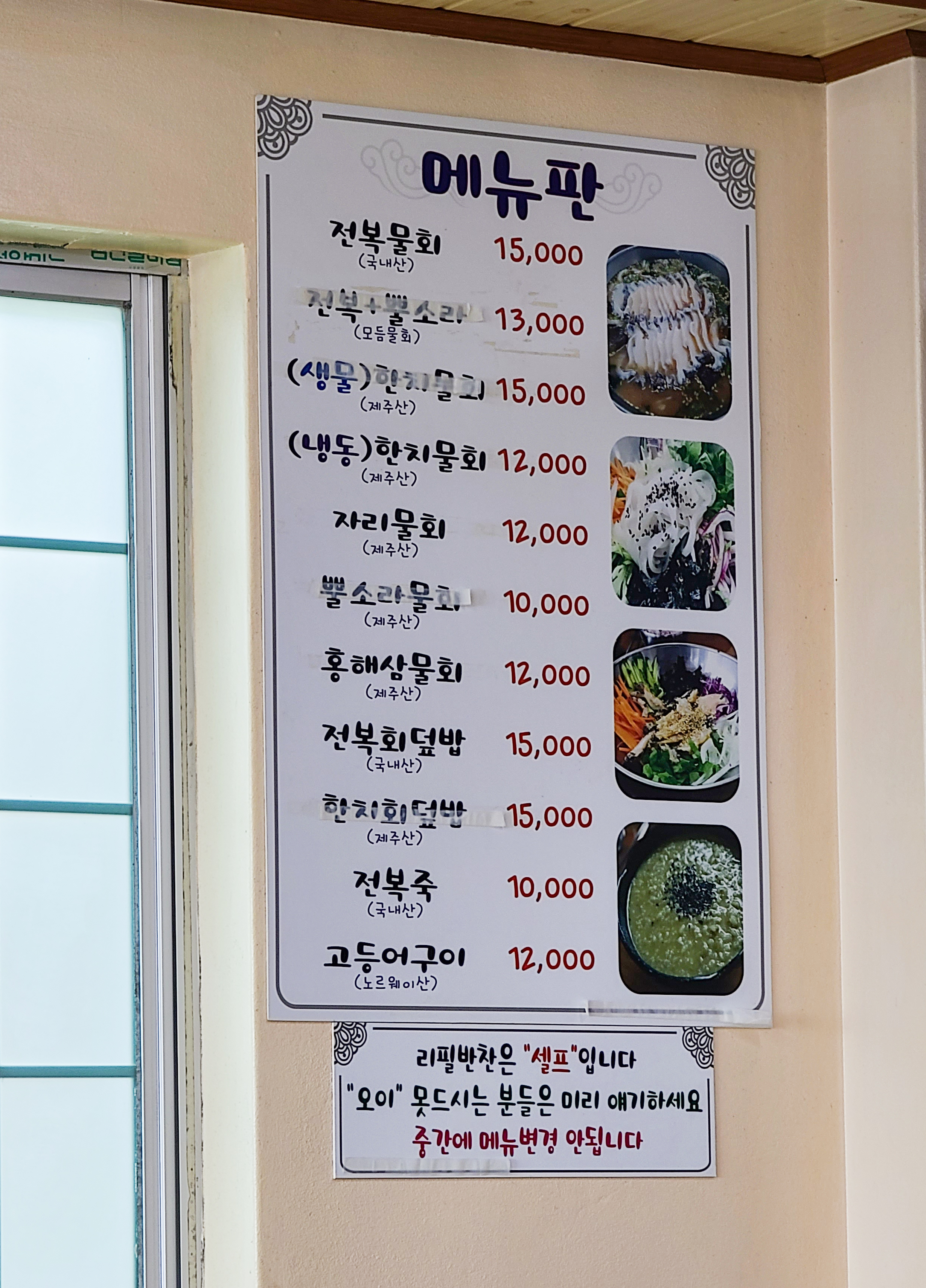 공천포식당 가게 내부에도 메뉴가 곳곳에 붙어 있었는데, 제주 공천포식당 메뉴는 다음과 같습니다. 전복물회, 전복+소라+해삼, 홍해삼물회, 자리물회, 한치물회, 회덮밥, 전복죽, 갈치조림, 갈치국, 고등어조림, 고등어구이 등이 있었습니다.