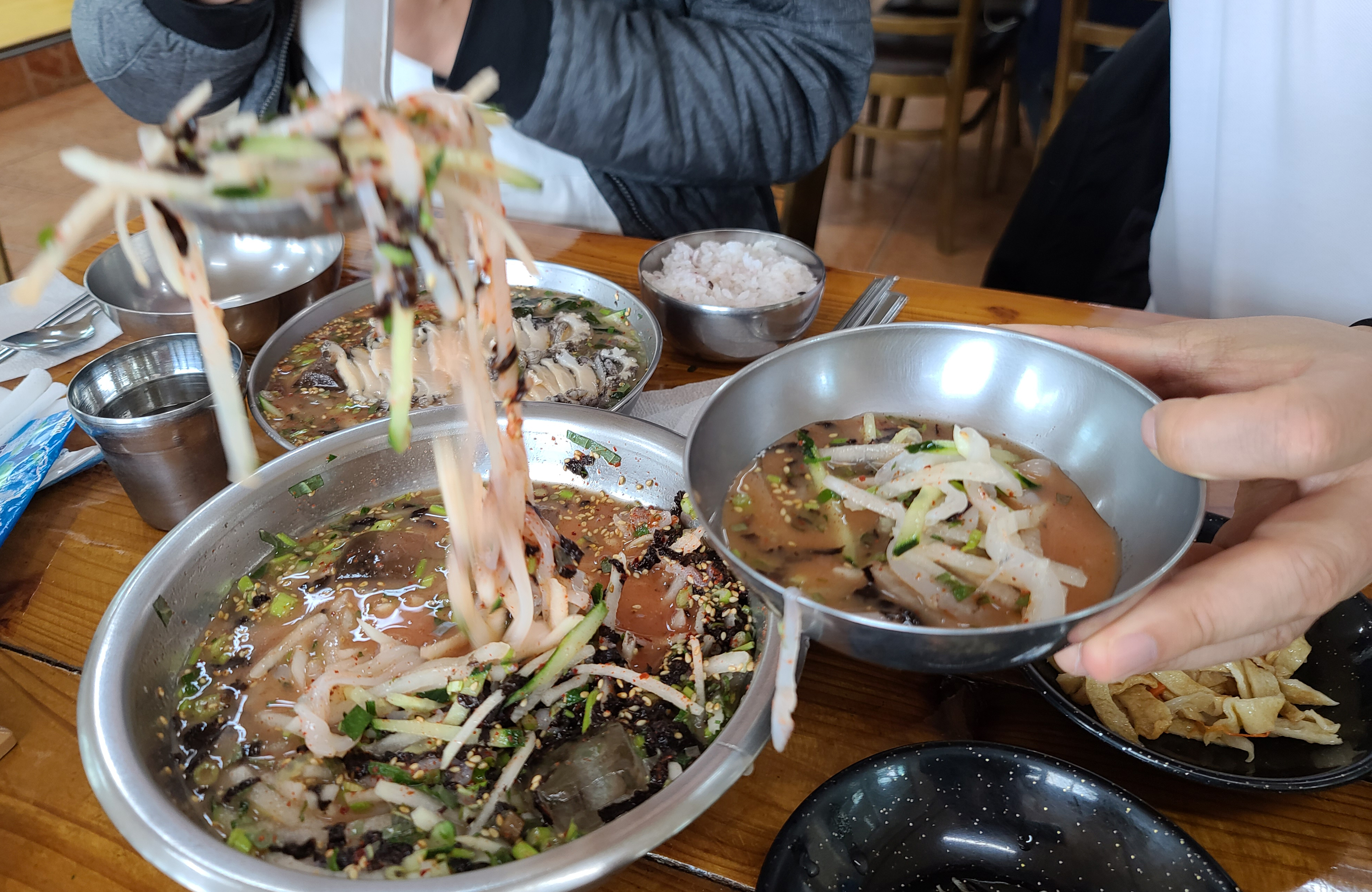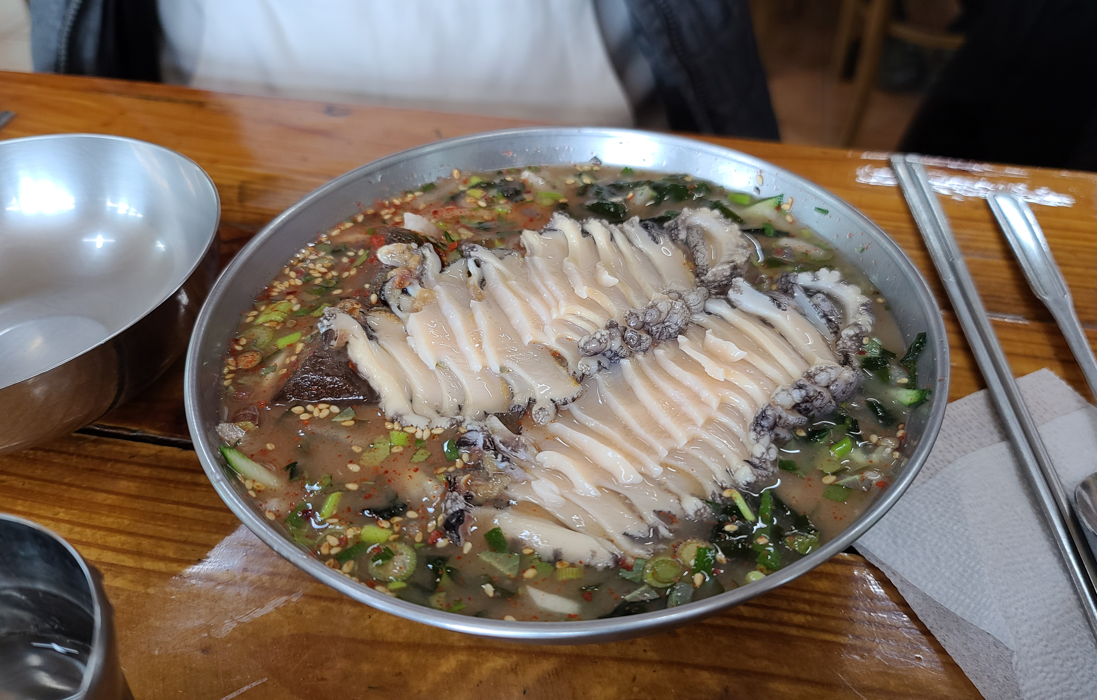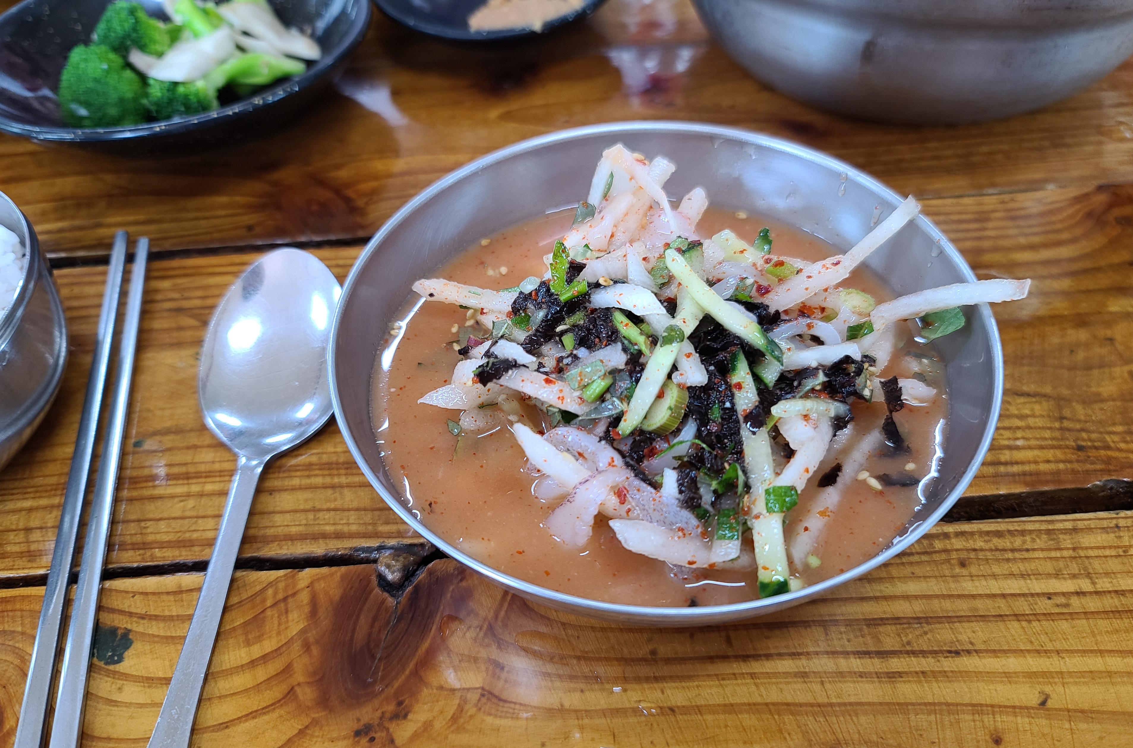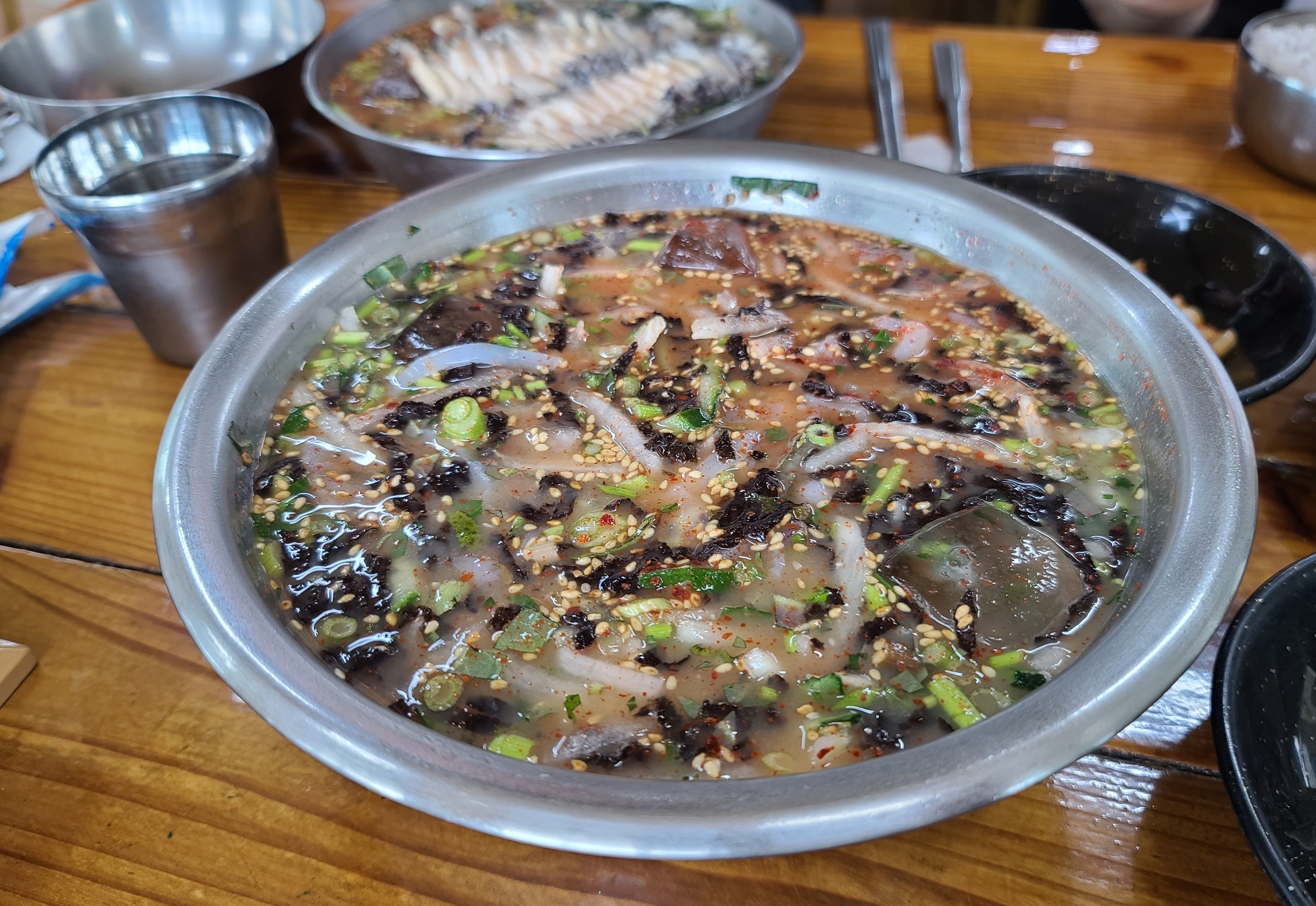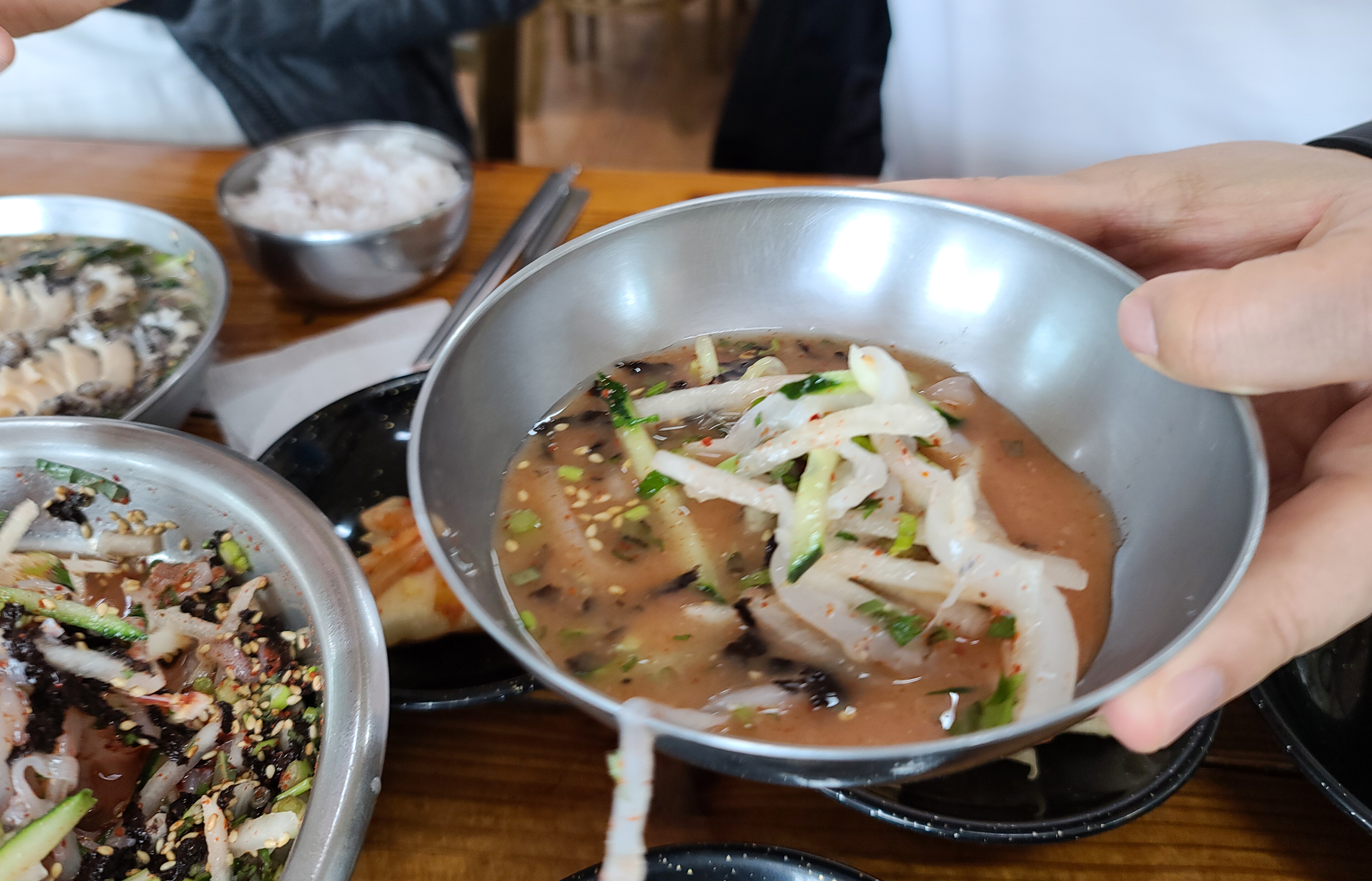 먼저 공천포식당의 한치물회부터 맛을 보았습니다. 제가 오이를 좋아하지는 않지만, 물회의 시원함을 위해 오이를 곁들여 먹었습니다. 한치물회는 중간중간 한치의 쫄깃한 식감이 더해져 씹는 맛이 있었습니다.