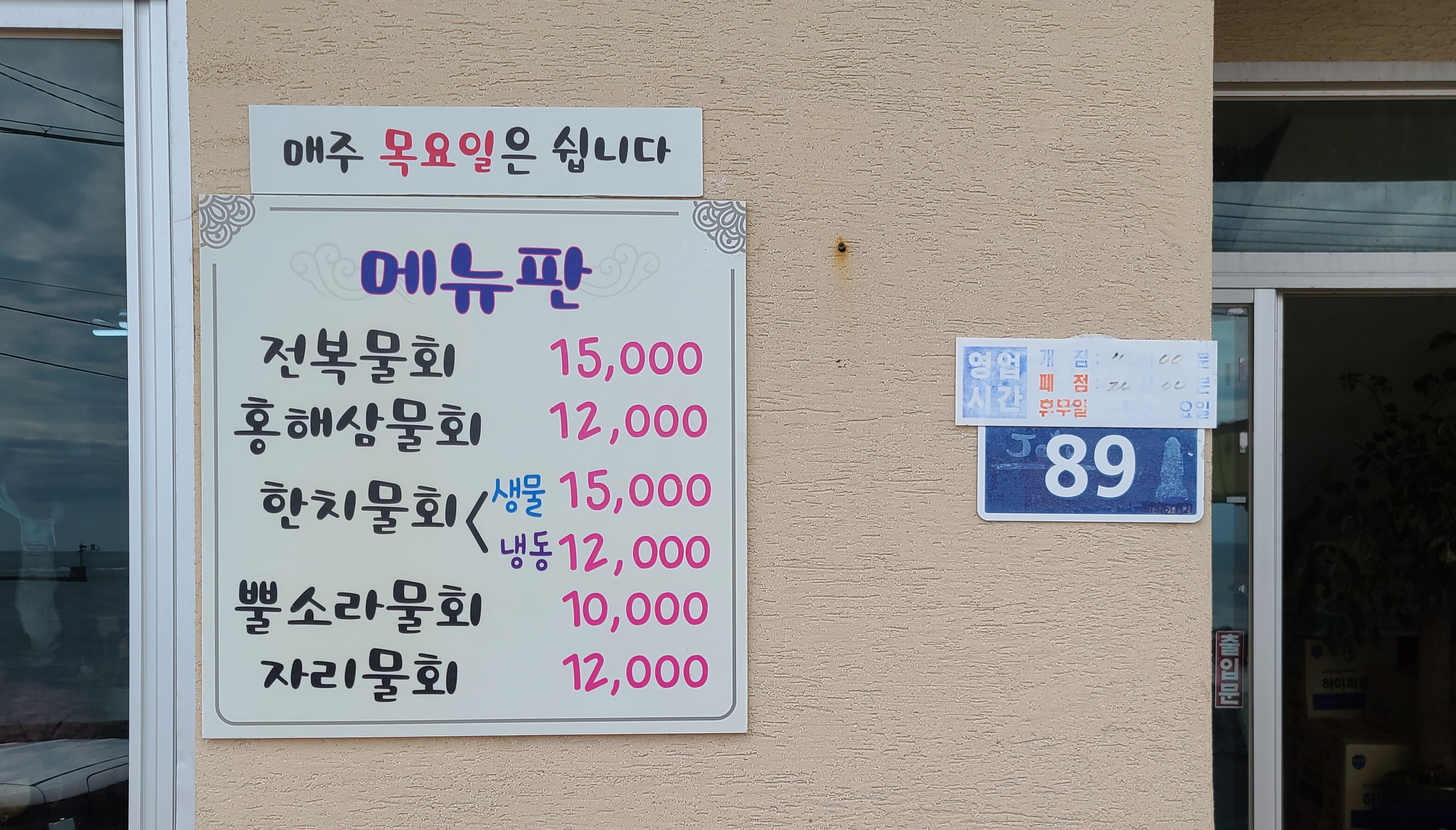 물론 물회 국물에 밥을 말아서도 먹을 수 있었고요, 전복물회의 경우에는 한치보다 조금 더 단단한 식감이 있었습니다. 한치나 전복 모두 신선한 재료를 사용하여 그런지 맛있게 먹을 수 있었고, 사장님은 자리물회도 추천해주시는 것 같더라고요. 나중에는 다른 메뉴로도 도전을 해봐야겠습니다.