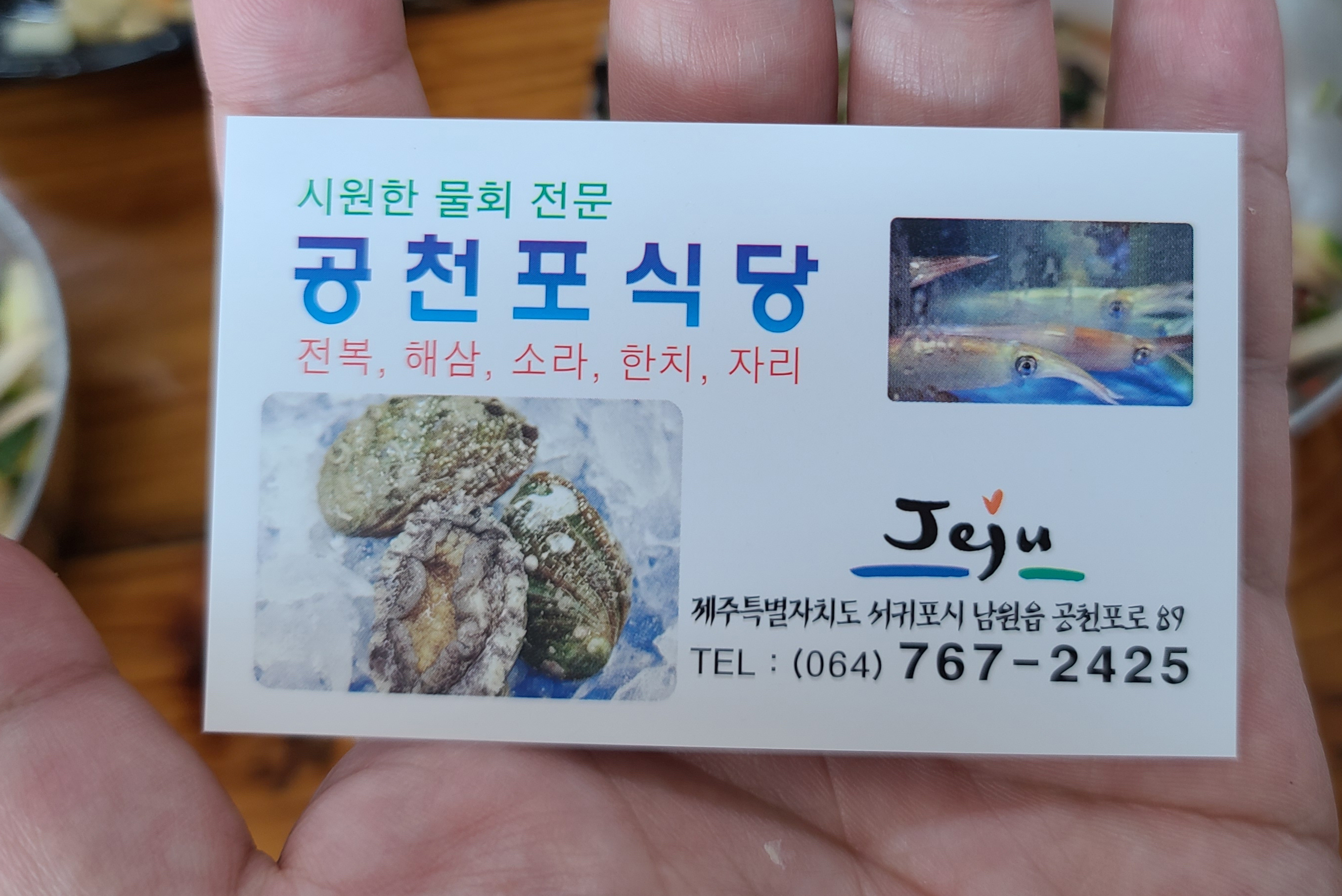 제주 현지인 추천 물회 맛집 공천포식당의 명함은 위와 같고요, 제주 여행을 하시는 분들을 위해 위 주소와 전화번호로 가게 이용 전 가게의 영업 여부를 확인하시고 방문하시면, 헛걸음하지 않으실 테니 이용에 참고하시면 도움되실 것 같습니다.