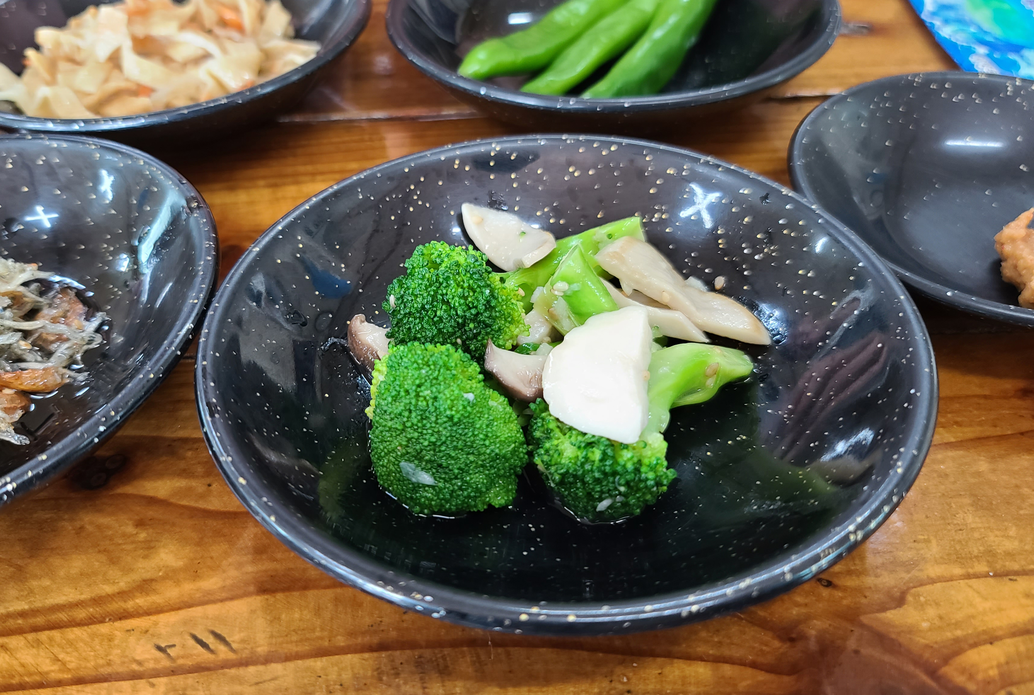 식당에서는 제주도 성산일출봉이 인쇄되어있는 물티슈가 제공되었고, 밑반찬으로는 배추김치, 어묵볶음, 고추, 멸치볶음, 브로콜리, 쌈장이 나왔습니다. 부족한 반찬은 직접 가져다 먹을 수 있는 셀프바도 마련되어 있었습니다.