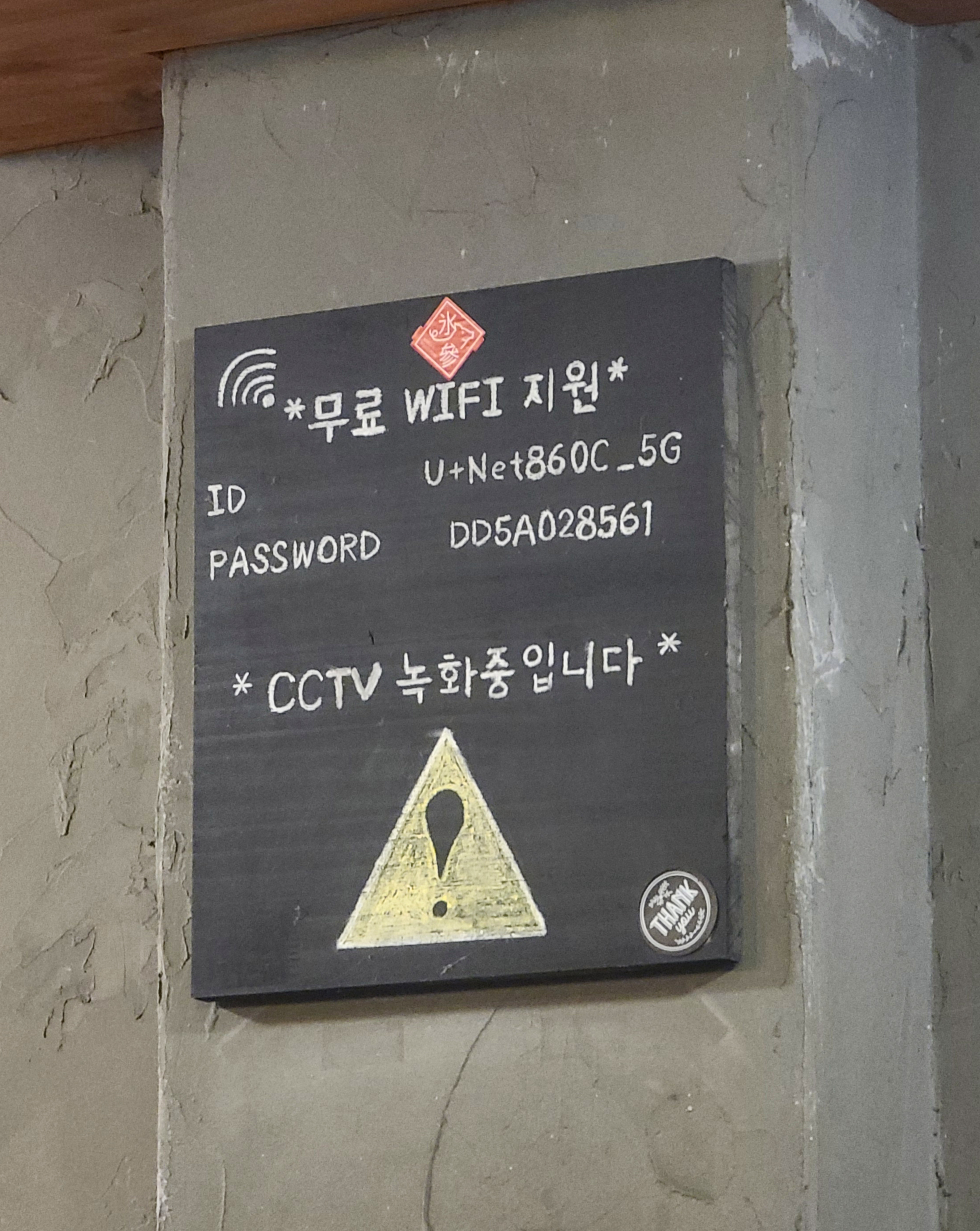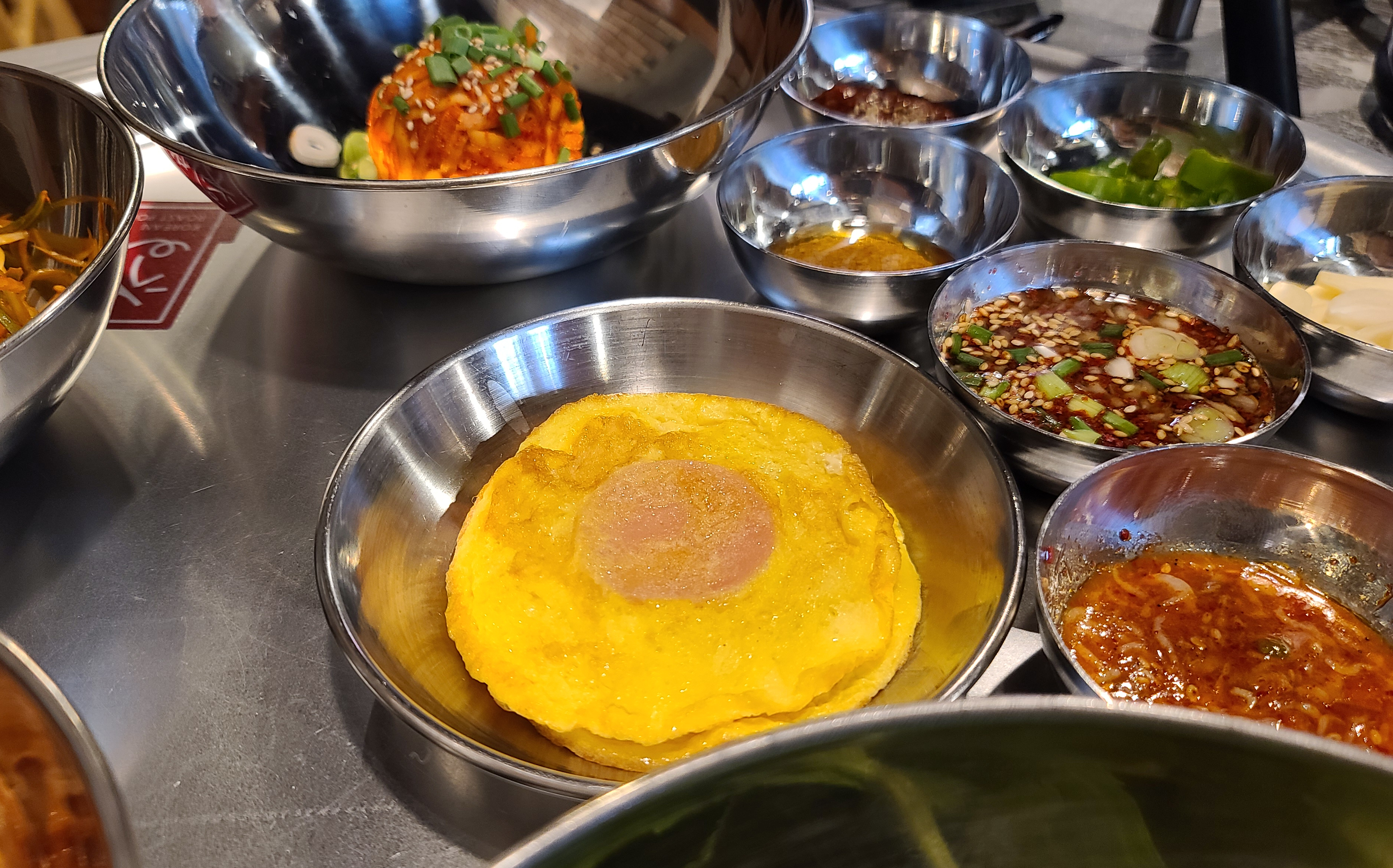반찬은 소시지 달걀부침을 비롯해, 배추김치, 백김치, 파절이, 무생채 등이 있었고, 고기와 곁들일 다양한 고추장 및 양념류와 젓갈 등이 함께 제공되었습니다.