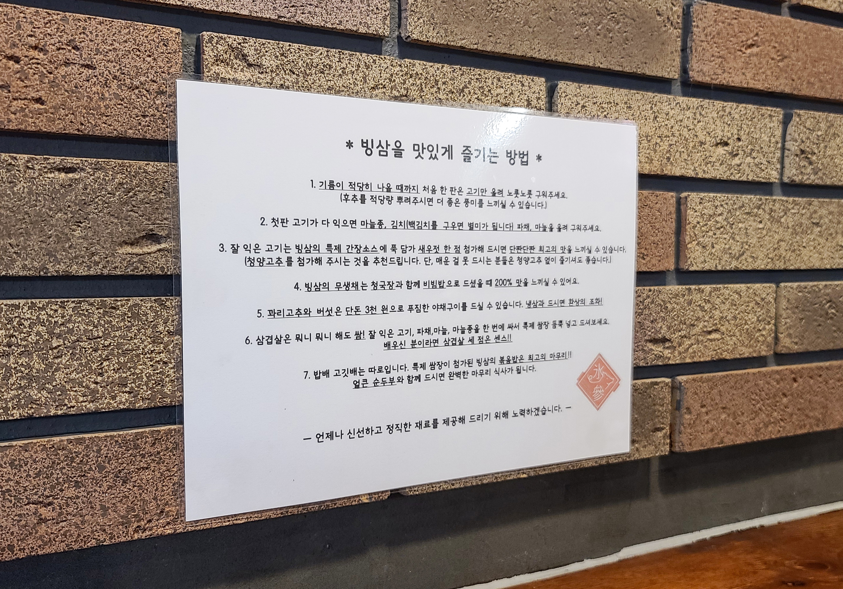 고기를 구우면서 빙삼을 맛있게 즐기는 방법에 따라 고기를 구워주기 시작했습니다. 먼저 기름이 적당히 나올 때까지 고기만 올려 구워주는데, 후추를 조금씩 곁들여 뿌려주고 이후 마늘종, 백김치, 파채, 마늘 등을 함께 구워주었습니다. 익은 고기는 빙삼 특제 간장소스에 찍었다가 새우젓을 곁들이면 된다고 하더라고요.