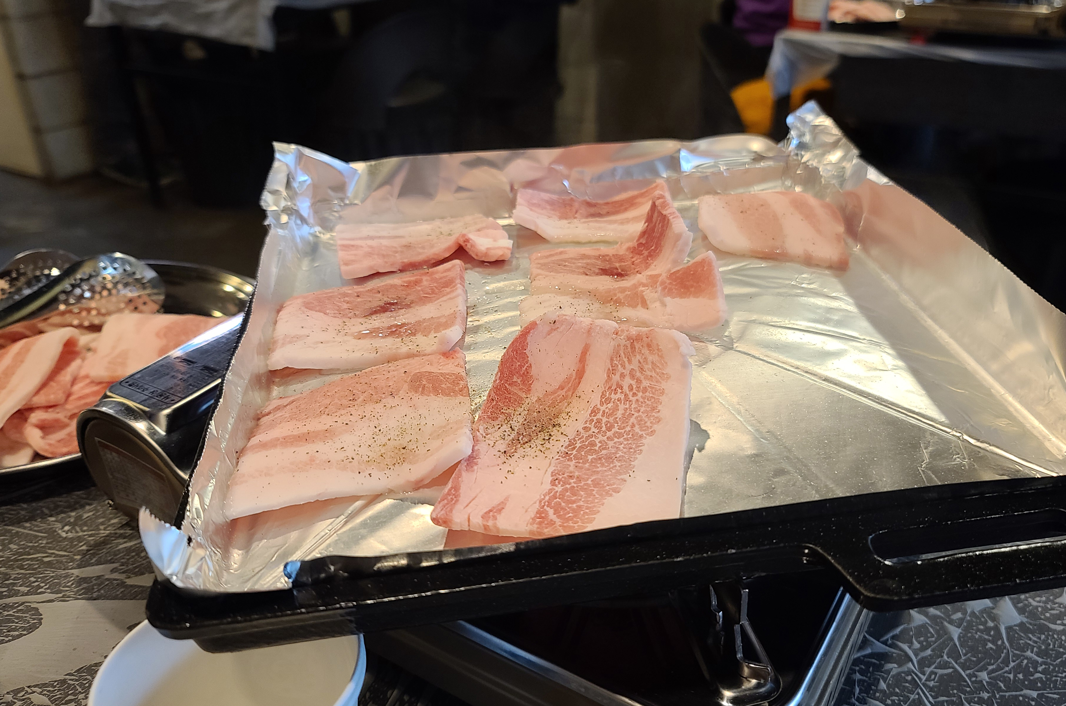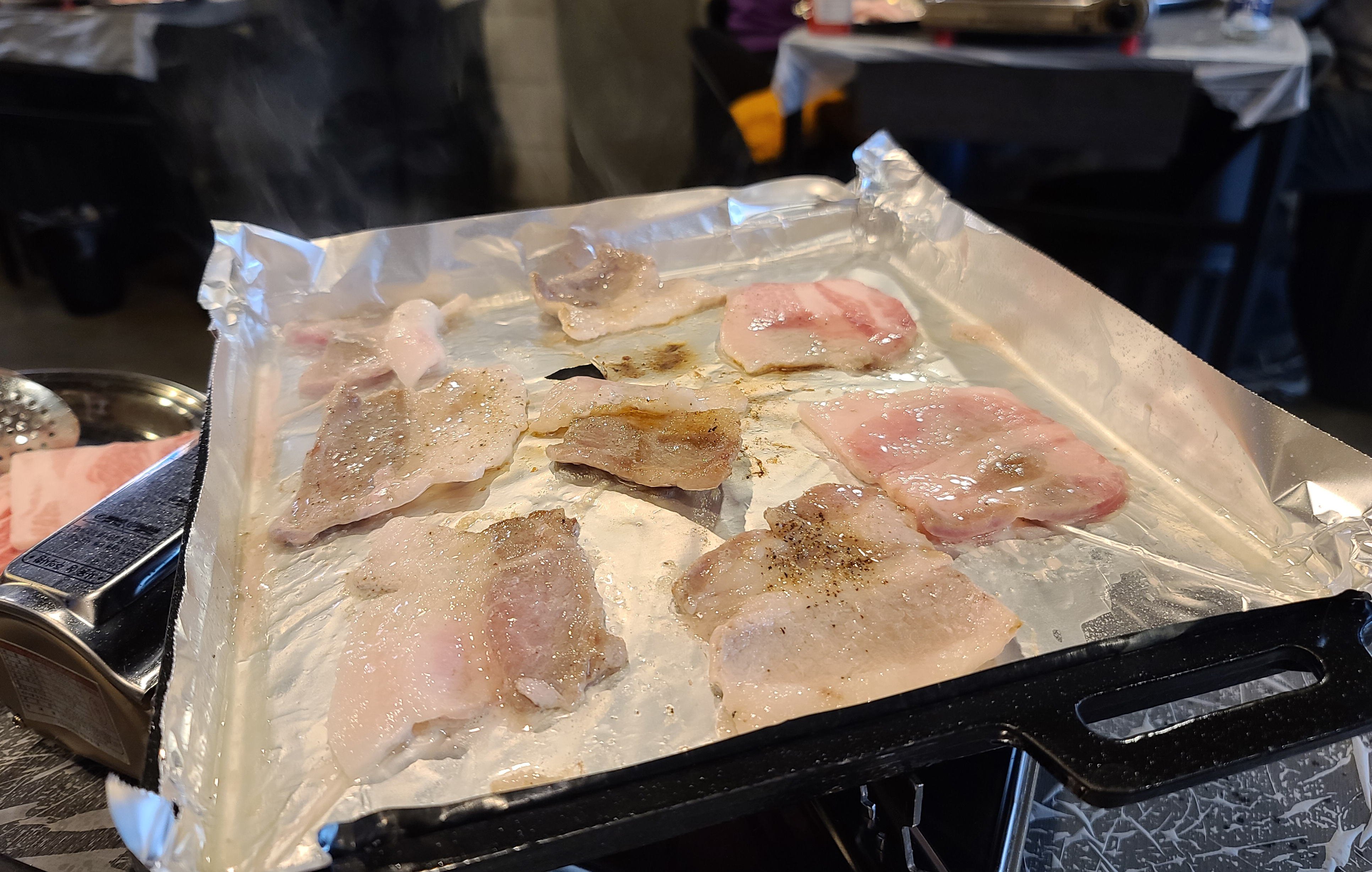 각설하고 냉삼을 주문하니, 알루미늄 포일에 삼겹살을 올려 구워주셨습니다. 그밖에 반찬들도 여러 종류 나왔는데요, 고기와 잘 어울리는 메뉴들로 구성되어있었습니다.
