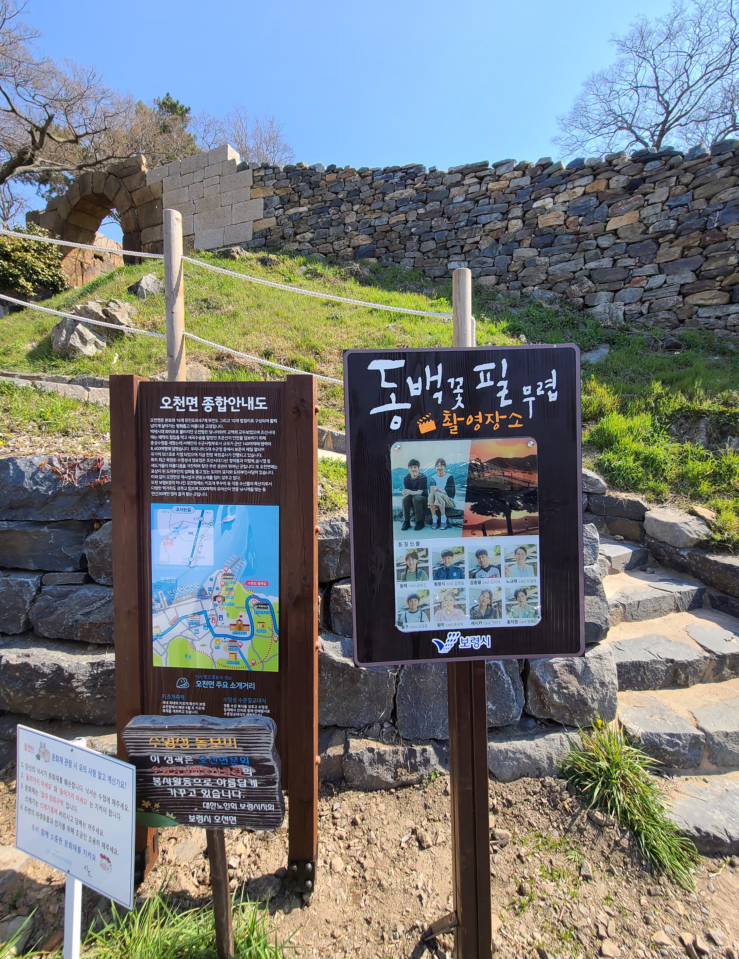 보령 충청수영성은 위와 같이 주차장이 별도로 마련되어있어, 차량 이용으로 접근이 편리했고요. 동백꽃필 무렵 촬영 장소가 어디인지 알려주는 친절한 안내문이 붙어있어서, 드라마 촬영 때와 같은 장소에서 사진도 찍어볼 수 있게 되어있었습니다.