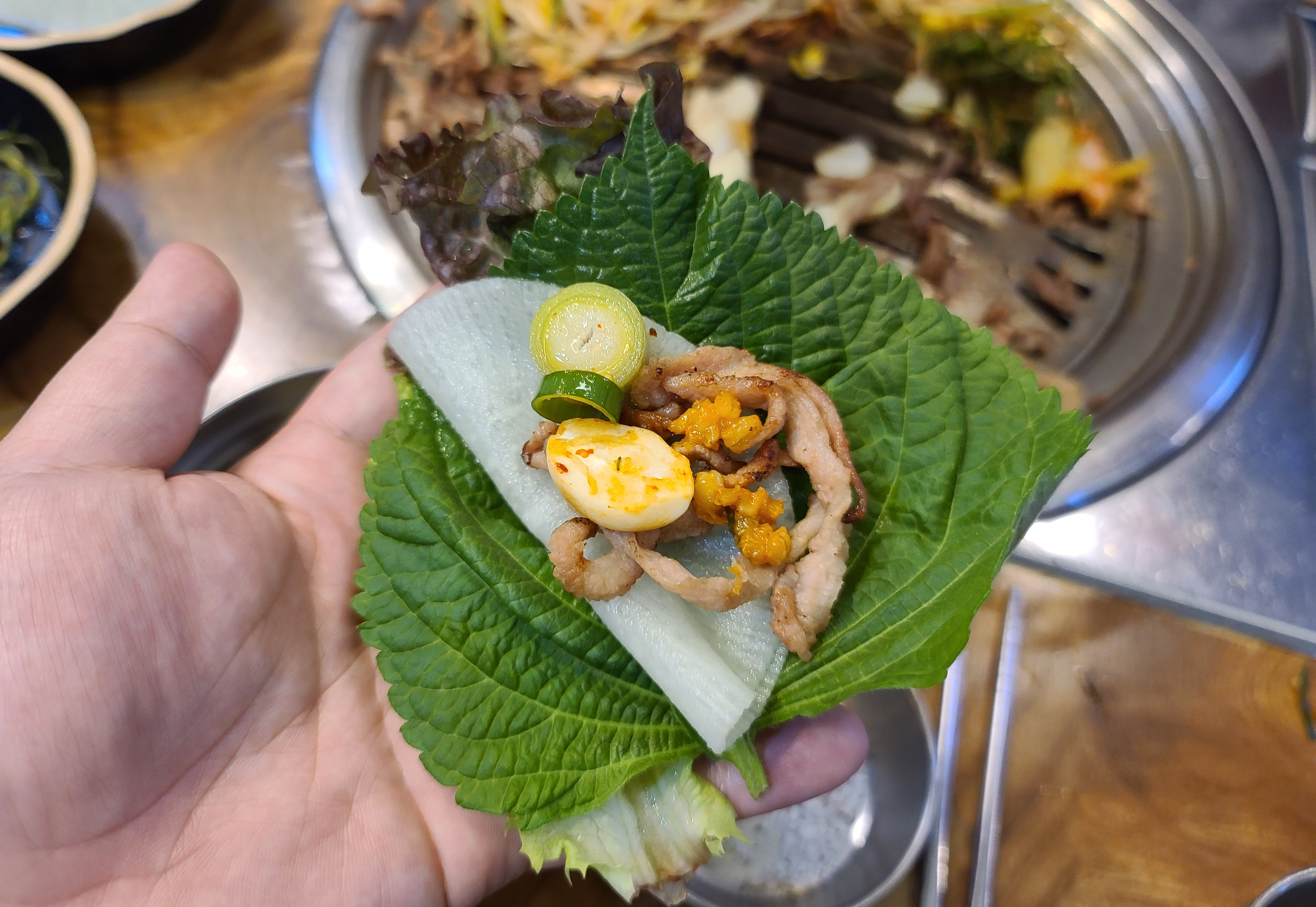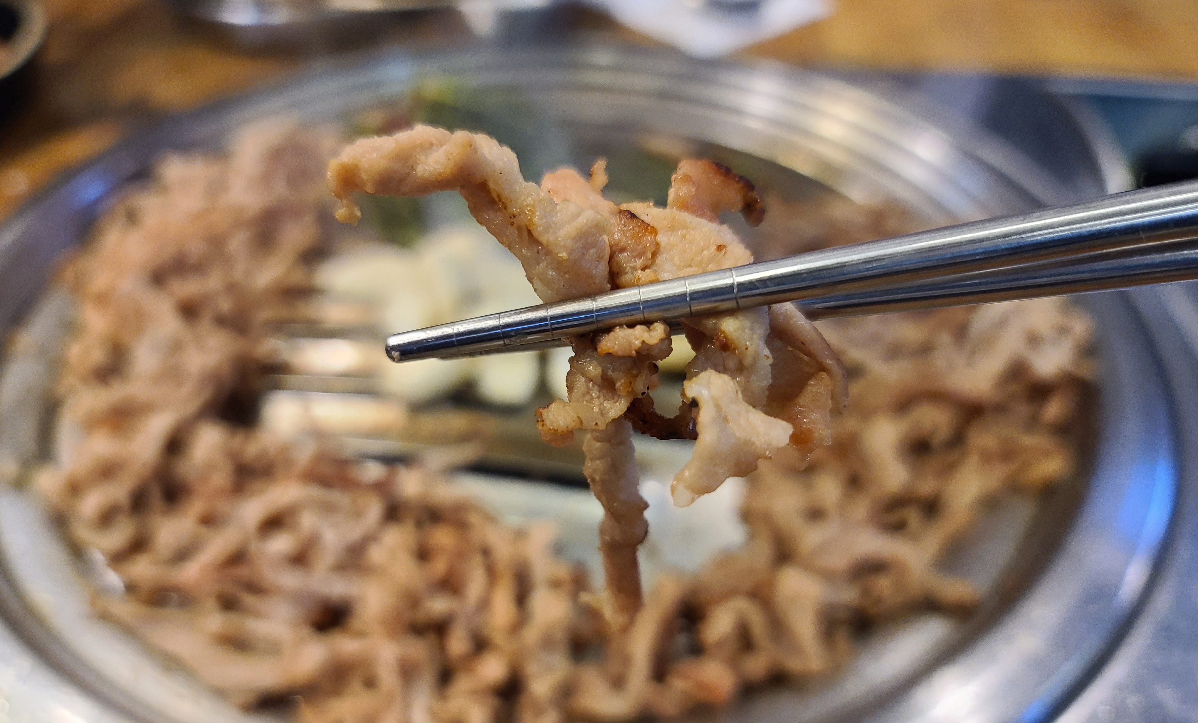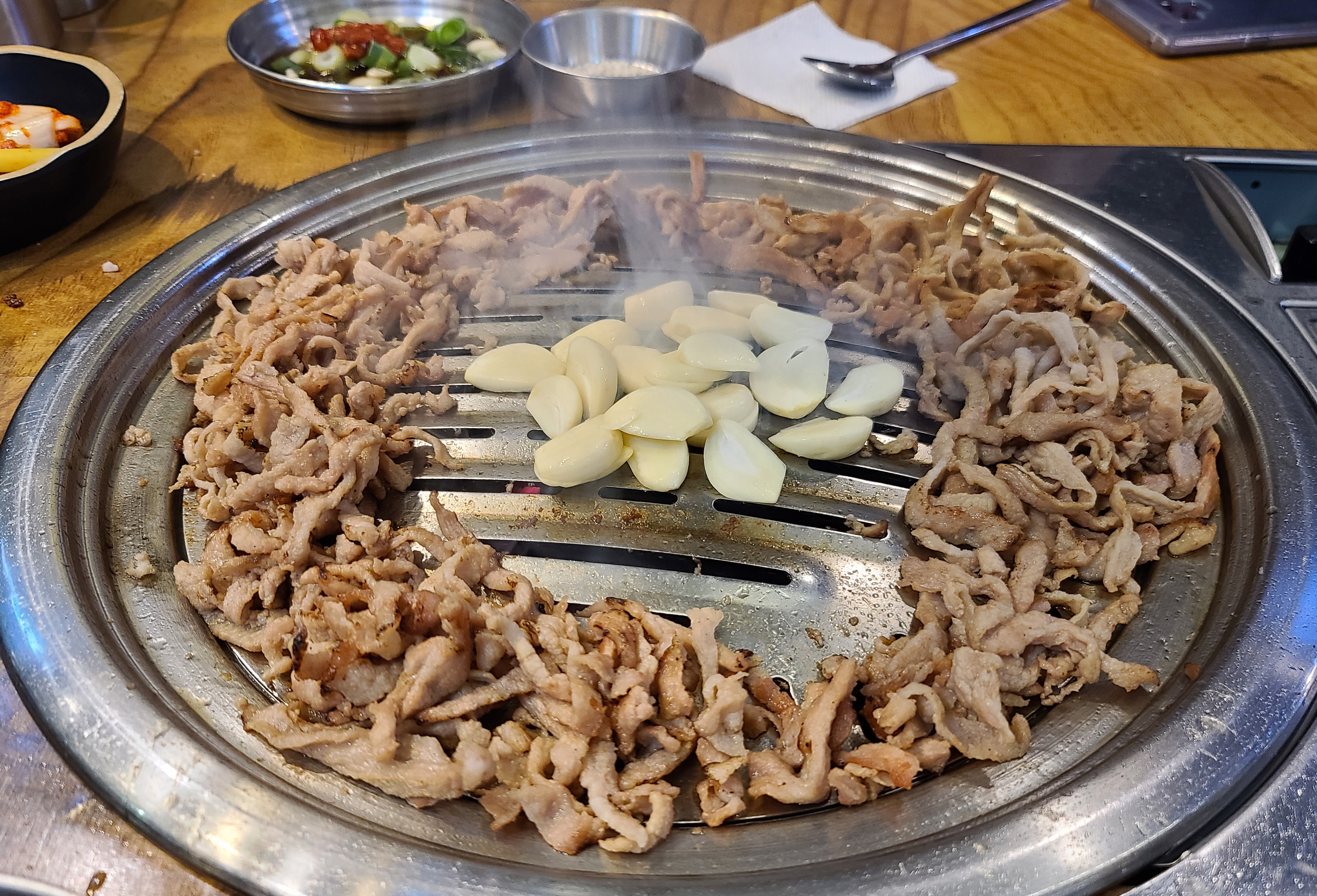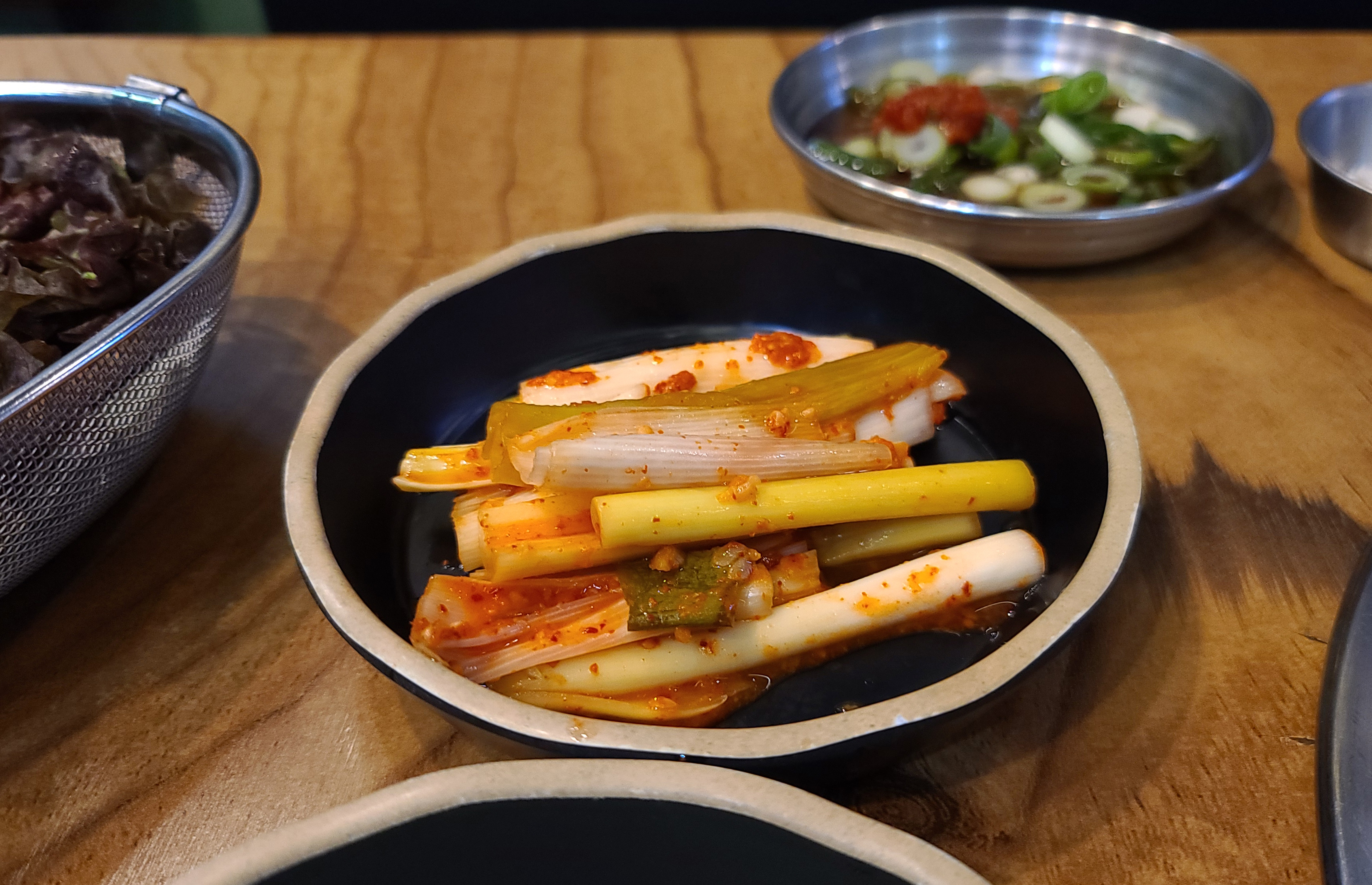잘 구워진 항정살에 마늘과 대파장에서 파를 건져내 같이 쌈을 싸 먹으면 더없이 좋았죠. 정말 여태까지 다녀본 고깃집 중에 가장 손이 많이 가는 메뉴였고, 고기 굽는 손놀림이 아직도 잊히지 않을 정도로 놀라웠습니다.