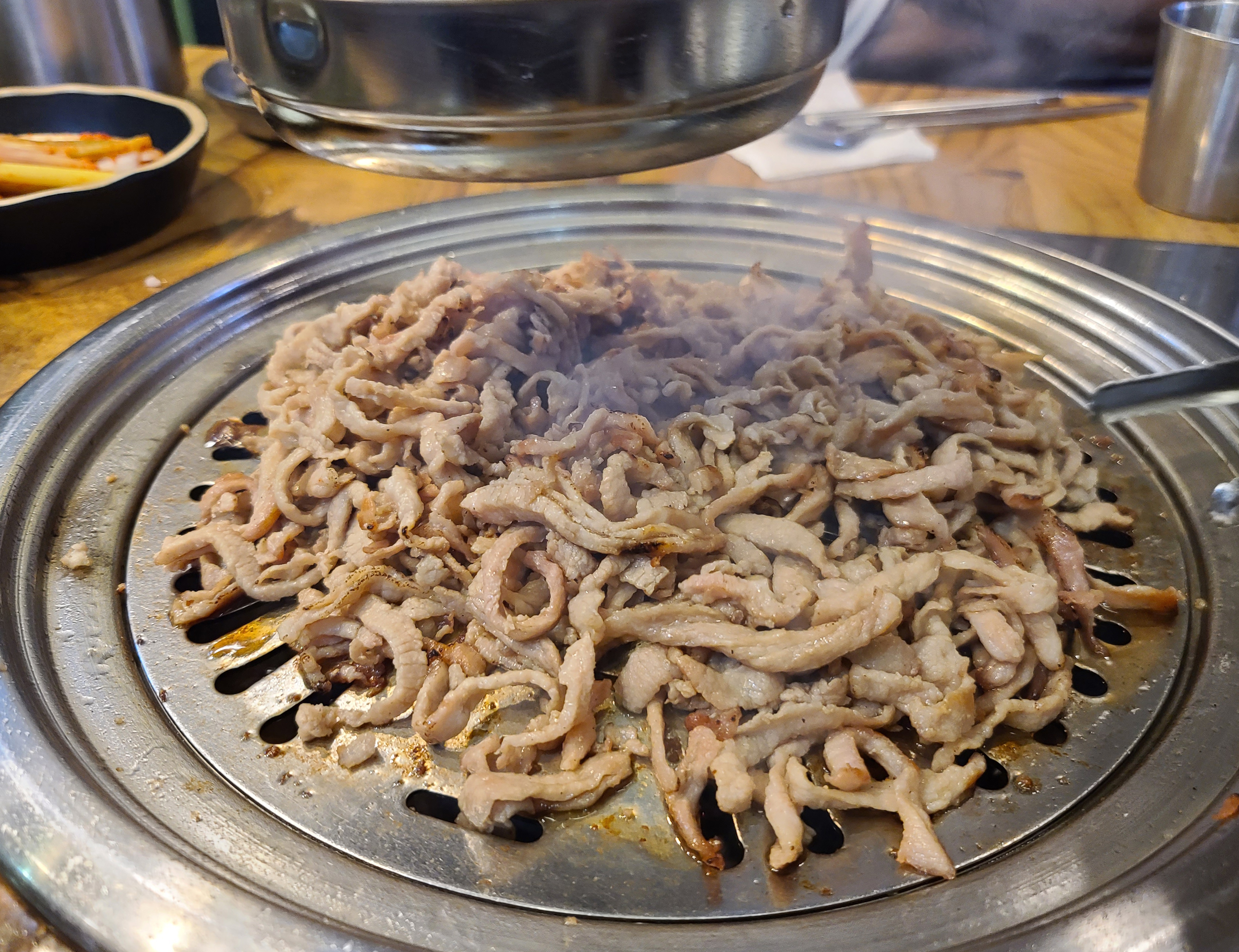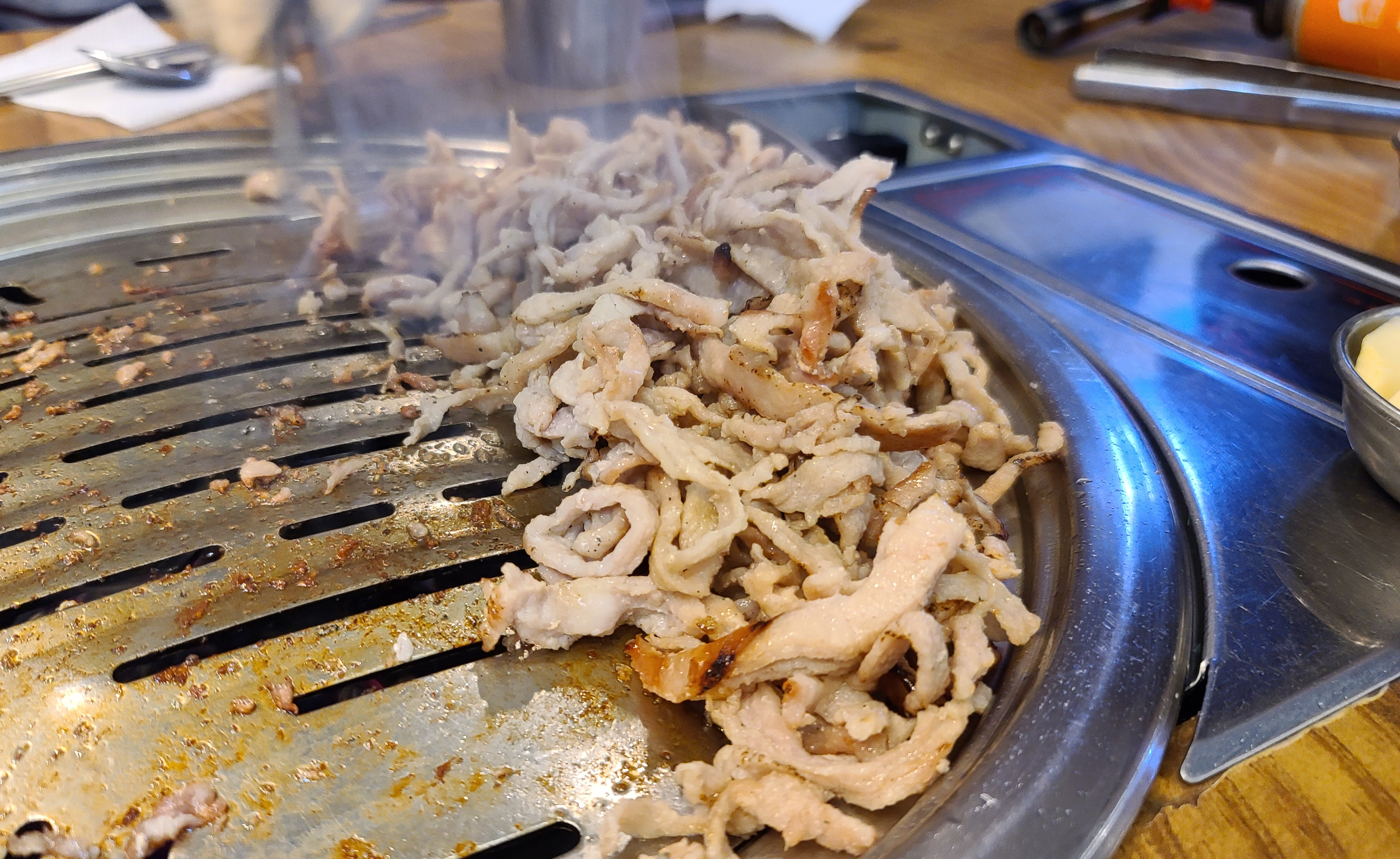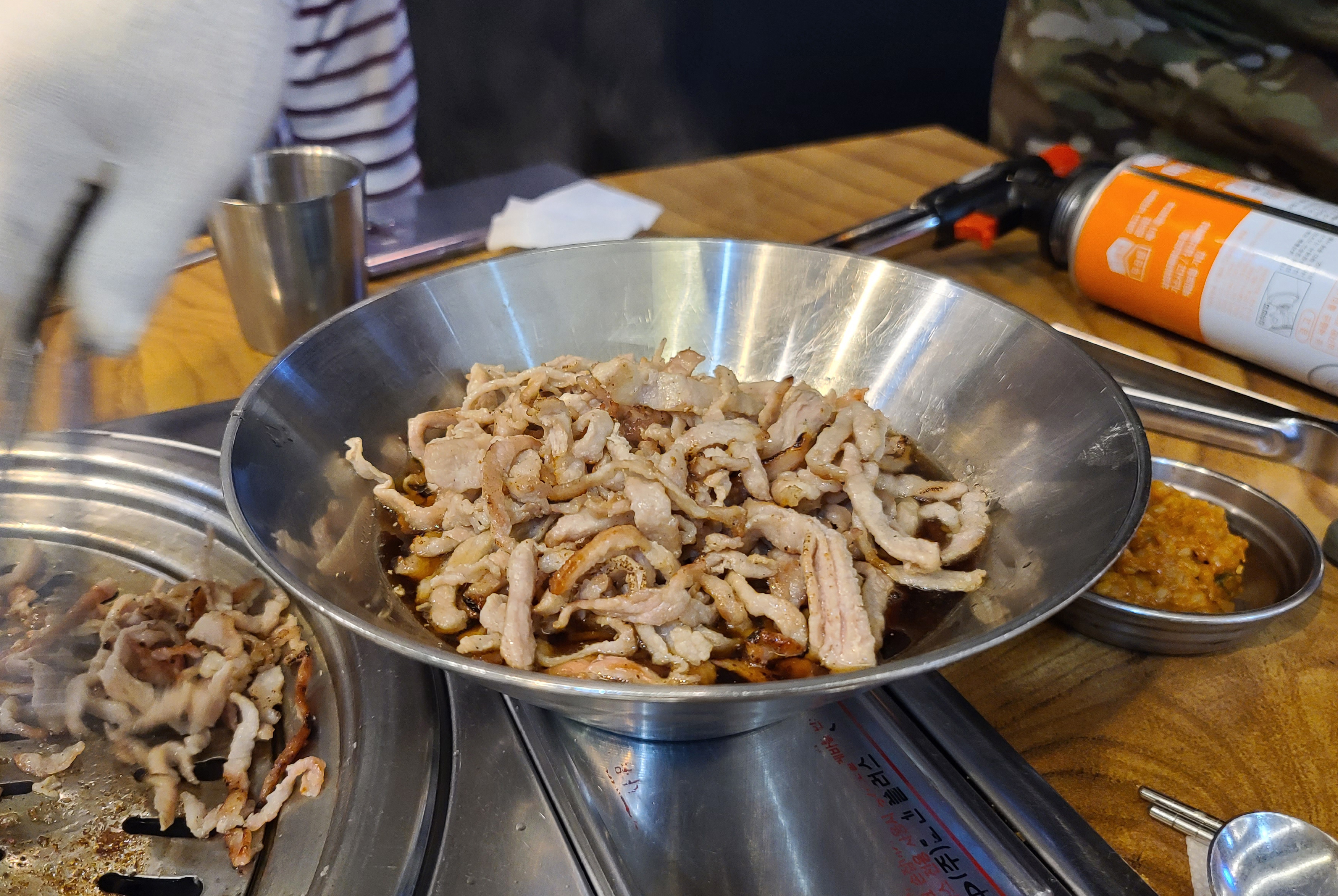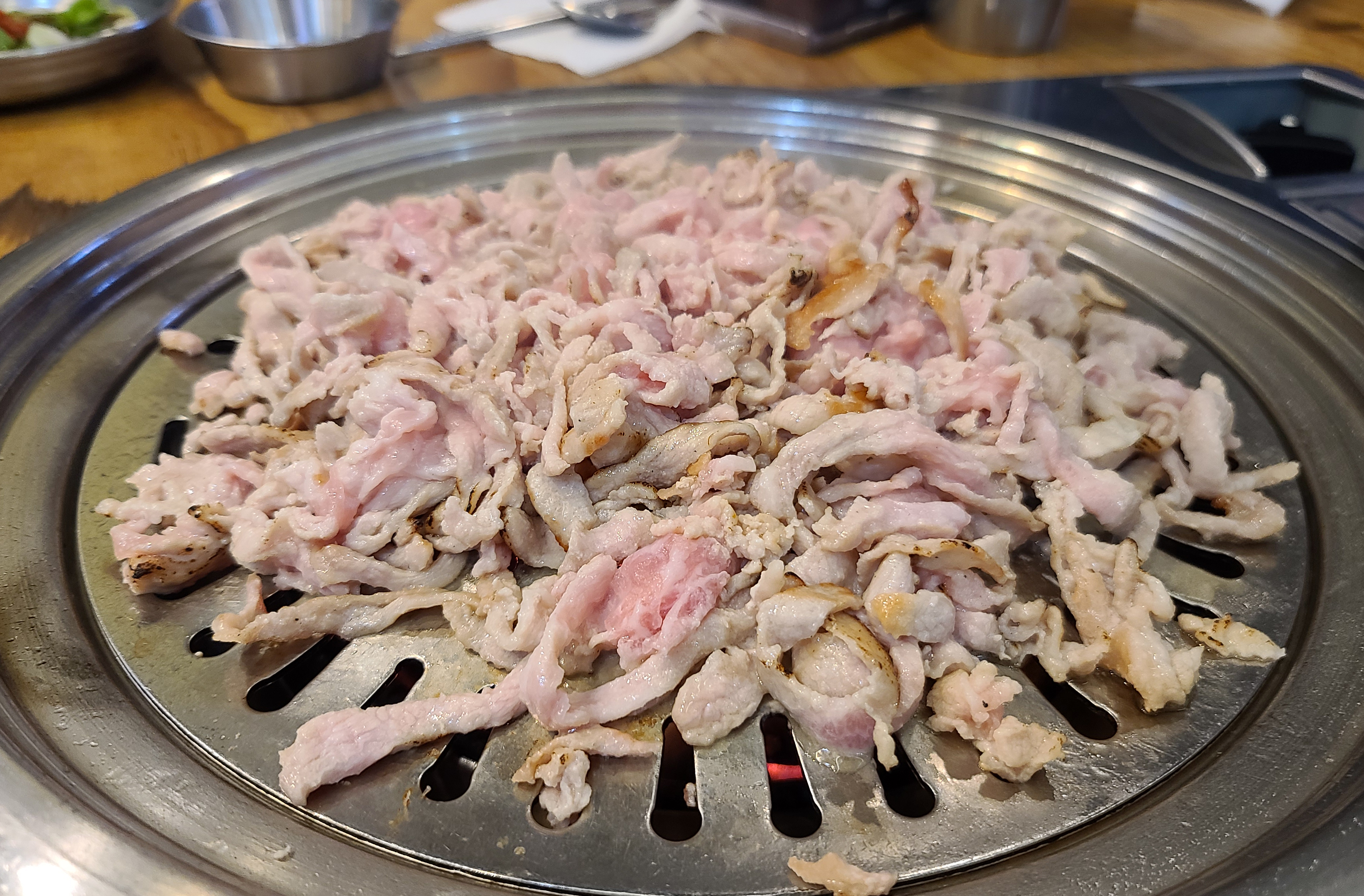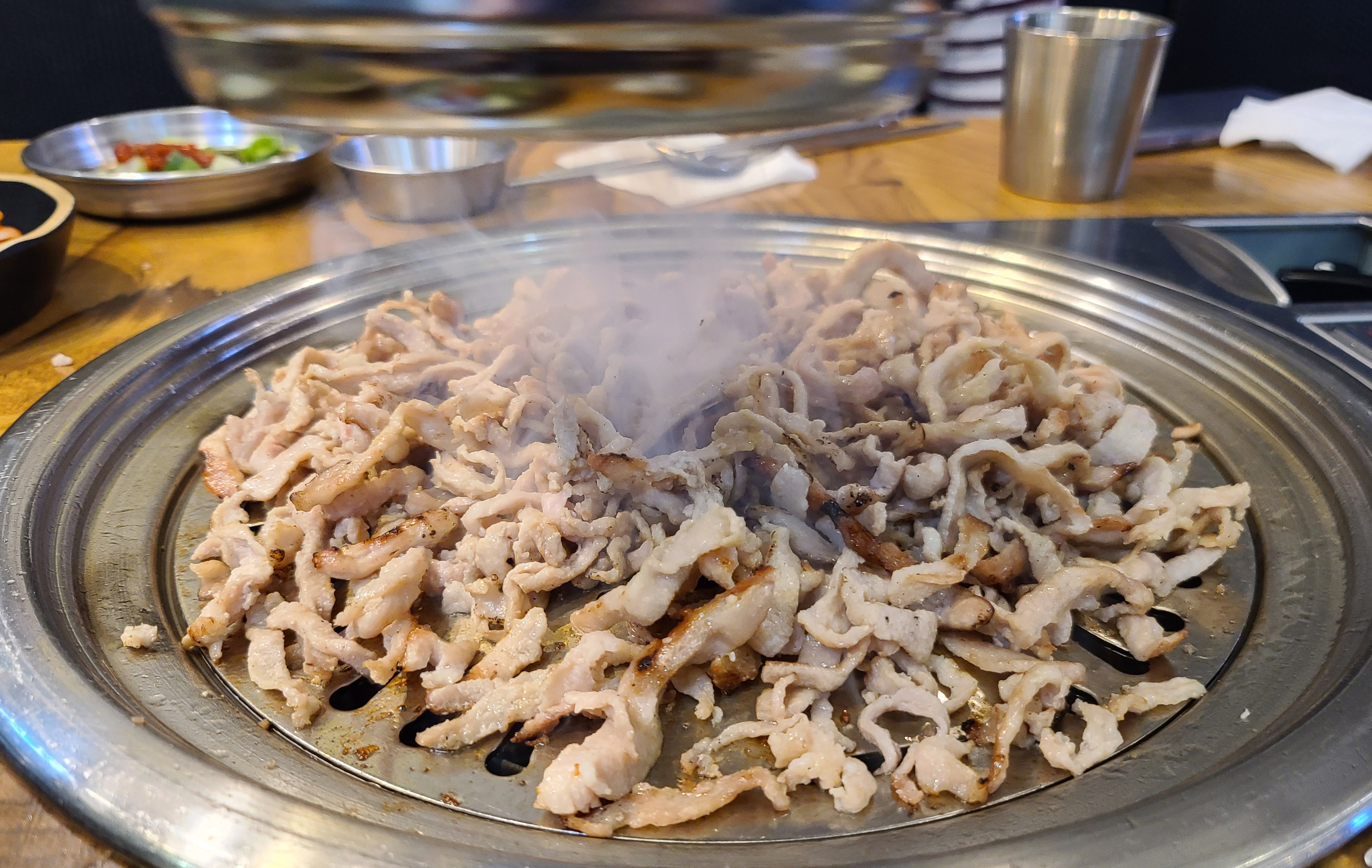 잘 구워진 항정살에 마늘과 대파장에서 파를 건져내 같이 쌈을 싸 먹으면 더없이 좋았죠. 정말 여태까지 다녀본 고깃집 중에 가장 손이 많이 가는 메뉴였고, 고기 굽는 손놀림이 아직도 잊히지 않을 정도로 놀라웠습니다.