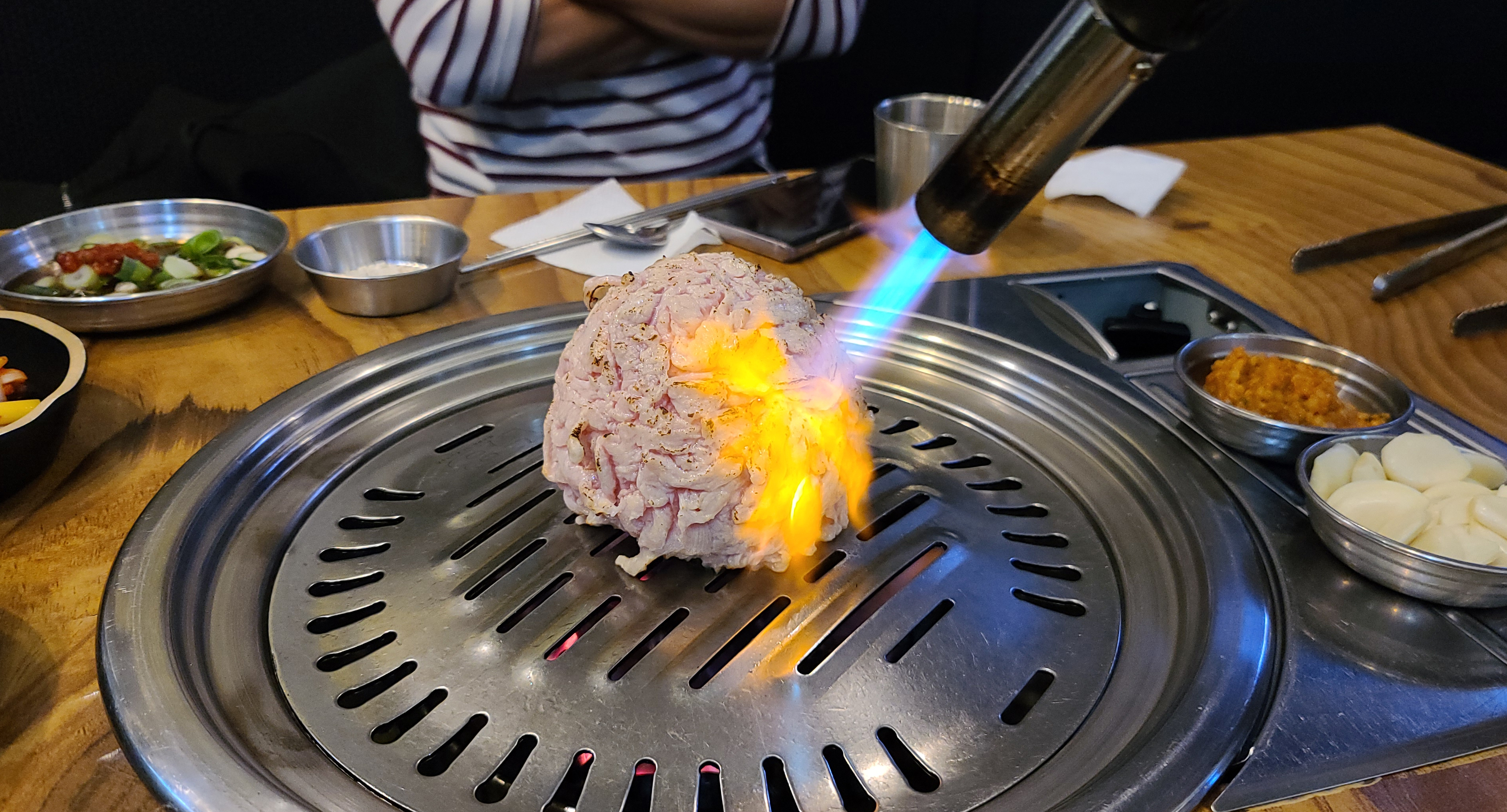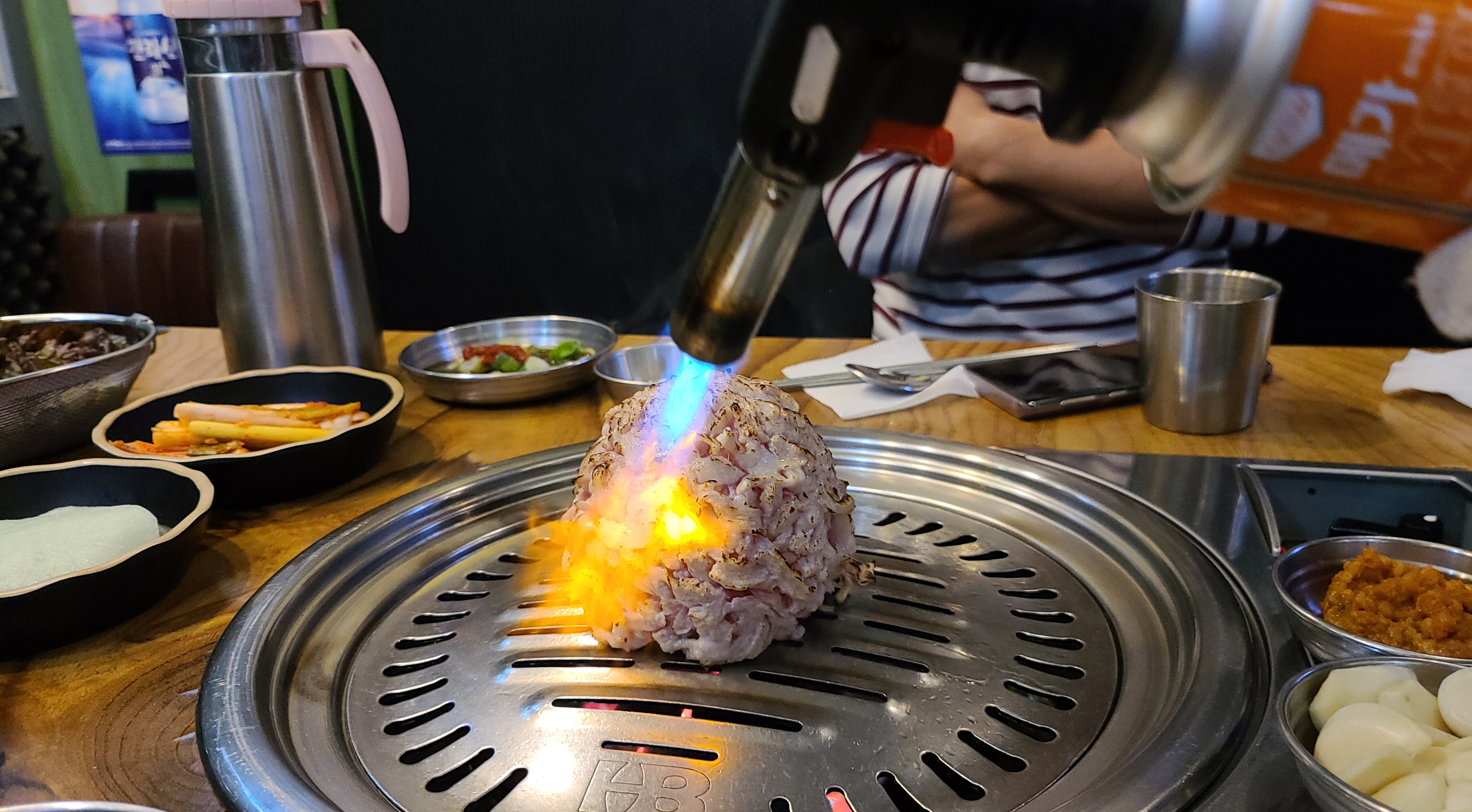 장인의 손길처럼 가스 토치를 이용해 고기의 기름기를 녹여주었습니다. 이때 주목해야 할 부분은 겉 불꽃으로 익히는 게 아니라 속의 파란 불꽃으로 고기의 지방을 녹이는 게 포인트라고 하네요! 아직 끝나지 않았습니다.
