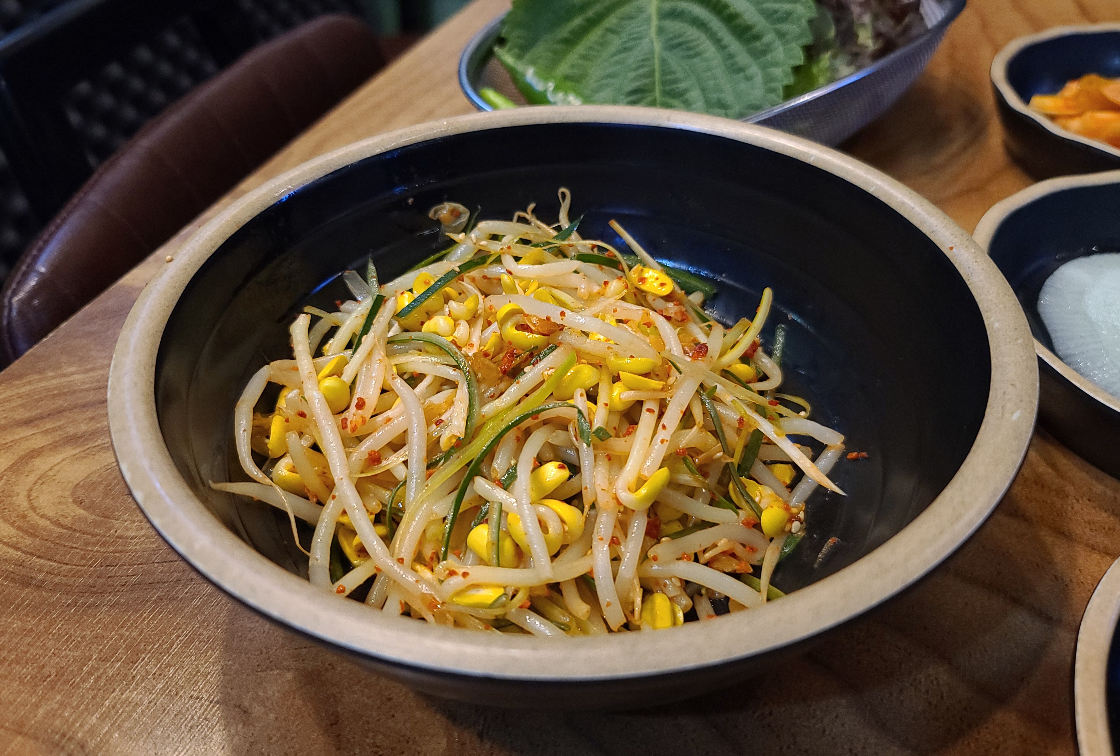 저희는 팔월 잔칫날의 하루 3판 한정 판매 메뉴인 '슈퍼볼'을 주문하였습니다. 다행히도 한정판매인 슈퍼볼을 제가 마지막으로 슈퍼볼을 주문할 수 있어서 맛볼 수 있었습니다. 밑반찬으로는 콩나물무침, 쌈채소, 파김치, 콩나물무침 등이 나왔습니다.