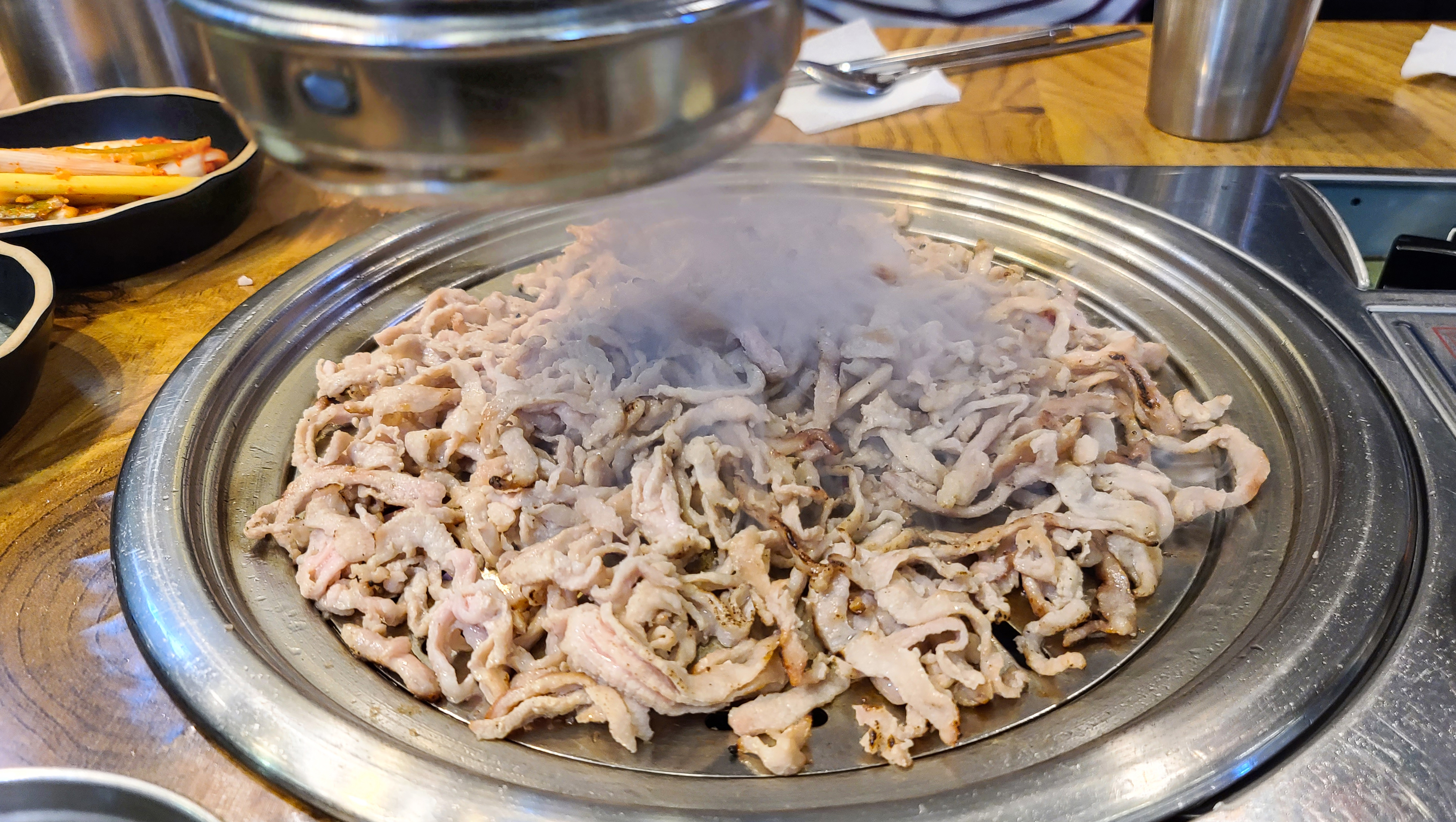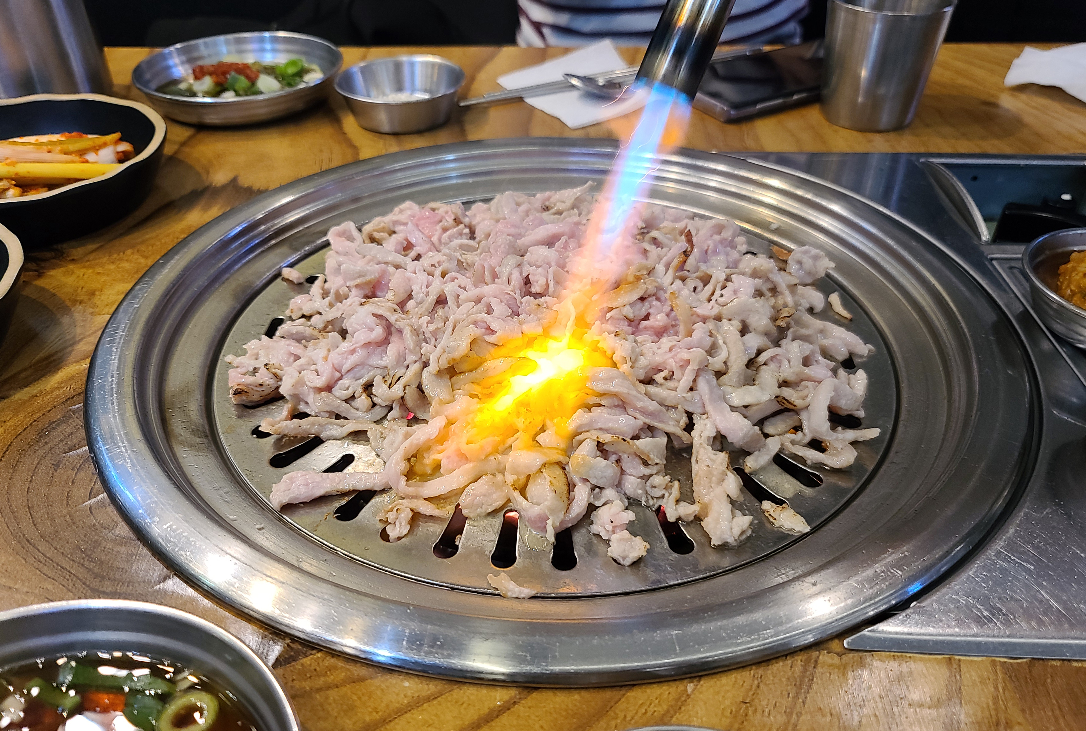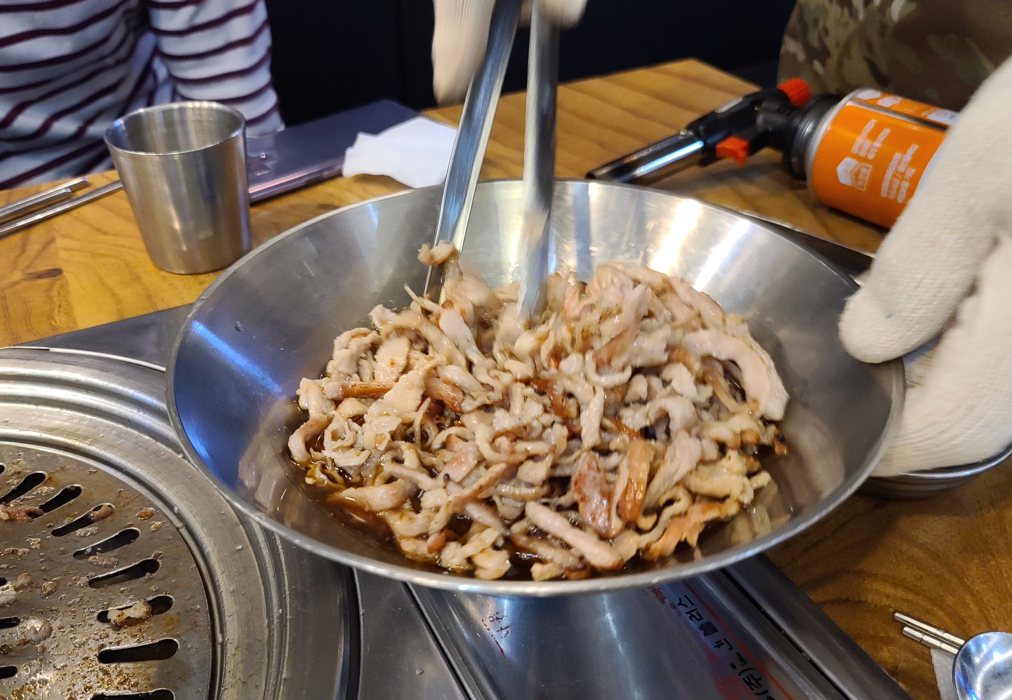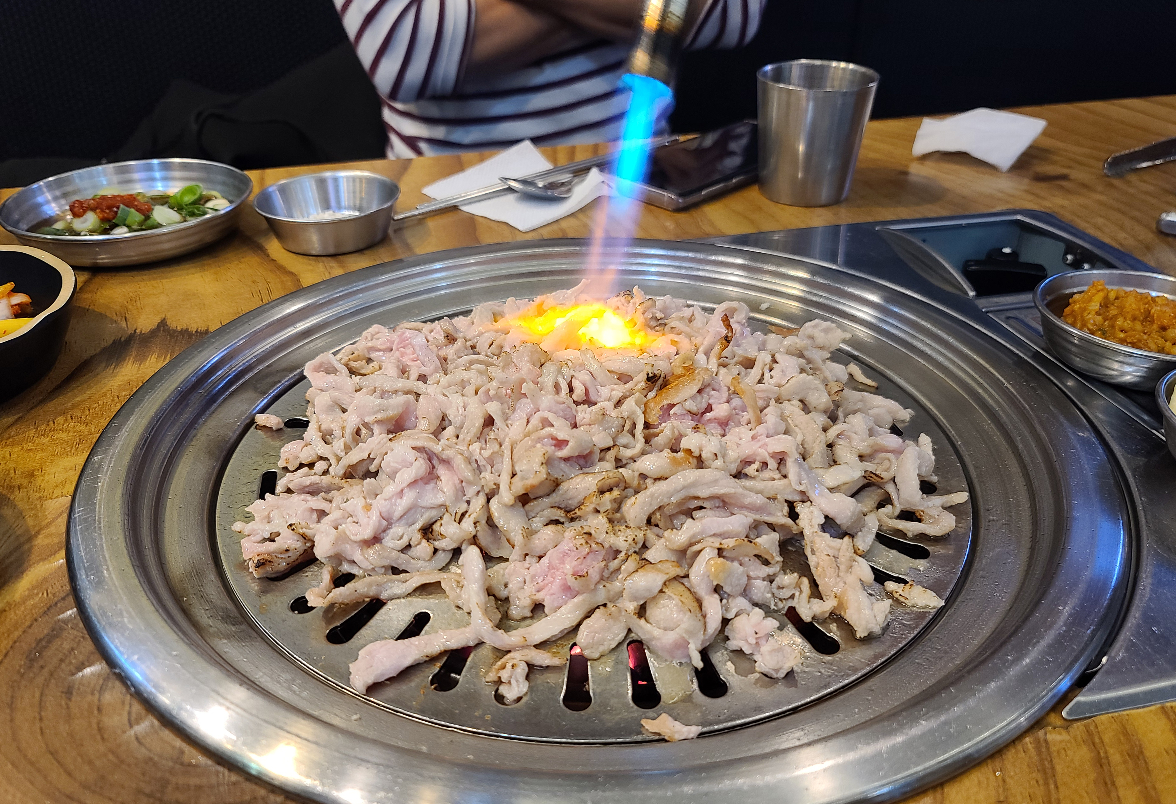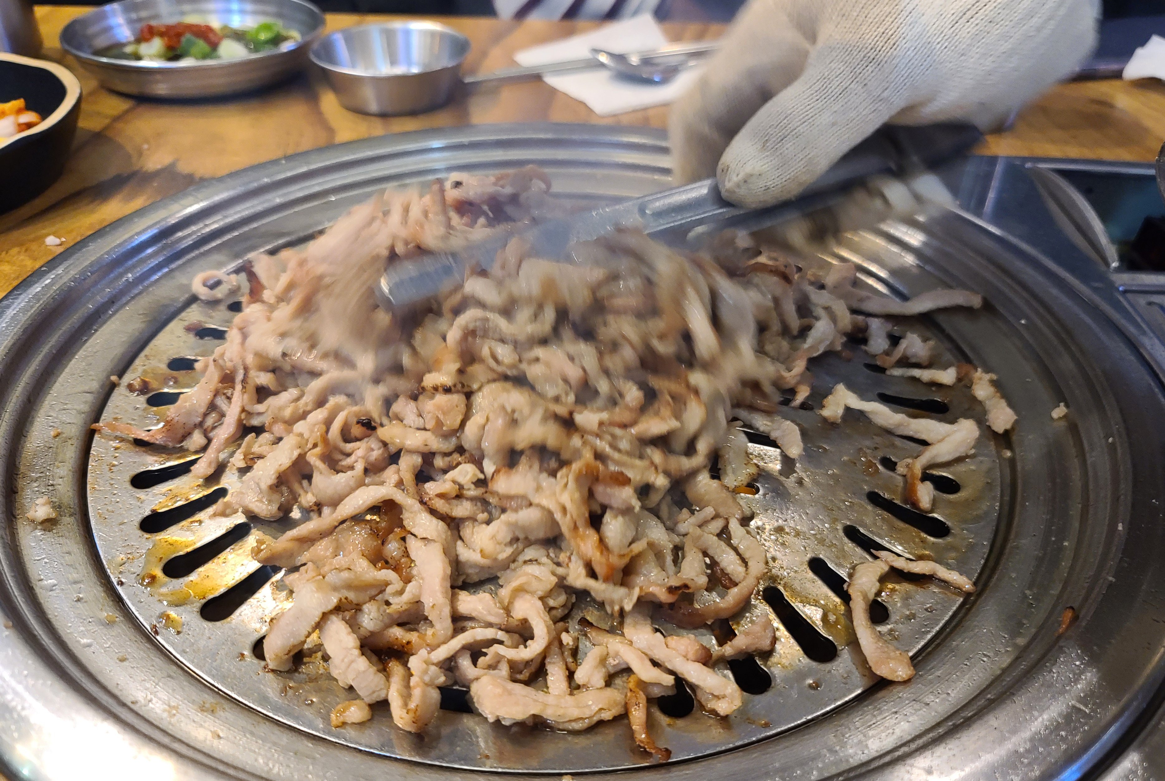 곧이어 기름기를 제거한 항정살 1근(600g) 짜리 슈퍼볼이 등장했습니다. 가격은 무려 55,000원으로 결코 저렴한 금액은 아니지만, 비주얼적으로도 맛으로도 부족함이 없었던 메뉴였습니다. 맨 처음에는 고기의 겉면을 익혀주다가 항정살을 헤쳐주어 속을 익혀주기 시작했습니다.