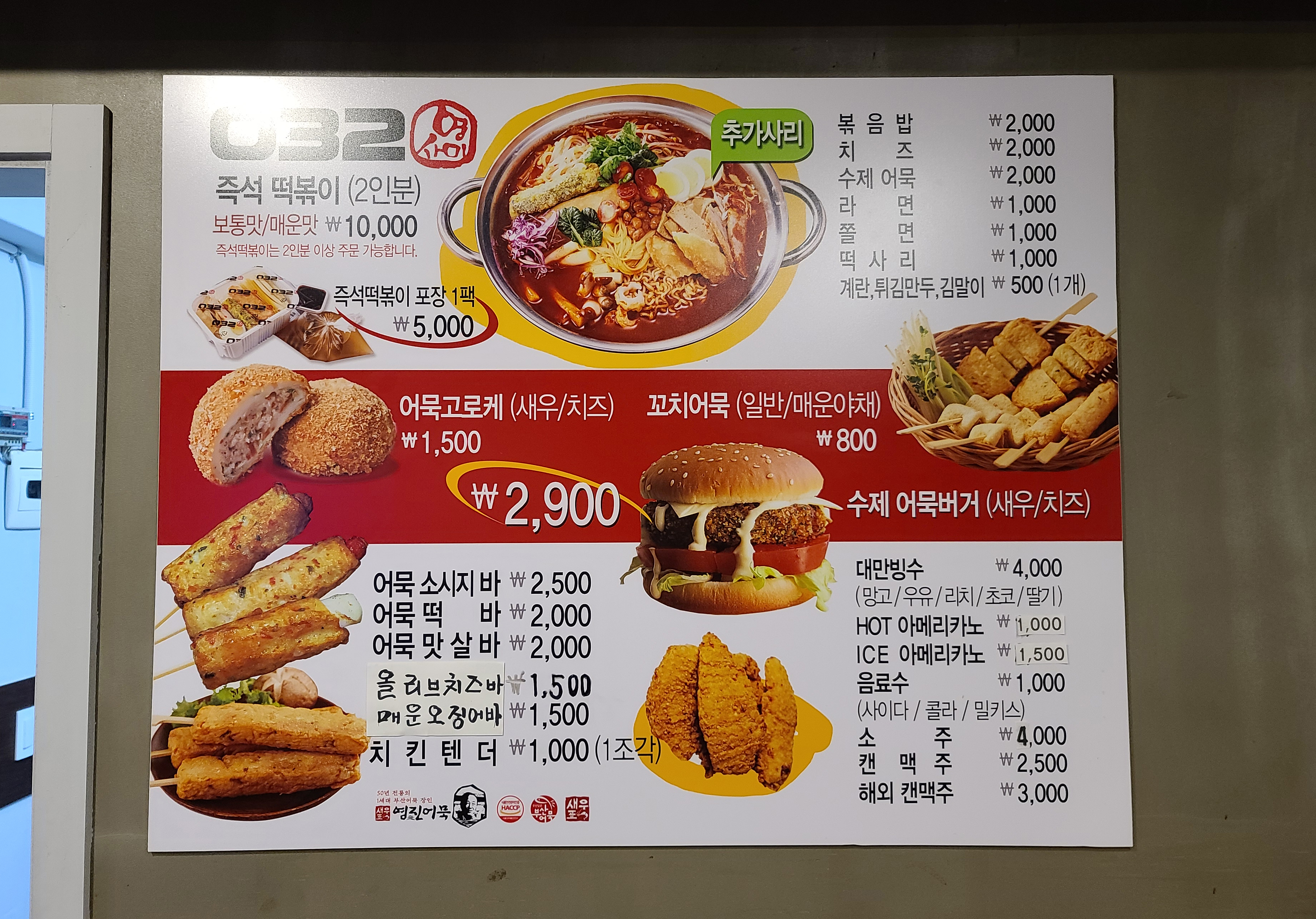 우선 가게의 외관은 위와 같이 생겼습니다. '영진어묵을 사랑하는 미스떡볶이' 라는 말을 줄여 '032' 즉, '영사미' 라고 이름을 지은 듯한데, 이름도 독특하지만 가게의 메뉴는 더 독특했습니다. 우선 가게 내부로 들어가시면,