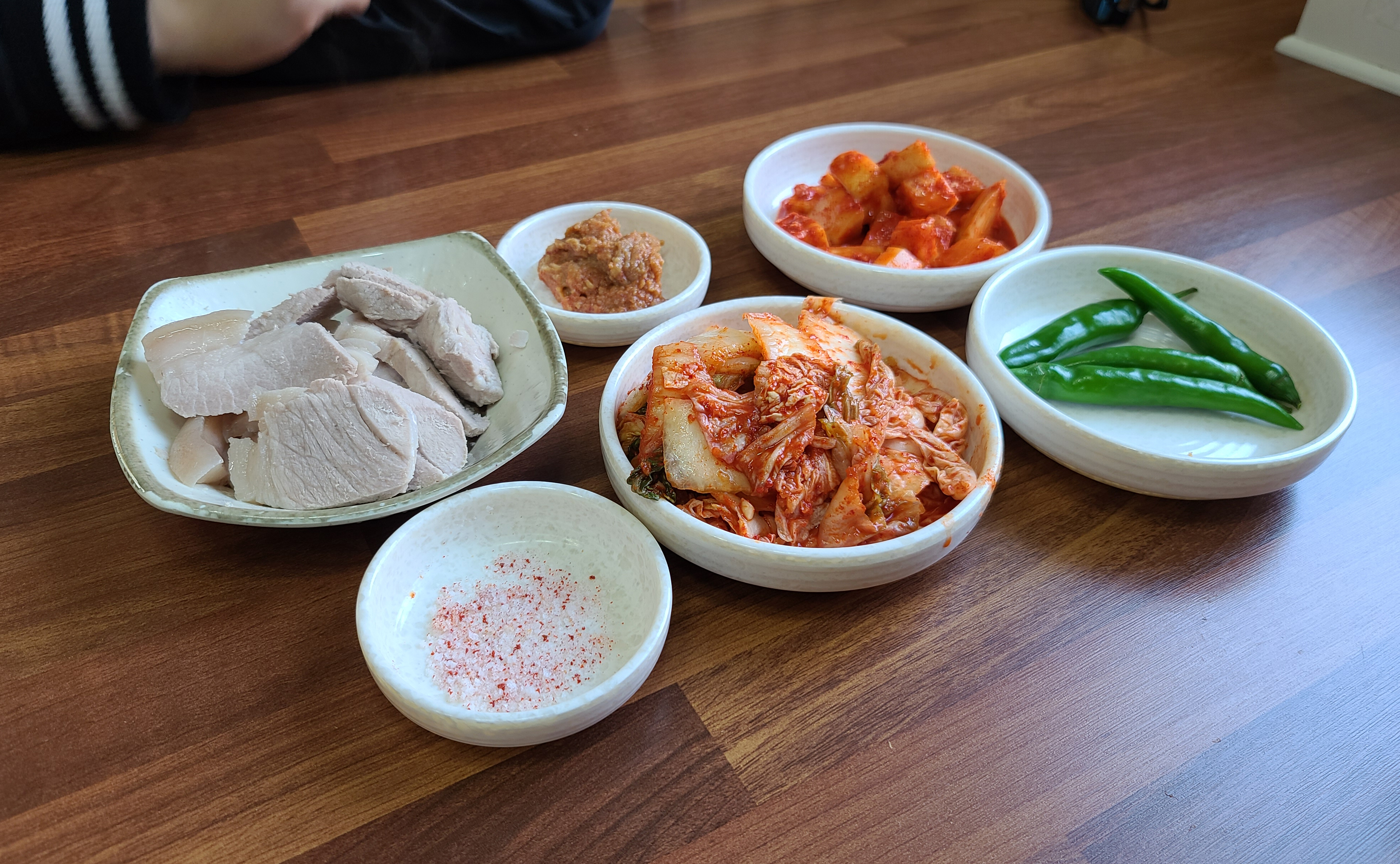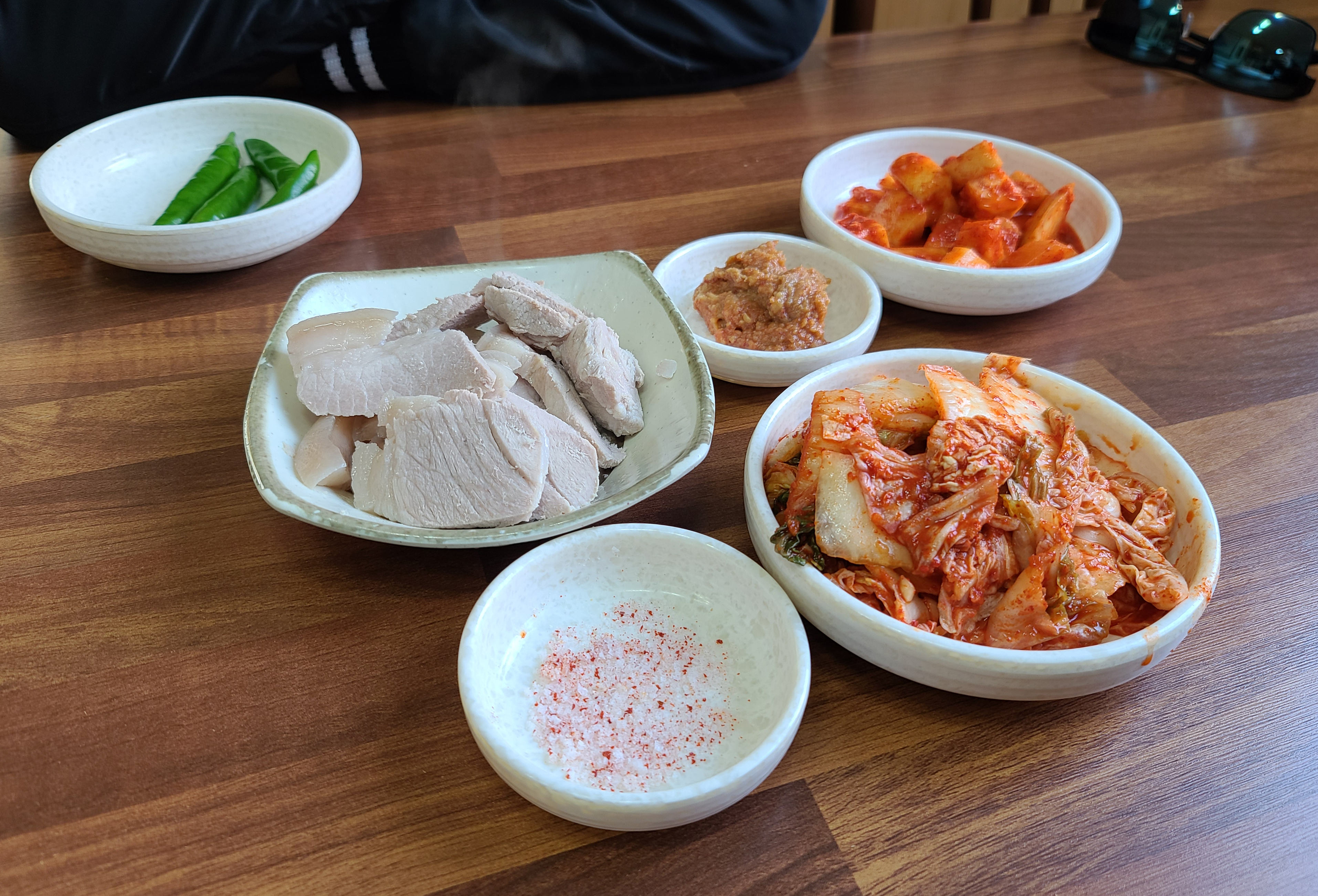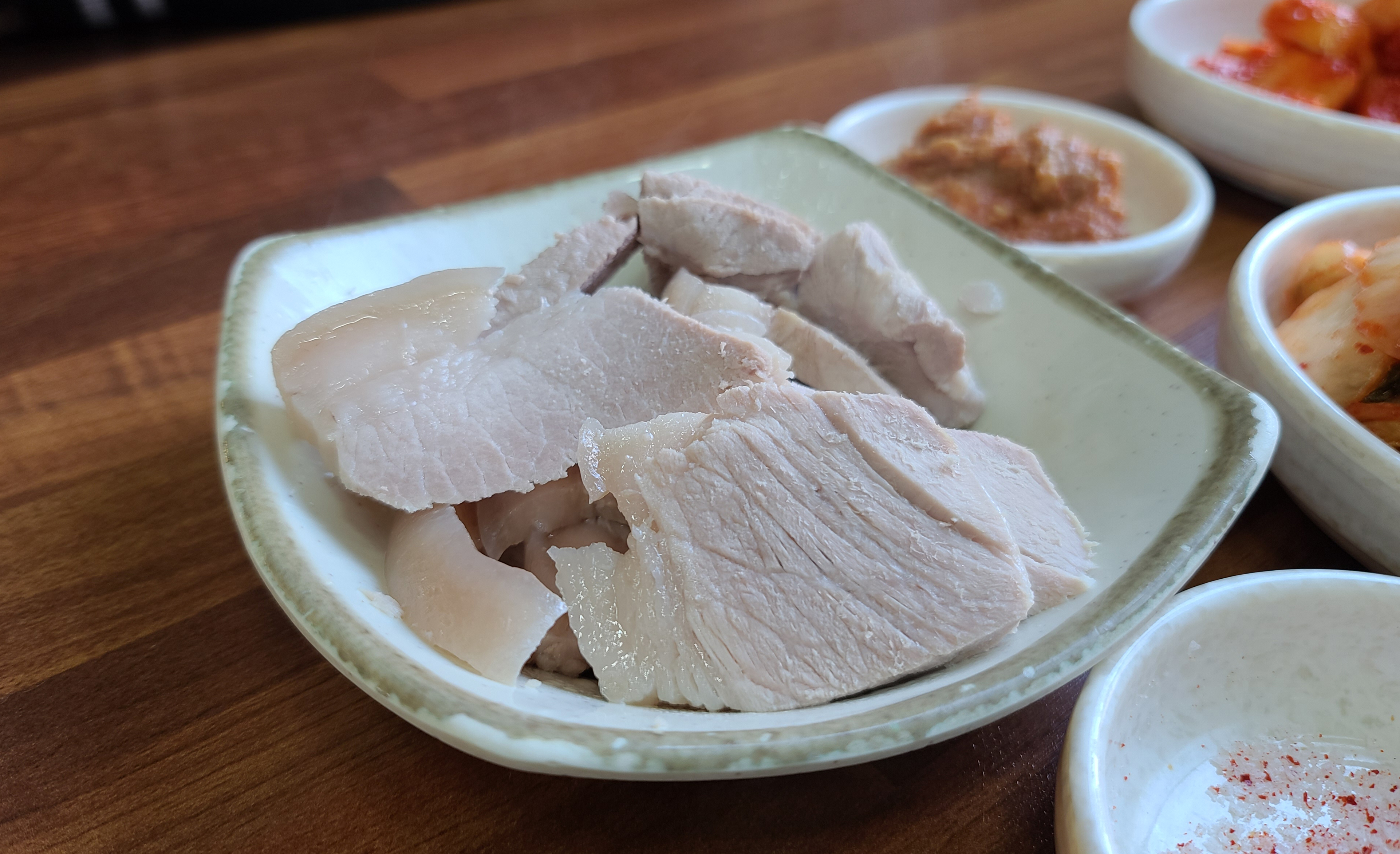 제주도 장수물식당은 돔베고기를 서비스로 몇 점 제공해주시는데요, 쌈장이나 순대용 소금에 찍어먹는 형태였습니다. 물론 깍두기나 배추김치와 곁들여도 좋았습니다.