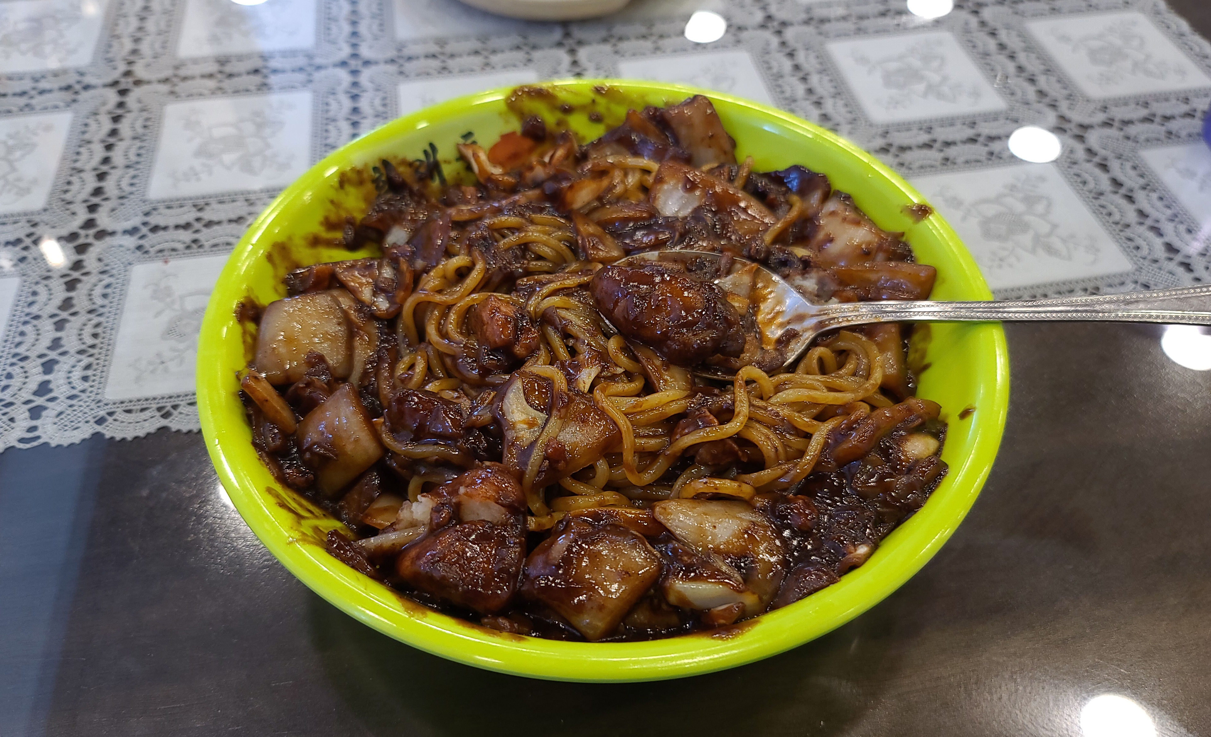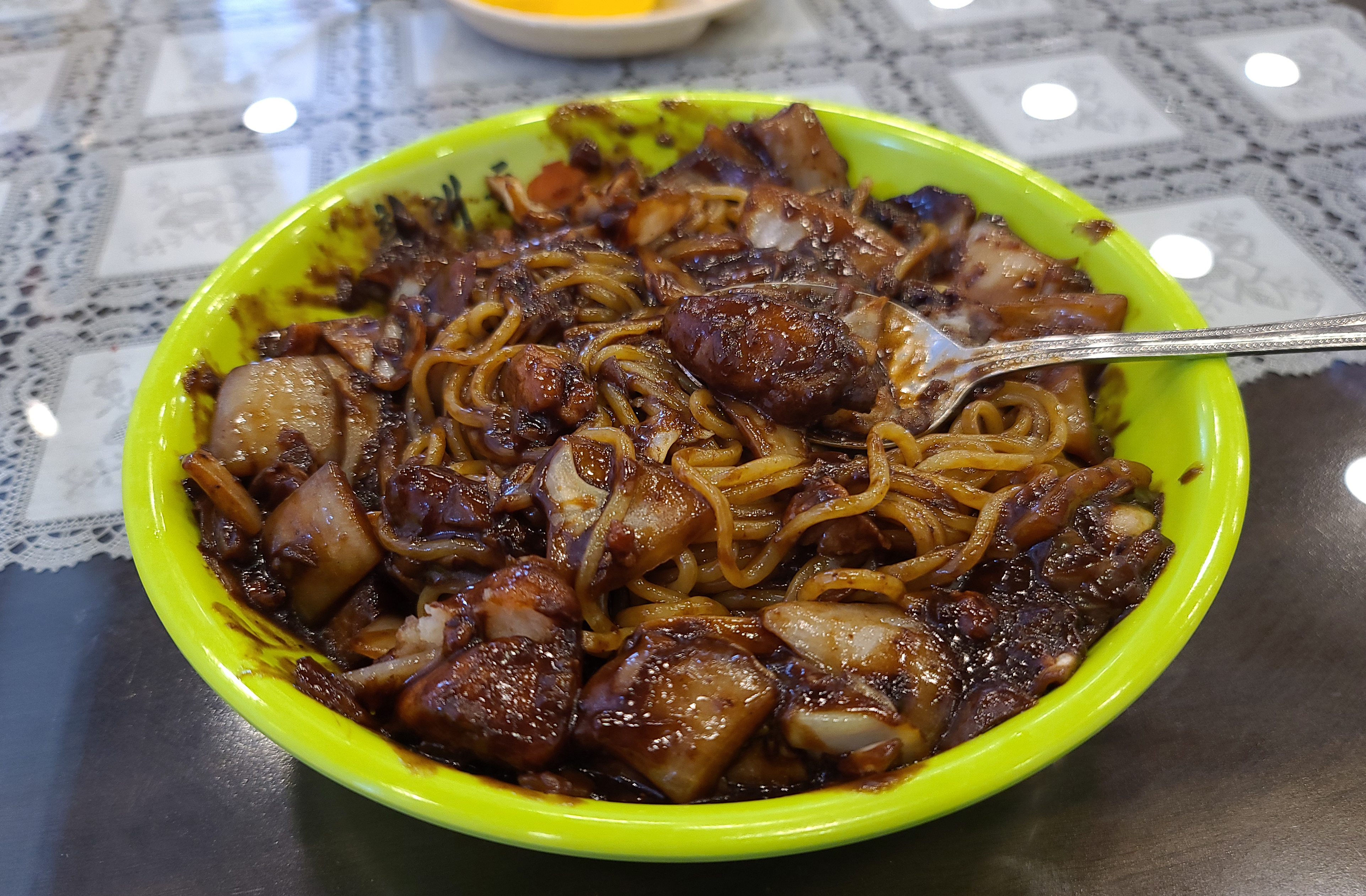 소스를 면 위에 붓고 뒤적여줬습니다. 오랜만에 짜장면을 먹으니 맛있더라고요. 고기도 적당히 들어가 있고, 채소도 많이 있었고요. 맛집 까지는 아니었지만, 일산의 국립암센터 인근의 중국집을 찾아보신다면, 여기 한 번 이용해볼 수 있을 것 같습니다.