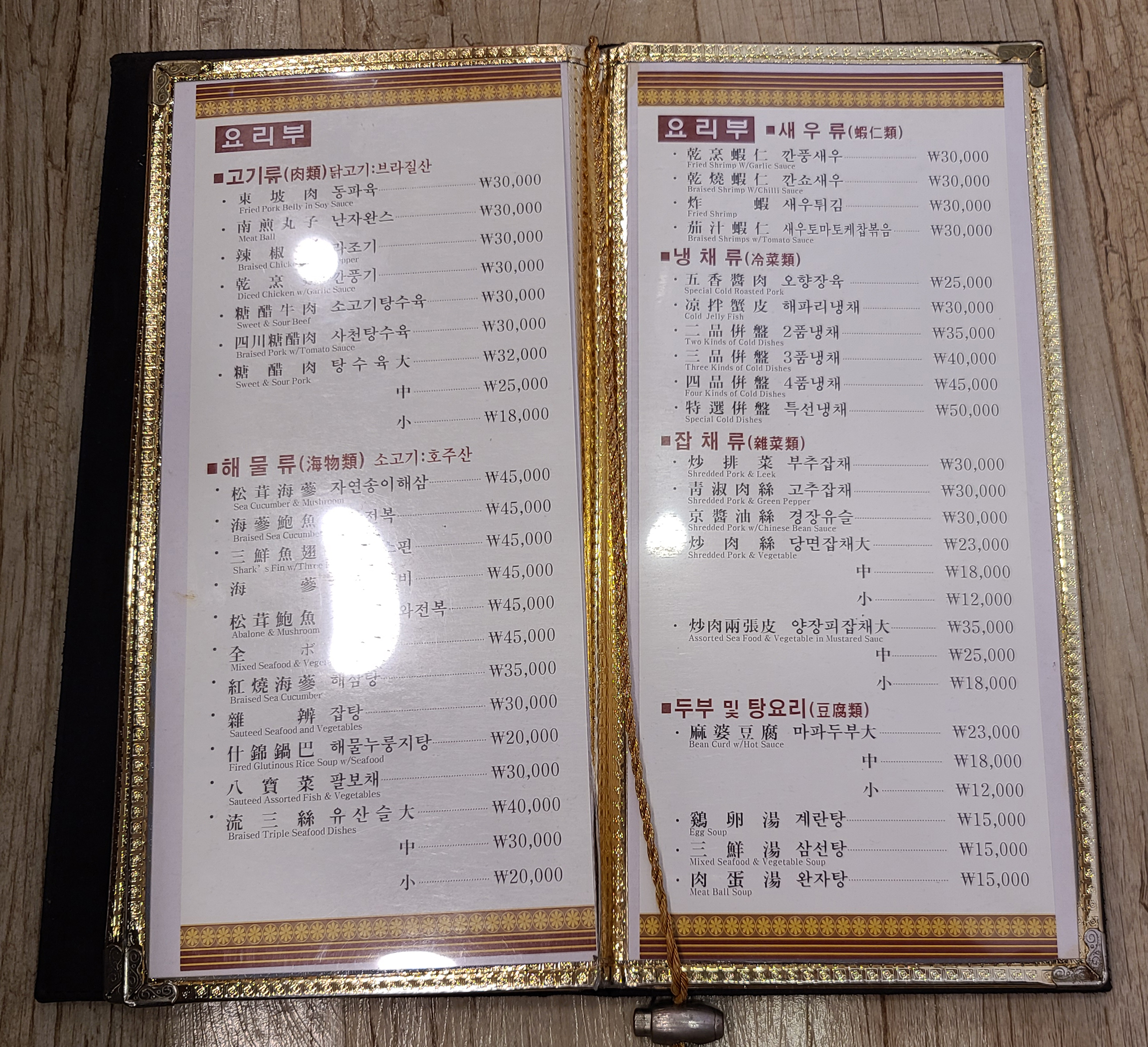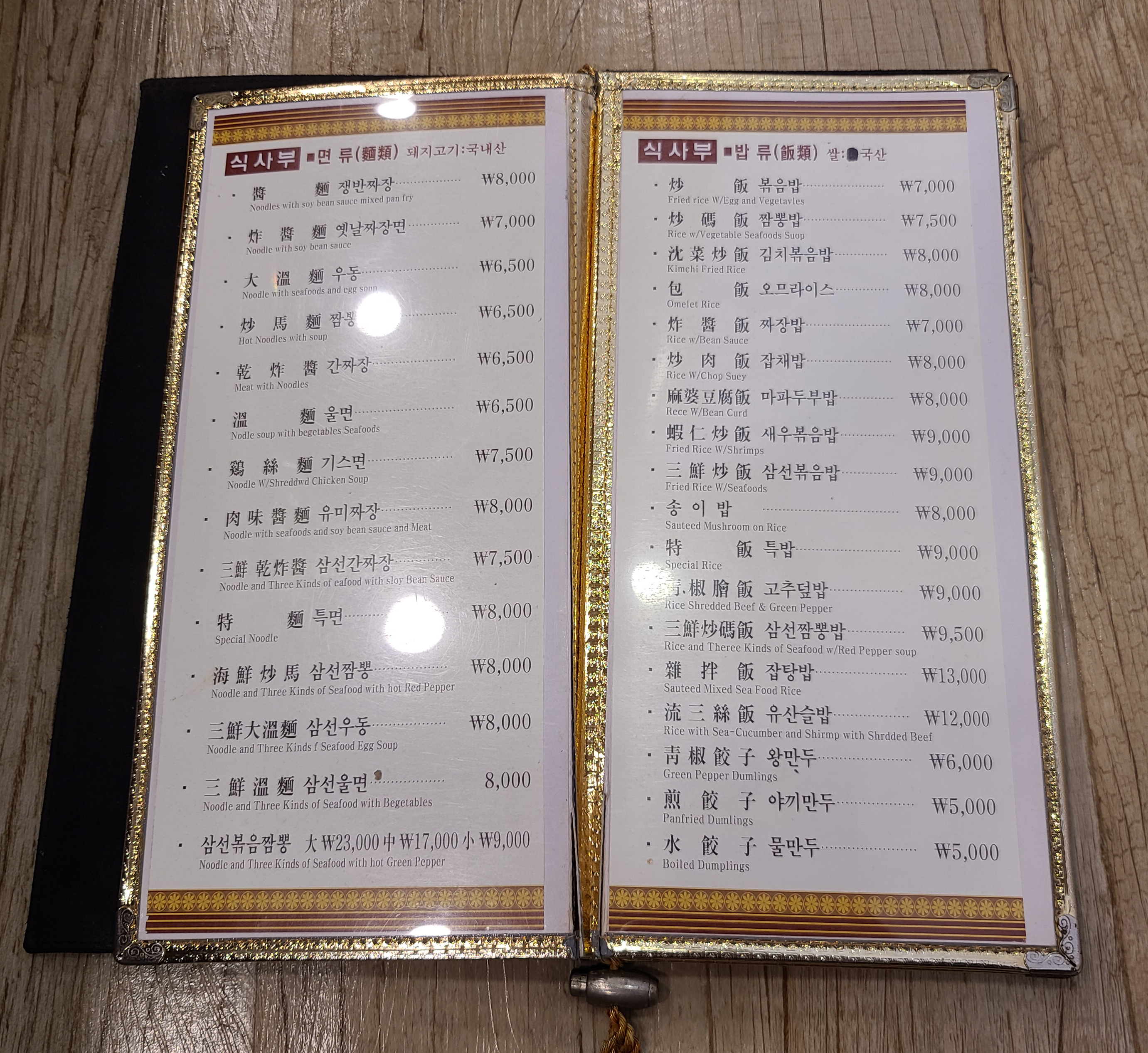 가게의 메뉴는 위와 같습니다. 희래등의 메뉴는 식사부(면류/밥류), 요리부(고기류/해물류/새우류/냉채류/잡채류/두부및탕요리), 코스요리, 세트메뉴 등 이 있었습니다.