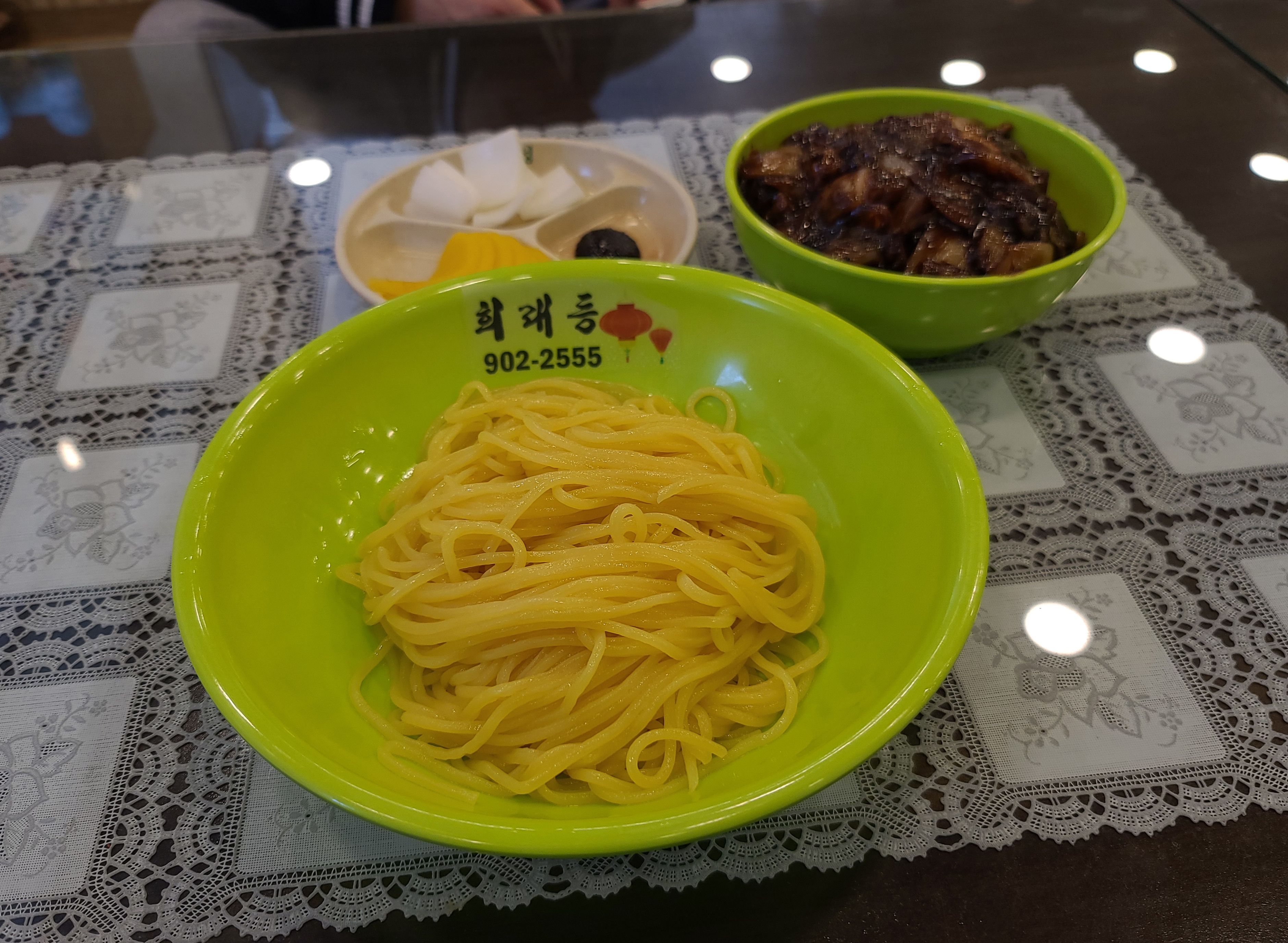 저는 희래등의 간짜장을 주문하였고, 메뉴는 위와 같이 나왔습니다. 짜장의 면과 소스가 따로 분리되어 나왔고, 중국요리 전문점에 빠질 수 없는 단무지와 양파도 함께 나왔습니다.