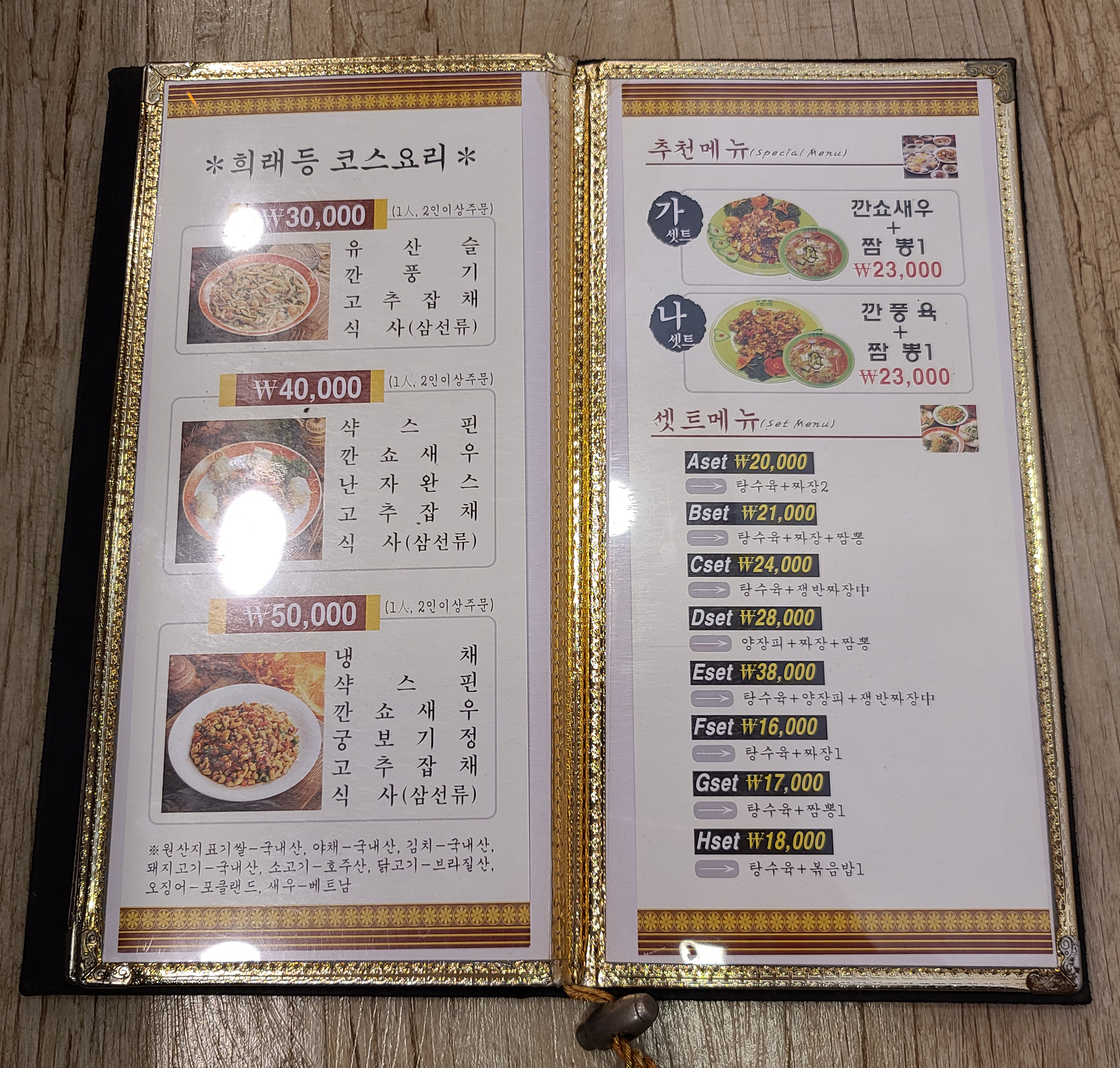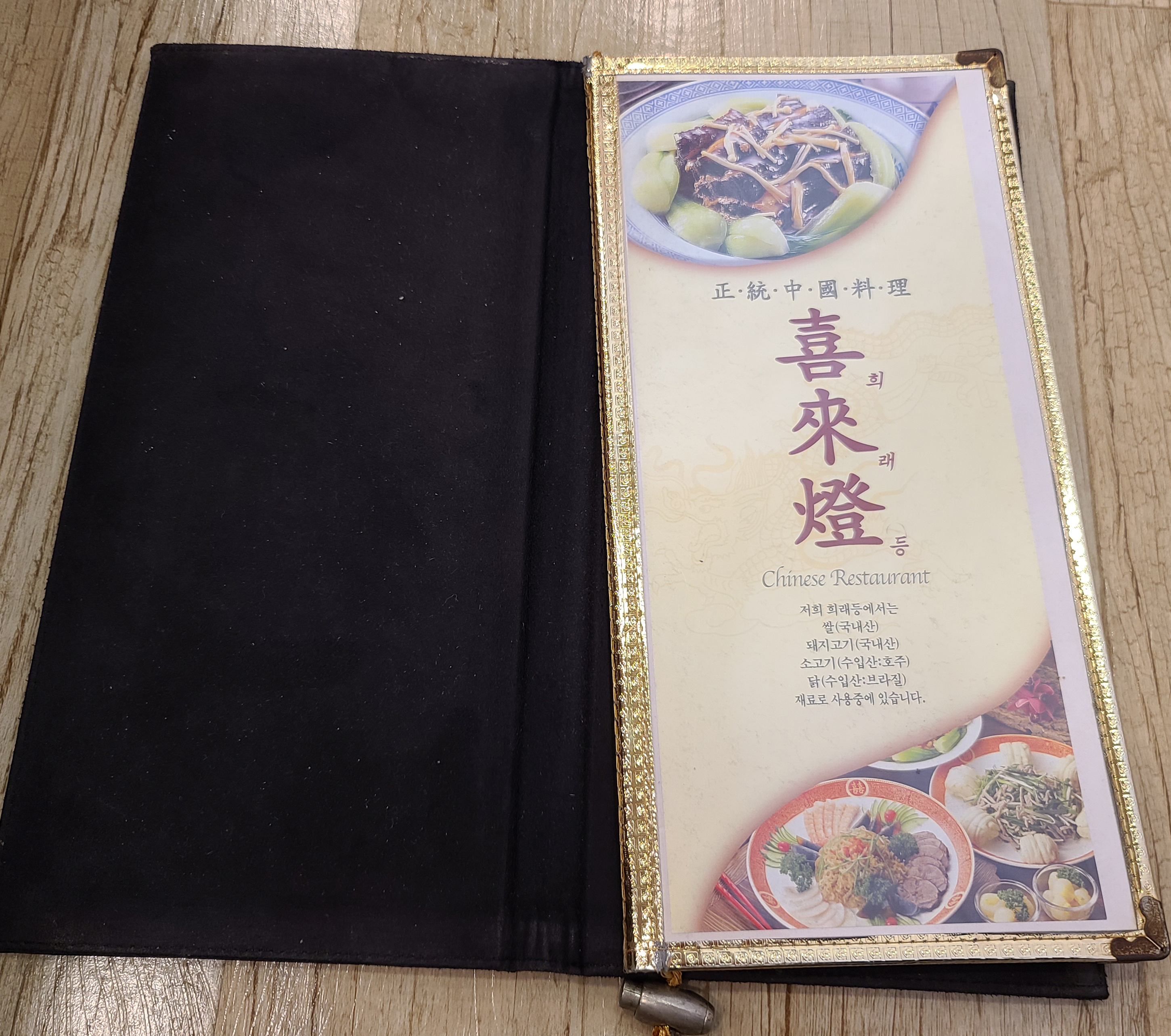 가게의 메뉴는 위와 같습니다. 희래등의 메뉴는 식사부(면류/밥류), 요리부(고기류/해물류/새우류/냉채류/잡채류/두부및탕요리), 코스요리, 세트메뉴 등 이 있었습니다.