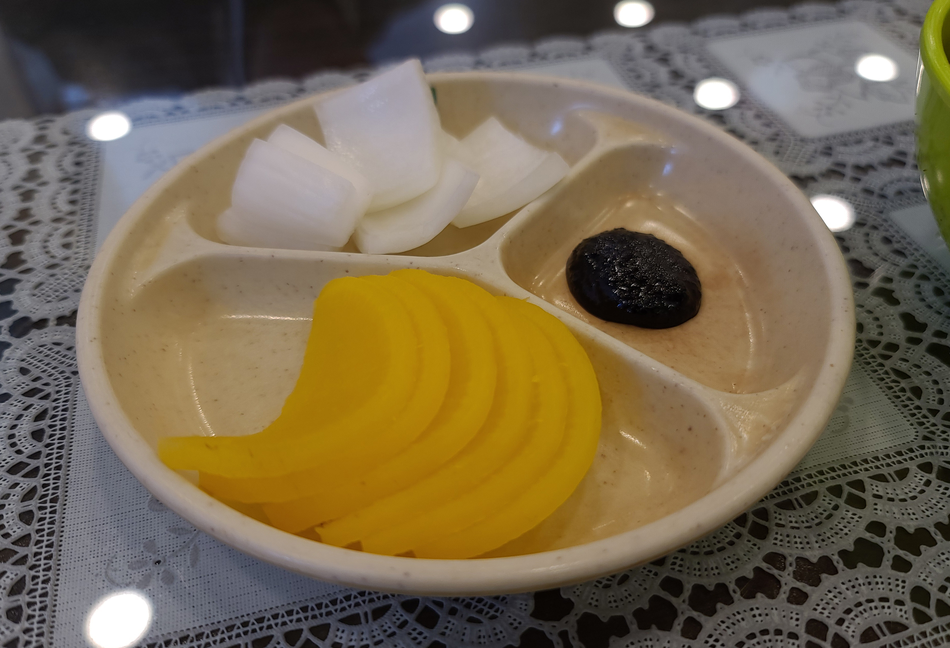 저는 희래등의 간짜장을 주문하였고, 메뉴는 위와 같이 나왔습니다. 짜장의 면과 소스가 따로 분리되어 나왔고, 중국요리 전문점에 빠질 수 없는 단무지와 양파도 함께 나왔습니다.