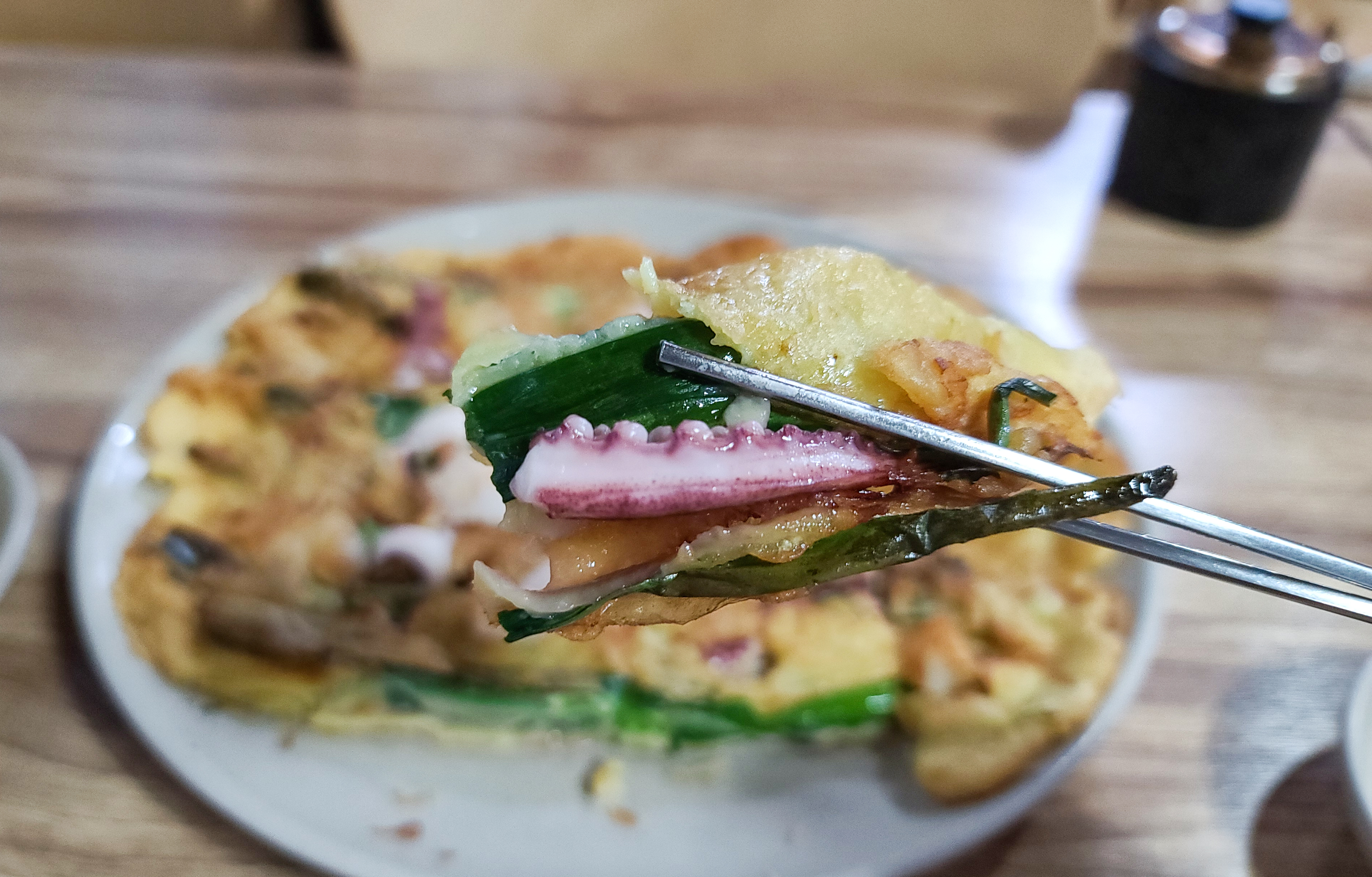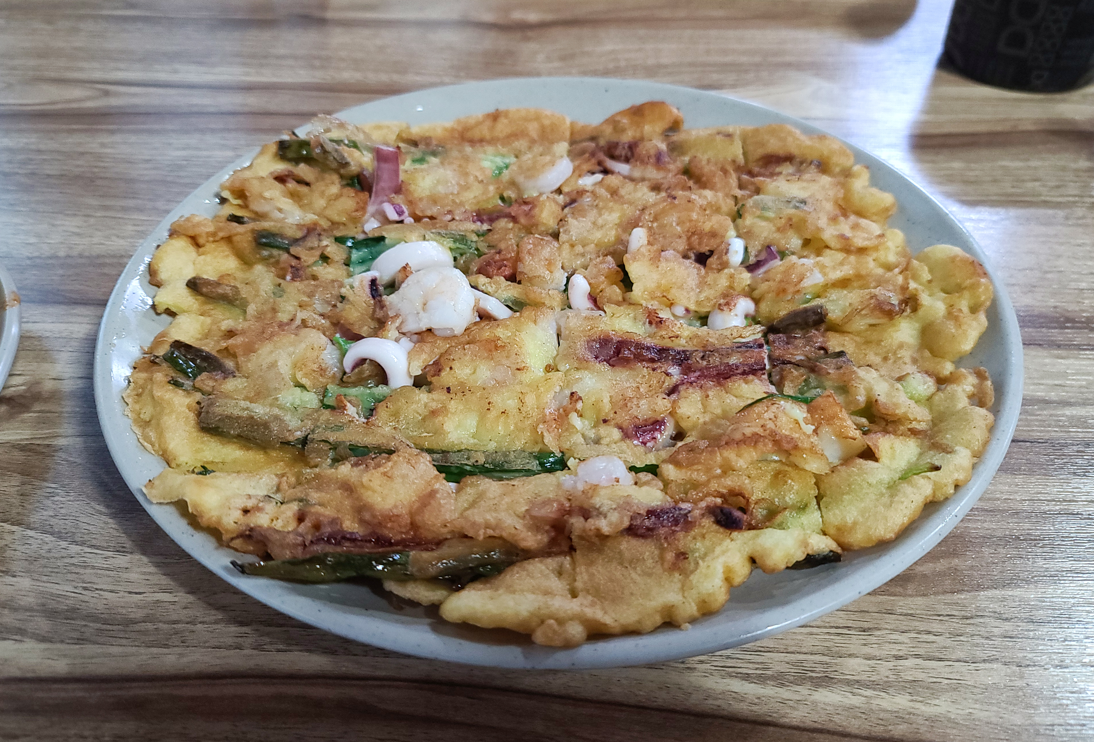 해물파전은 옷이 너무 두껍지 않았고, 해물도 꽤 들어있어서 맛있었습니다. 보통 해물파전에 부침개 옷이 너무 두껍거나 딱딱하면 먹다가 금세 질리는데, 생각보다 부드럽게 잘 부쳐서 먹는데 불편함이 없었습니다.