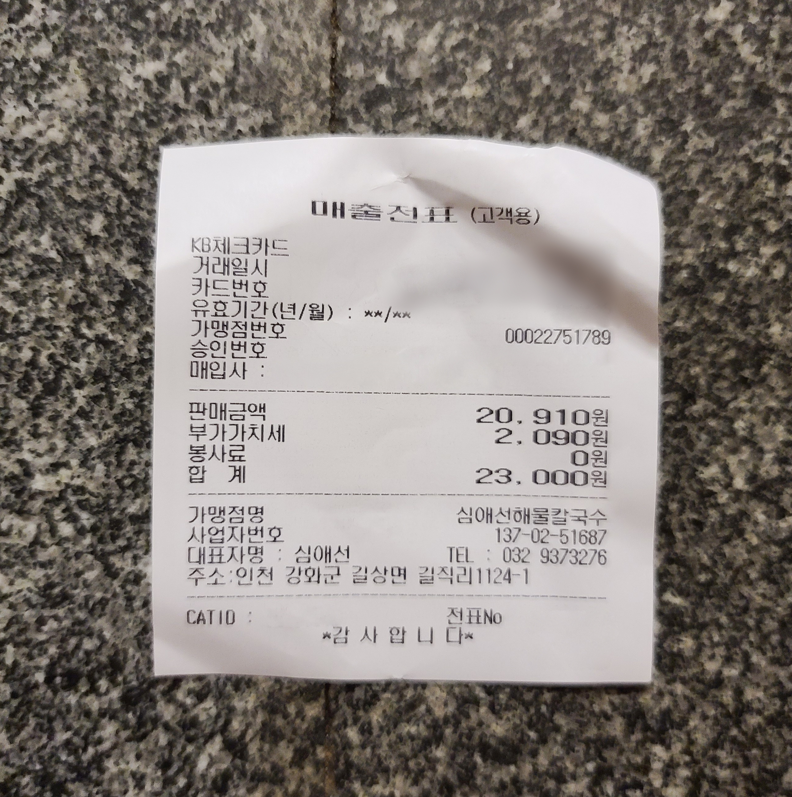 강화 심애선 해물칼국수에서 식사한 금액은 해물칼국수 8,000원, 해물파전 15,000원. 총합계 23,000원 이 나왔습니다. 앞에서도 말씀드렸지만, 강화도에 경이로운 맛의 맛집은 잘 없습니다. 다만 먹을만한 정도였죠. 강화도 여행을 계획하고 계신 분들이 있다면, 한 번쯤 이용해보시는 것을 추천드리고요, 강화의 또 다른 맛집도 다녀온 곳이 있으니 조만간 소개해드리도록 하겠습니다.