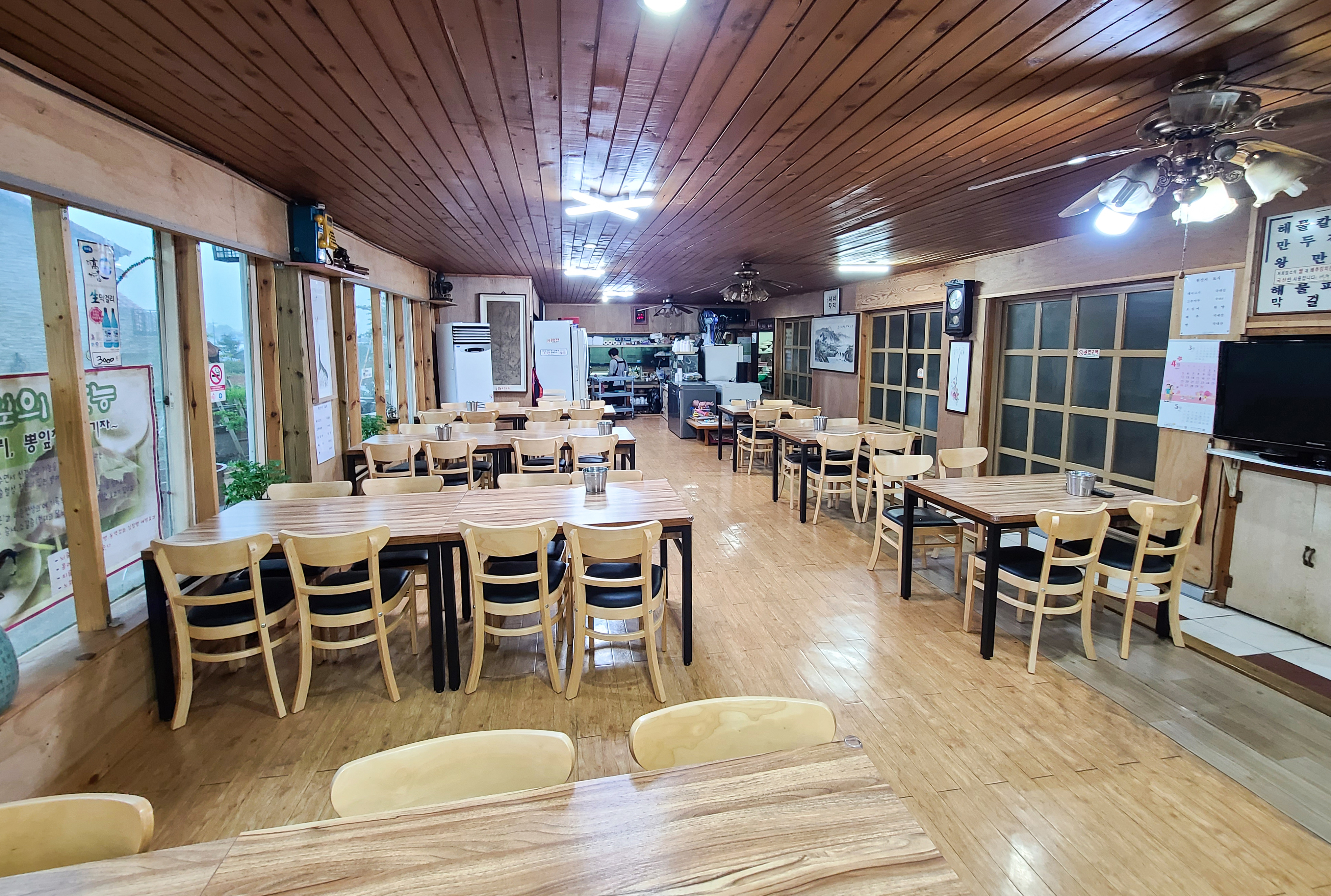 강화 심애선 해물칼국수 가게는 매주 수요일 휴무로 운영 중인 가게였으며, 가게 내부는 꽤 넓었습니다. 다음(DAUM) 리뷰에 2~3살 배기 애기한테, 접시 쥐어 가져다준다 해서 가면 애가 막 뛰어놀고 시끄러울 줄 알았는데, 큰 규모의 가게에 사장님 포함 총 3분 이서만 있다 보니 적막함만 감돌더라고요.