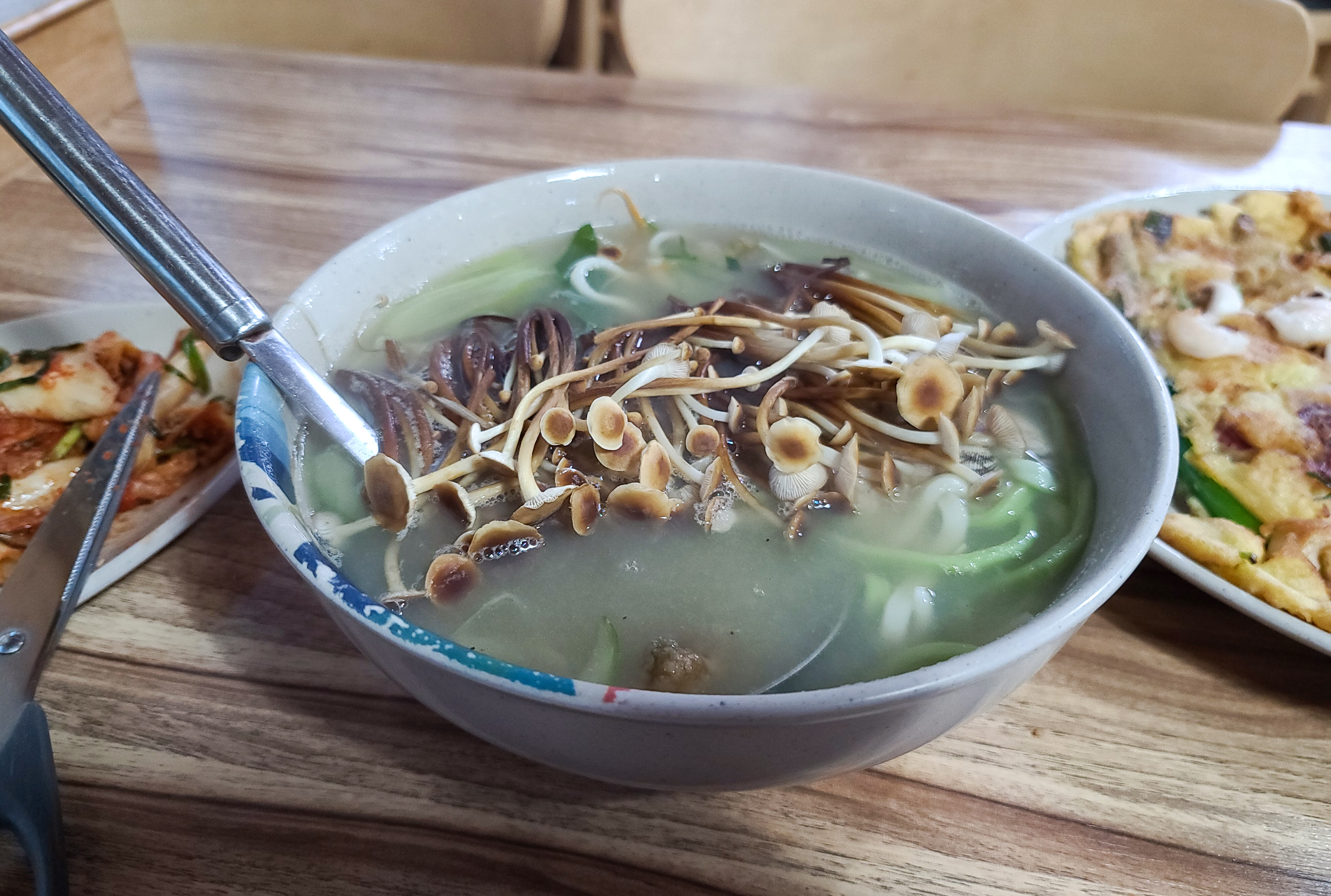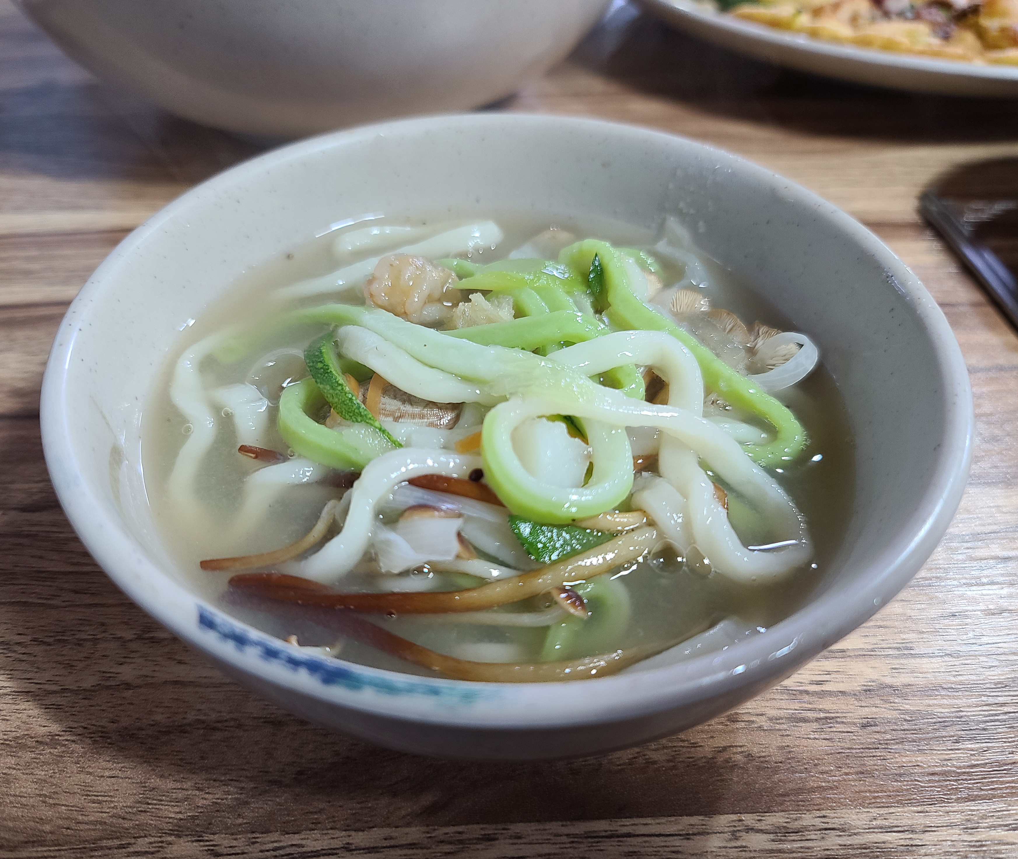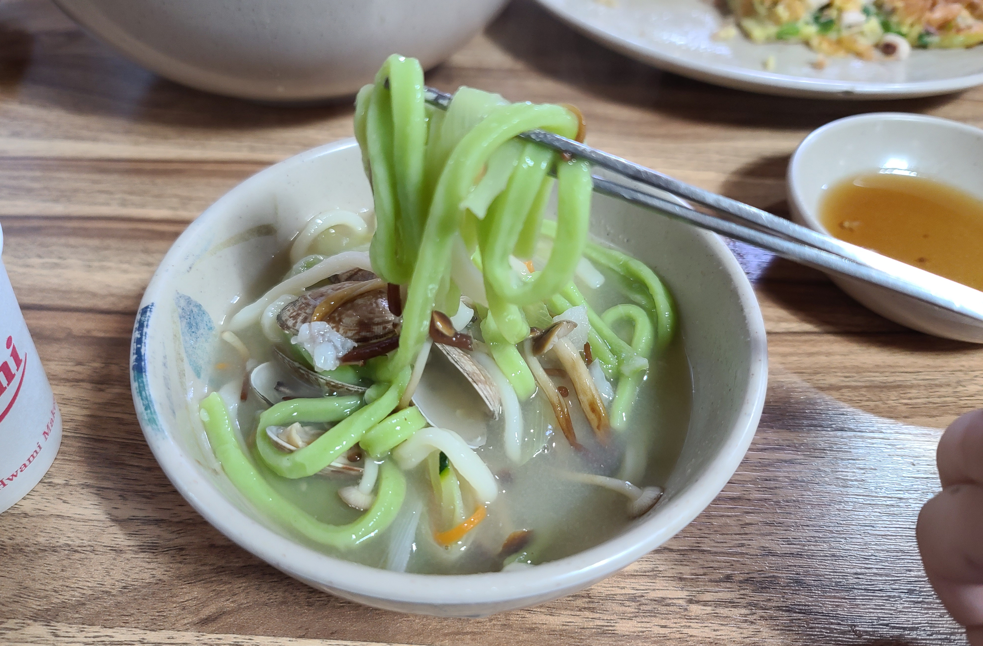칼국수의 면 색깔도 독특하여 버섯의 종류를 여쭤본 김에 같이 물어보니, 시금치를 갈아 넣은 면이라 하시더라고요. 계절별로 뽕잎을 넣기도 하신다고 합니다. 칼국수의 맛은 전체적으로 자극적이지 않고, 사람들 말에 가쓰오부시 맛이 강하다 하는데, 가쓰오부시의 맛도 크게 강하다 생각 들지는 않았습니다.