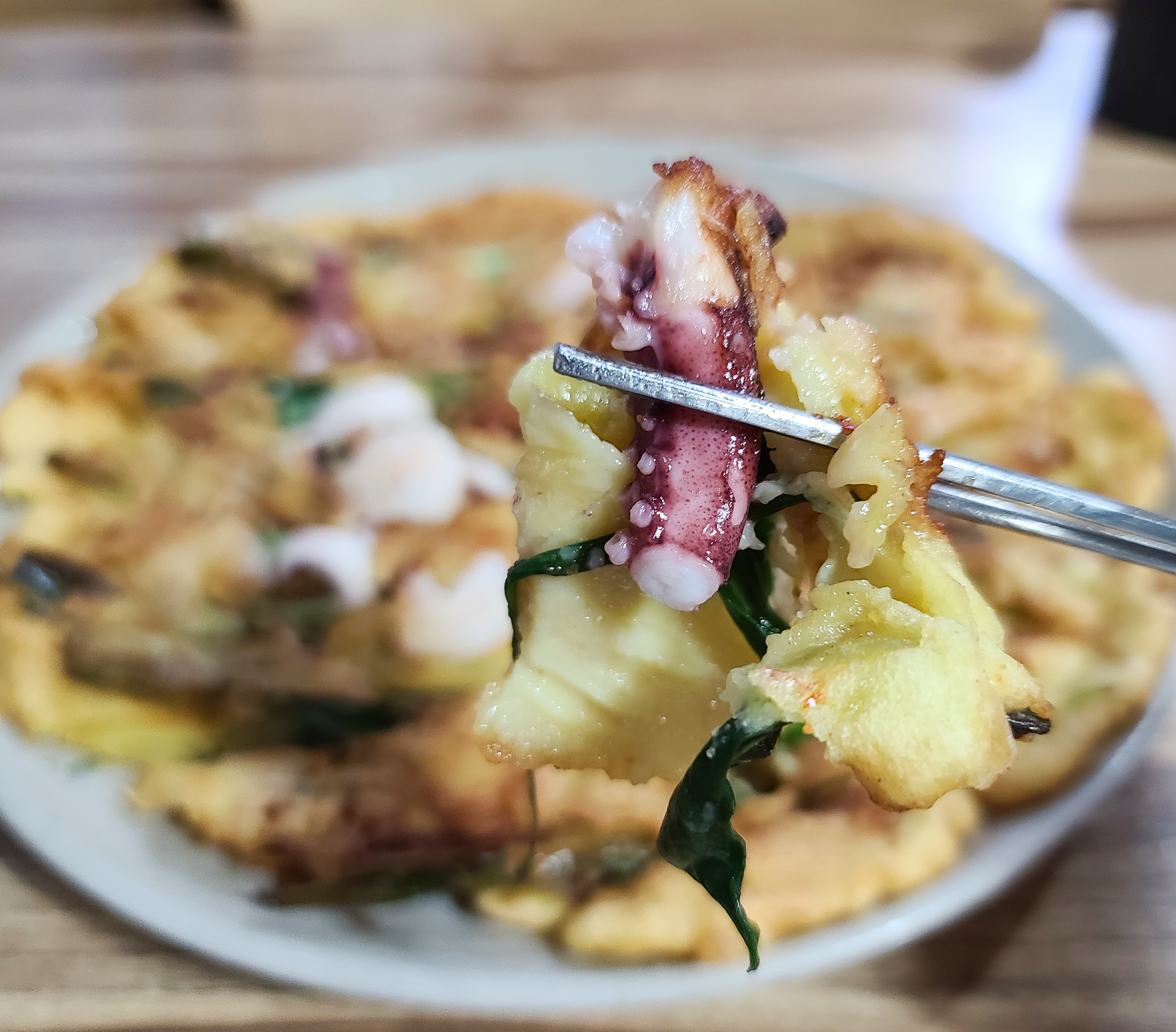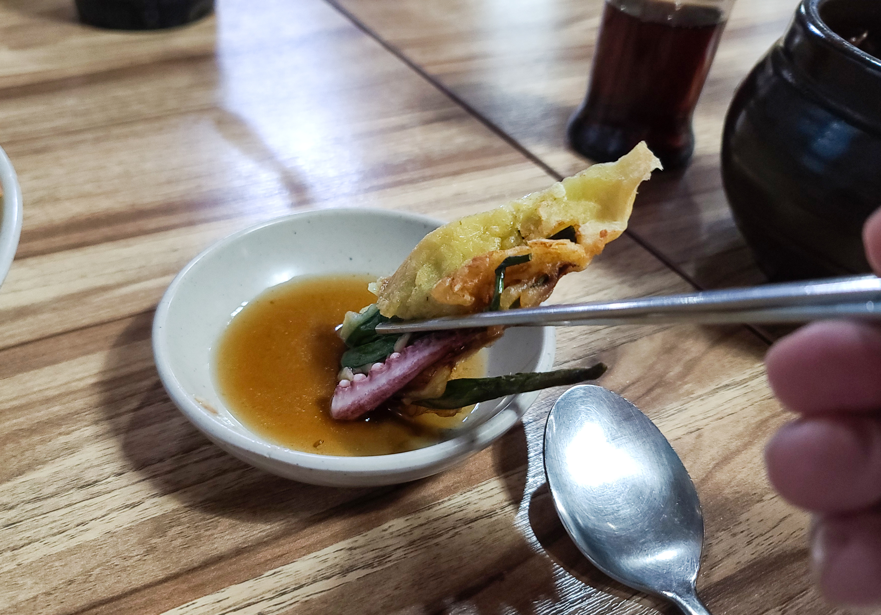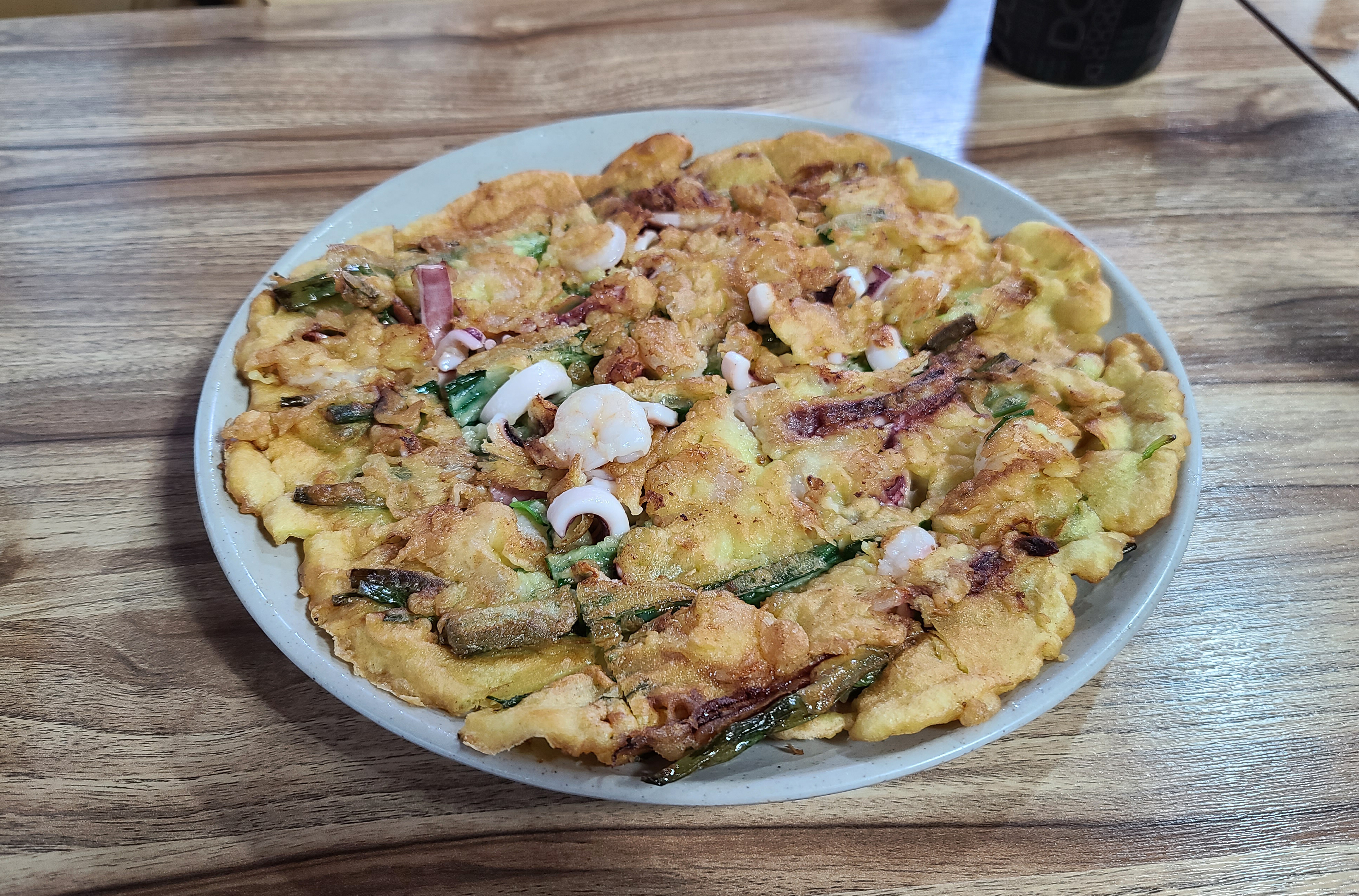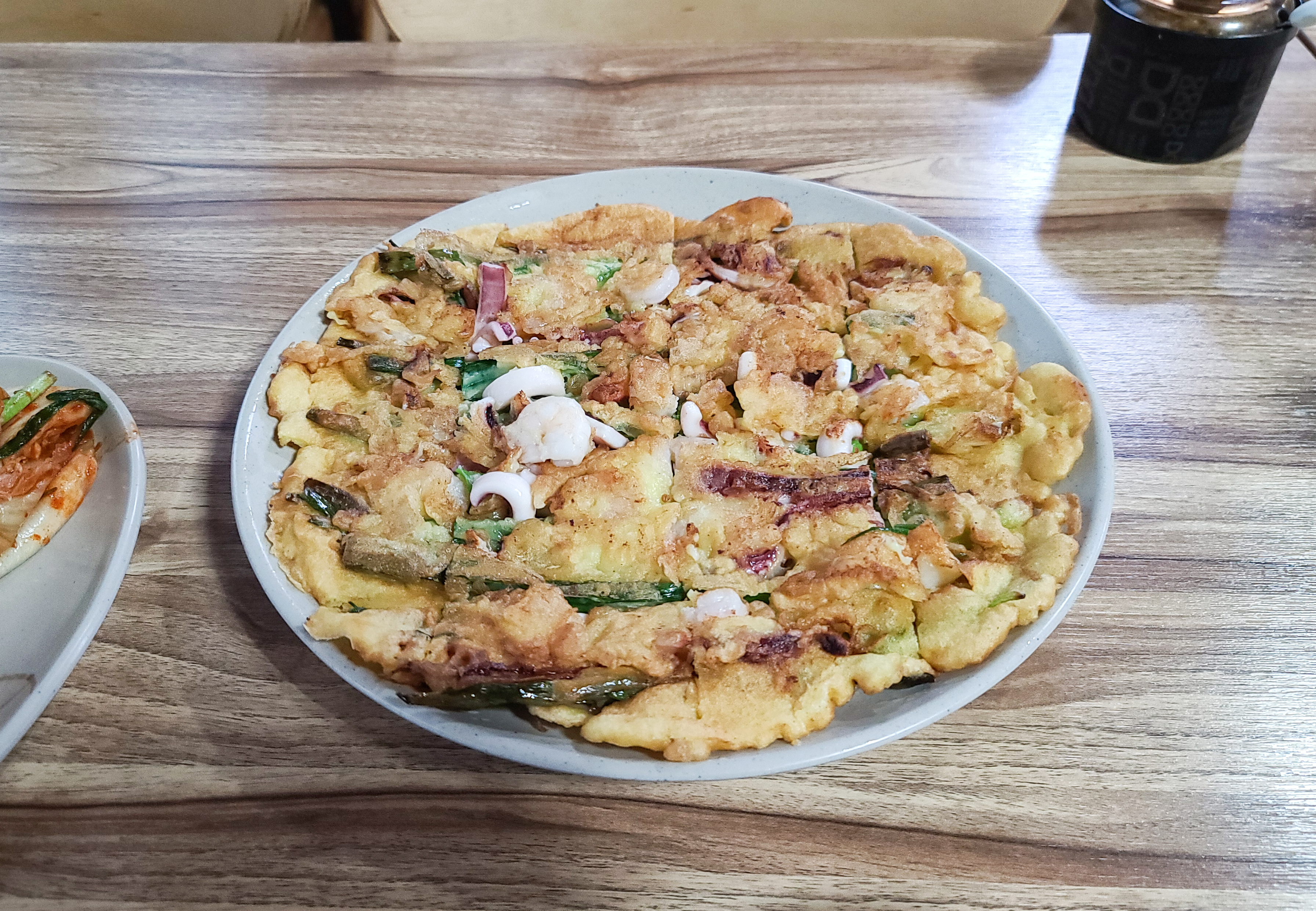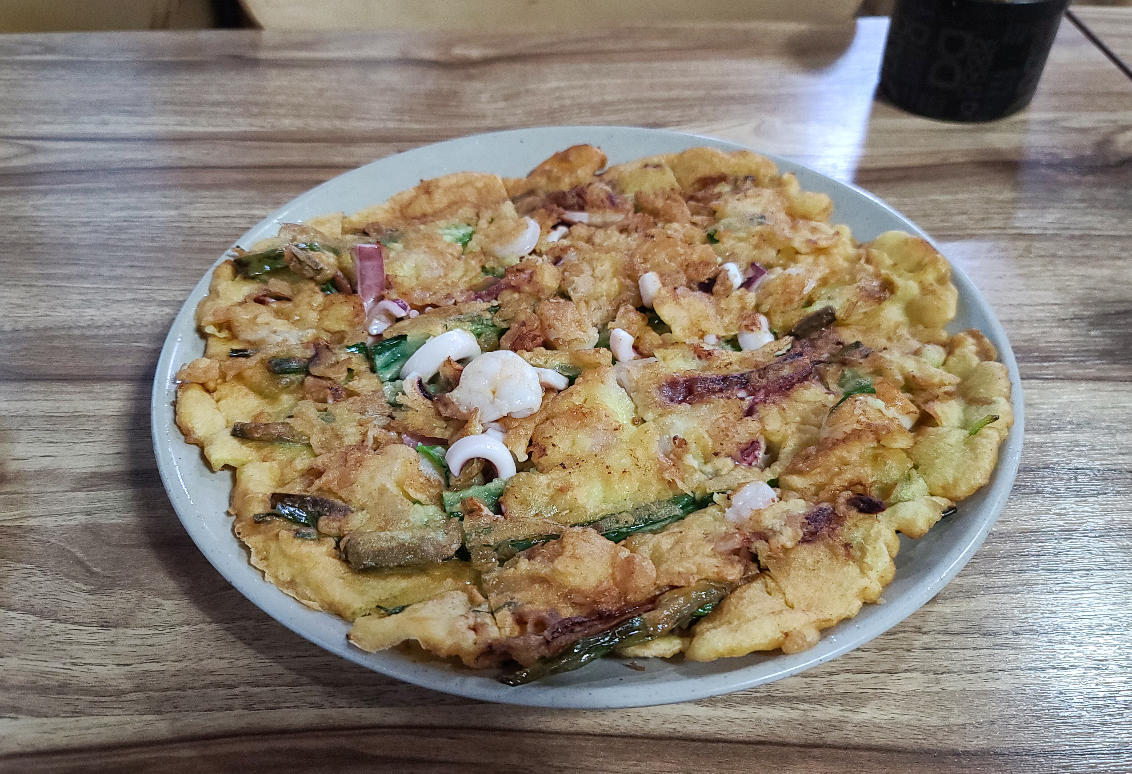 해물파전은 옷이 너무 두껍지 않았고, 해물도 꽤 들어있어서 맛있었습니다. 보통 해물파전에 부침개 옷이 너무 두껍거나 딱딱하면 먹다가 금세 질리는데, 생각보다 부드럽게 잘 부쳐서 먹는데 불편함이 없었습니다.