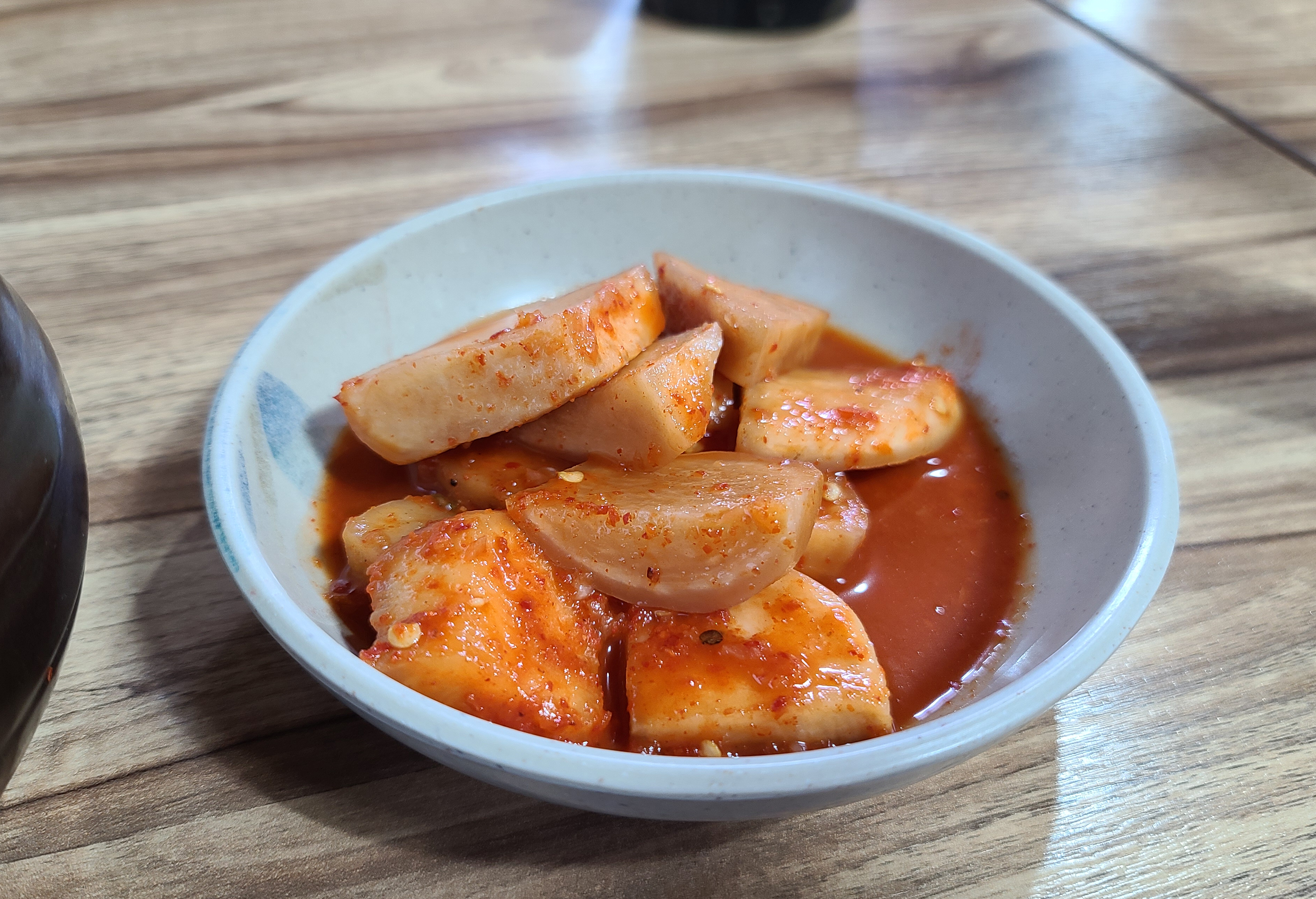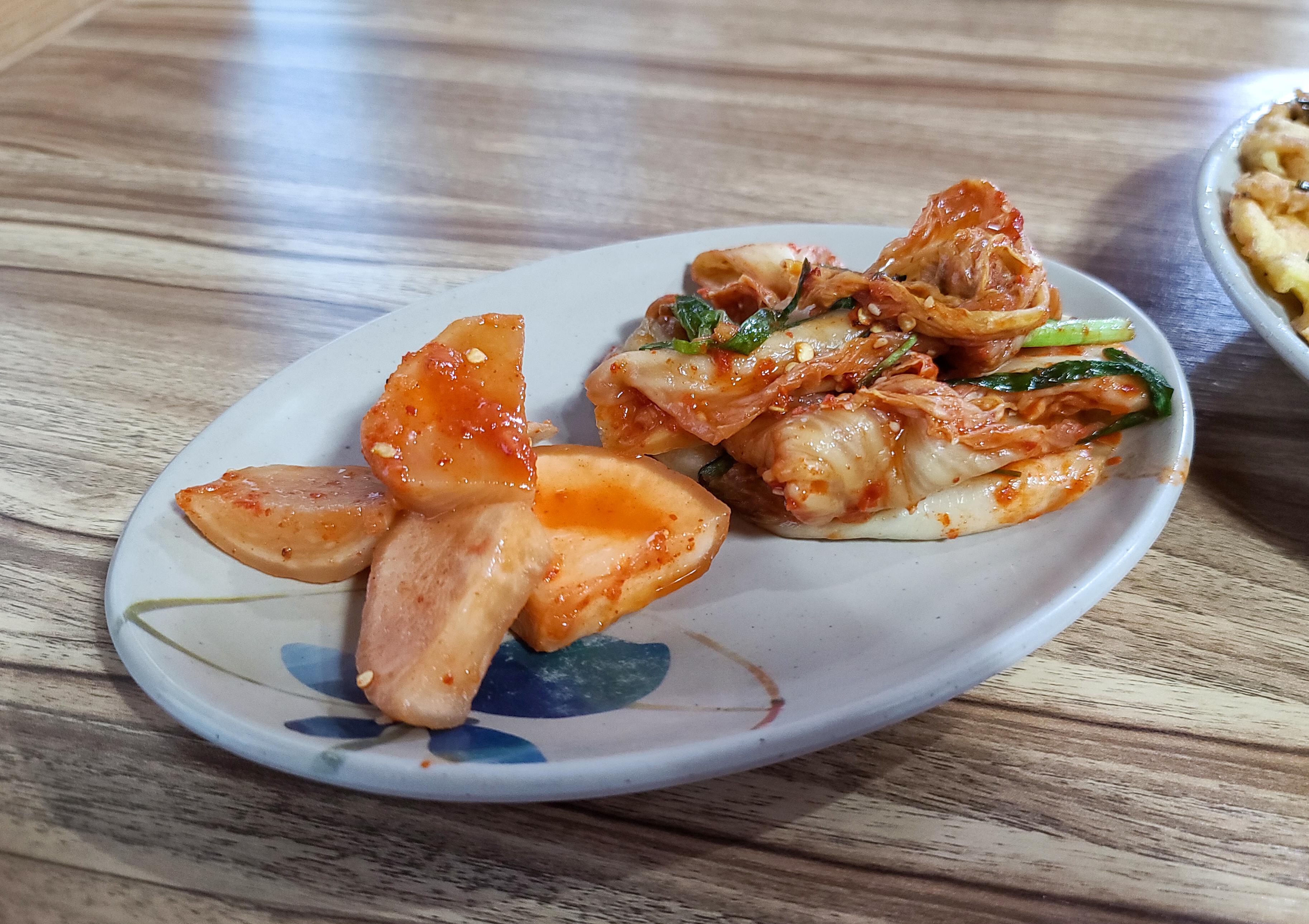 곧이어 배추김치와 강화순무로 만든 김치와 함께 해물파전이 나왔습니다. 일단 칼국수 전문점답게 김치는 맛있게 담가졌고요, 순무김치도 아삭아삭 먹을만했습니다.