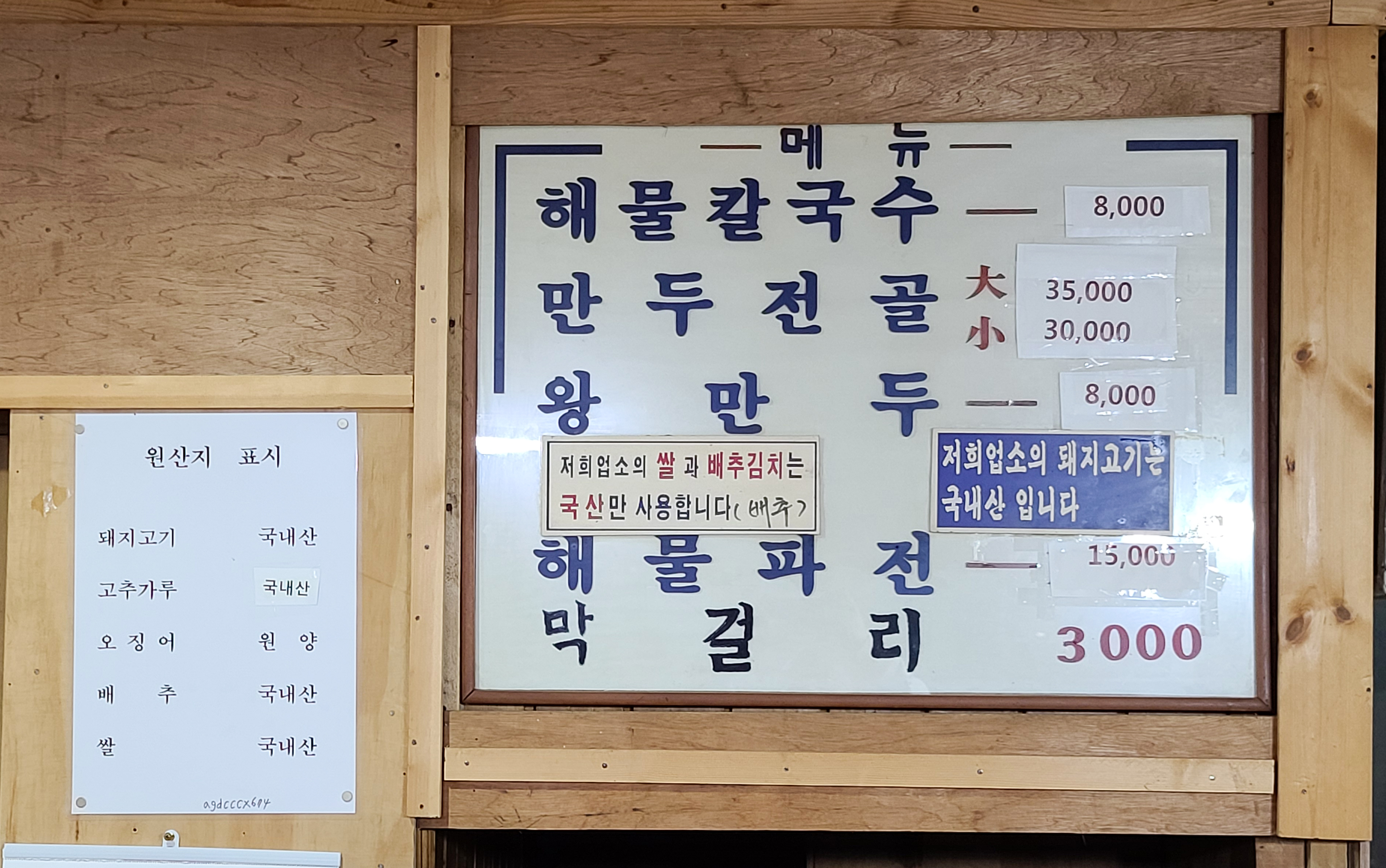 심애선 칼국수 가게의 메뉴는 위와 같습니다. 해물칼국수, 만두전골, 왕만두, 해물파전, 막걸리 가 있었고, 저는 원래는 해물칼국수만 먹으려 했지만, 해물파전도 맛있다고 하길래 해물파전도 같이 주문해보았습니다.