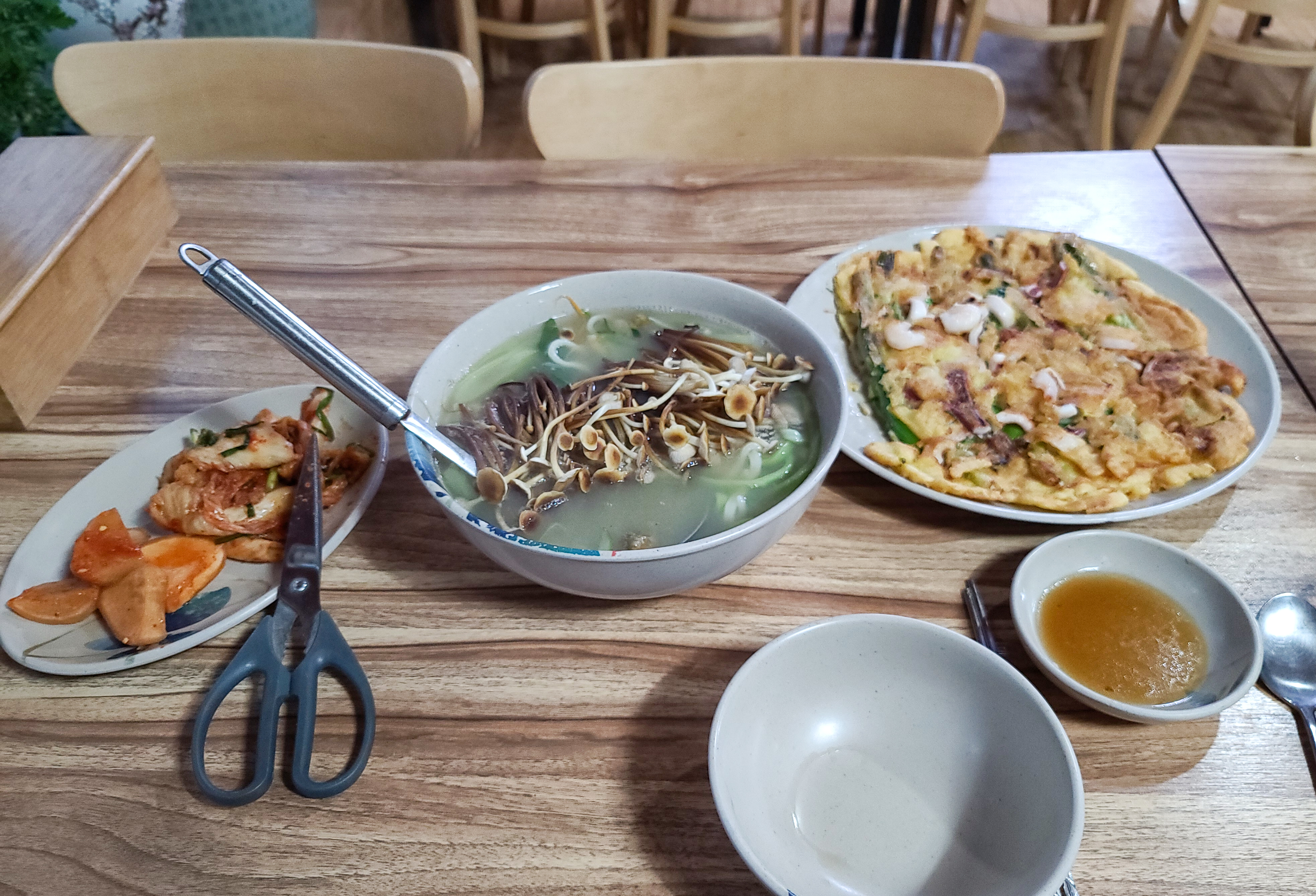 저는 심애선 해물칼국수의 해물파전이나 칼국수 두루 맛있게 먹었고요, 1인이 먹기에는 양이 많아서 먹다가 남겼고요, 독특하게 할라피뇨 다져놓은(?) 게 있어서, 칼국수에 곁들여 먹을 수도 있었습니다. 딱히 위생에 문제도 없어 보였 고요.