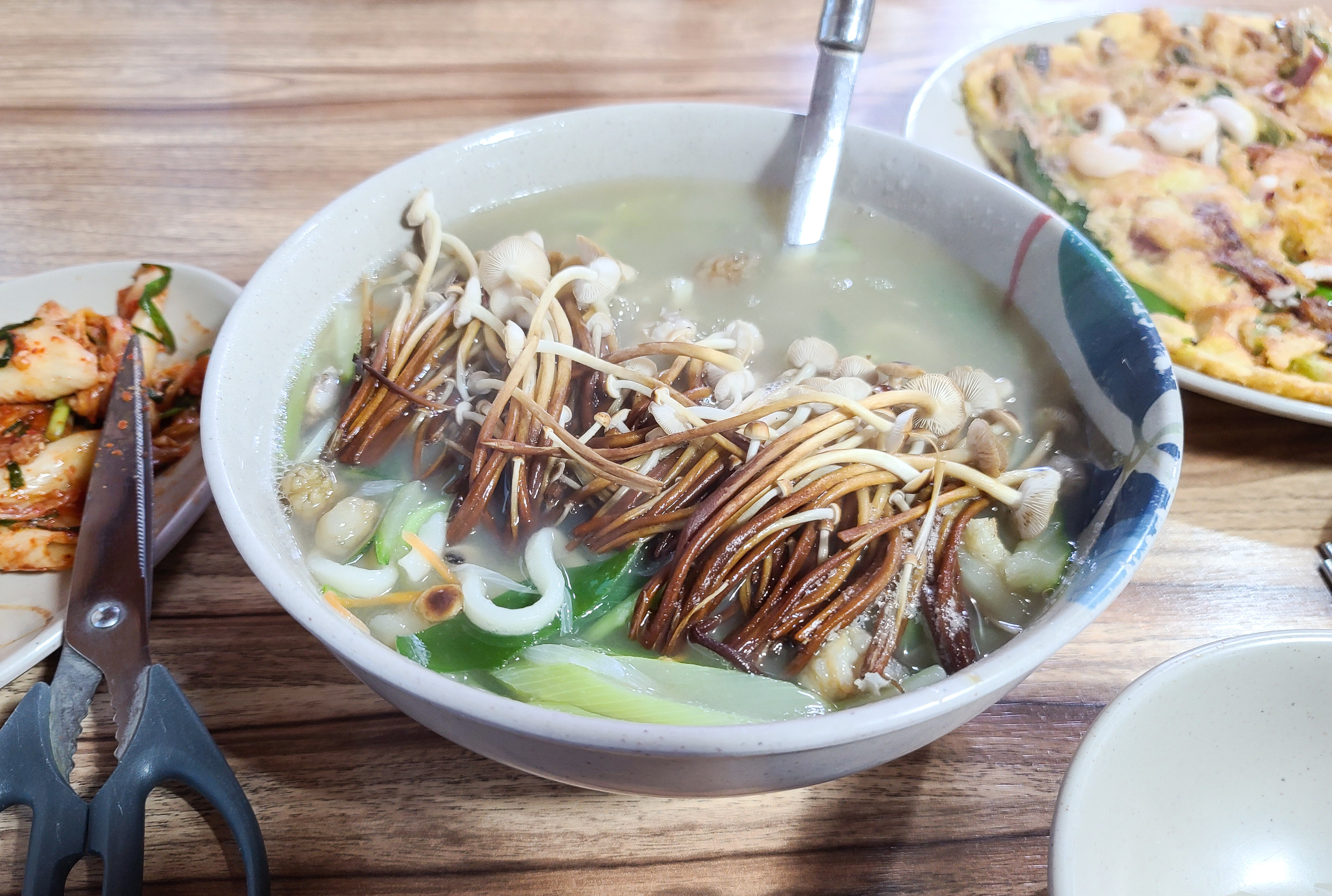 해물파전을 먹고 있는데 곧이어 주문한 해물칼국수가 나왔습니다. 해물칼국수에는 만가닥 버섯(감나무)과 황태, 오만둥이, 대파, 양파, 당근 등 이 들어갔습니다. 저는 처음 보는 버섯의 모습과 쫄깃한 식감에 무슨 버섯일까 하도 궁금하여, 인터넷으로 비슷한 버섯을 검색해보았는데, 결국 완벽하게 비슷한 결과물은 얻을 수 없었고, 사장님께 직접 여쭤보니 '만가닥버섯' 이라고도 하고 '감나무 버섯'이라고도 한다고 하더라고요. 강화에서 직접 재배한 버섯이라고 합니다.