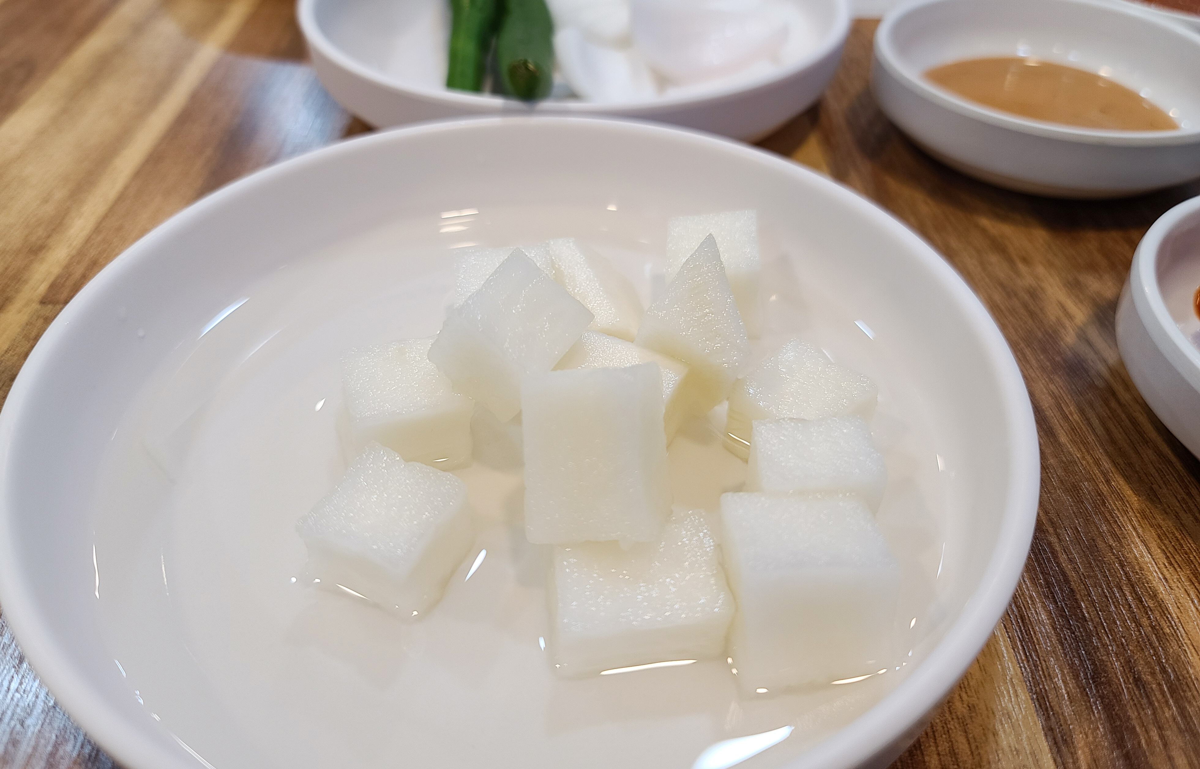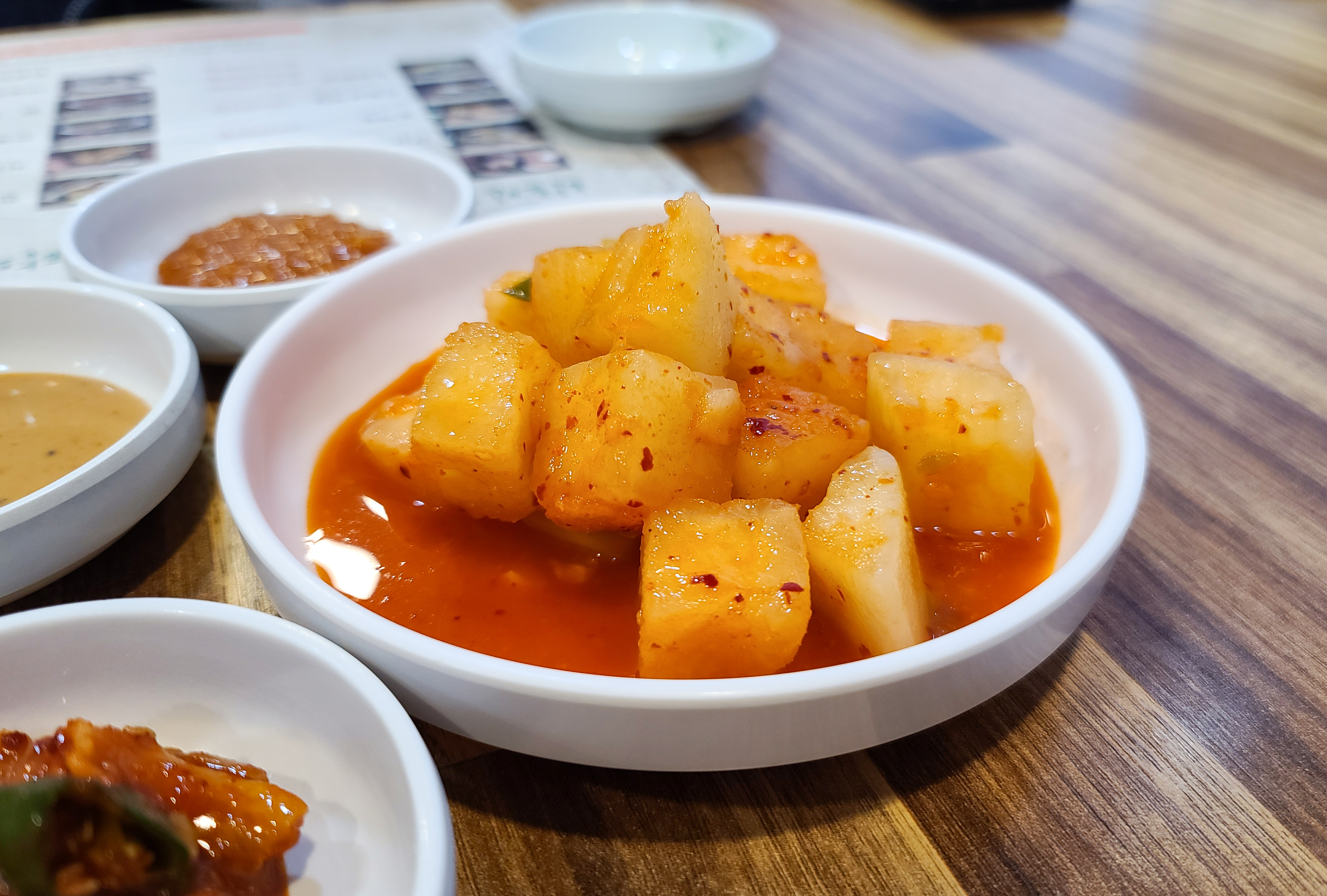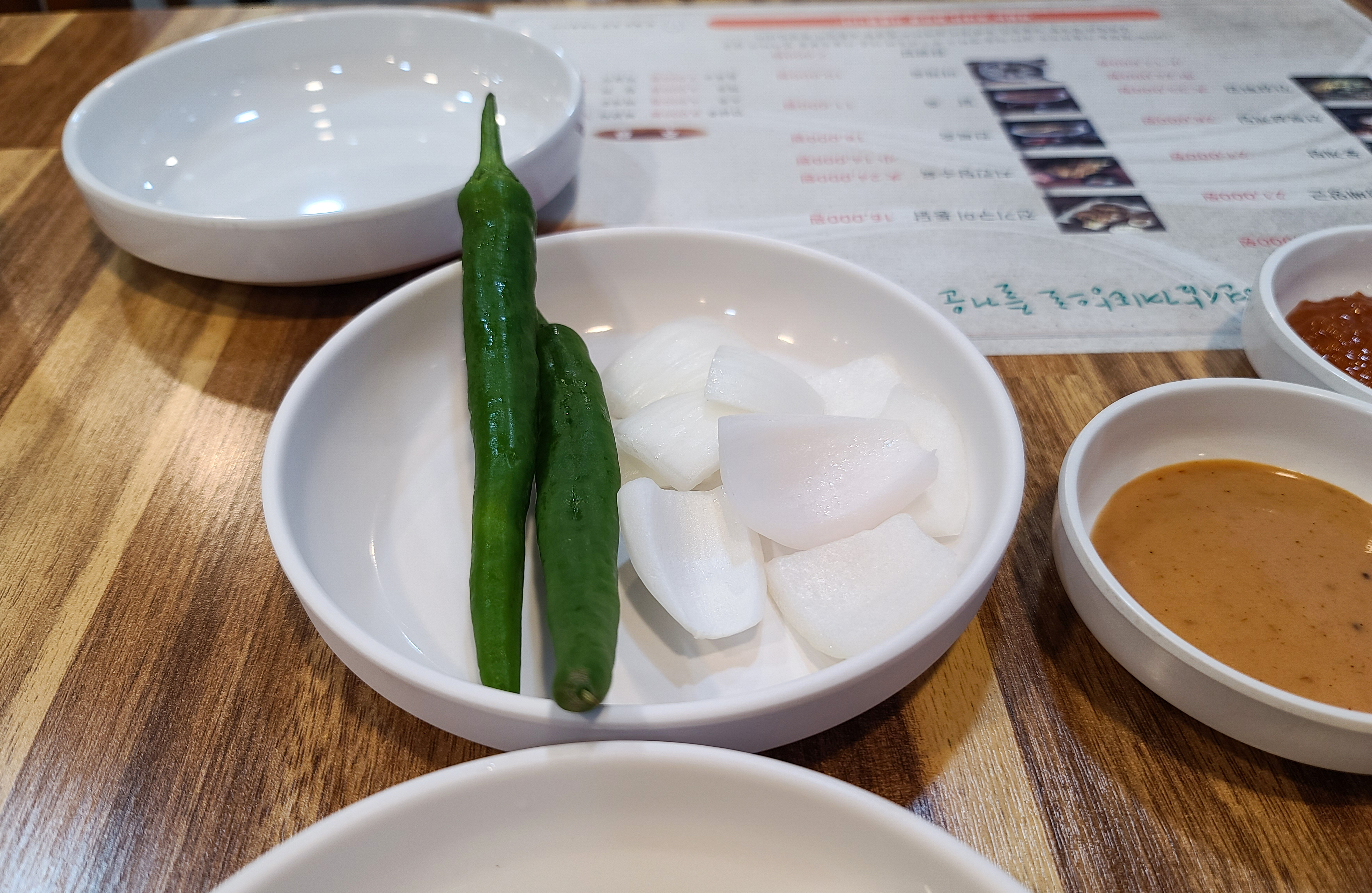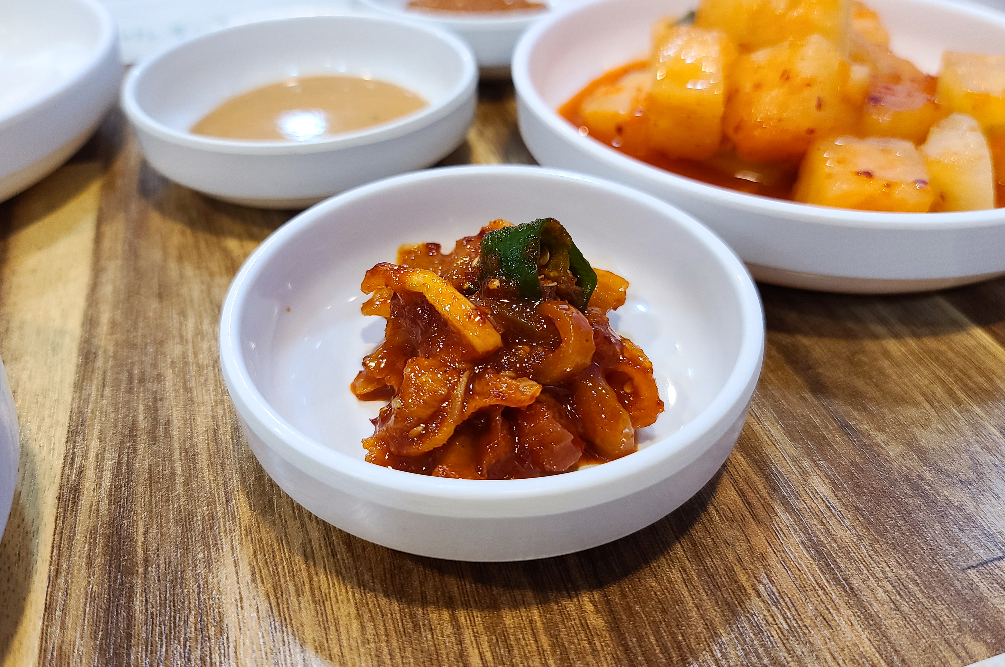 이내 반찬들이 함께 제공되었고, 반찬들은 깍두기, 오징어젓, 치킨무, 양파, 고추, 소스류 가 제공되었습니다. 반찬들은 대부분 깔끔하고 맛이 있었습니다. 젓갈을 좋아하는 아버지는 추가로 반찬을 더 드시더라고요.