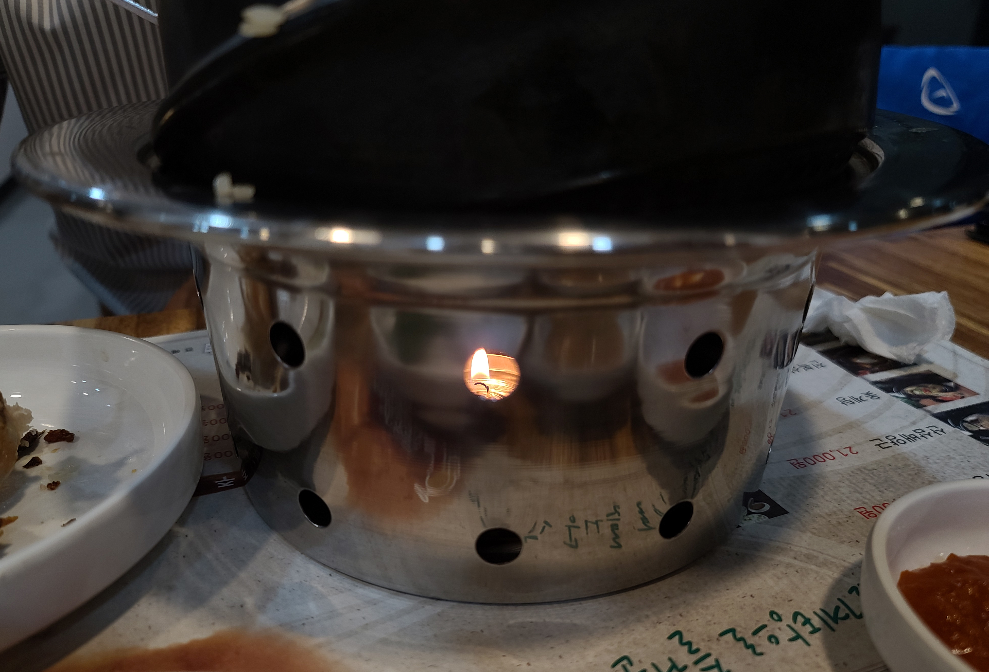 아버지께 대접한 전복 삼계탕은 기존의 삼계탕 위에 계란 지단이 고명으로 올라가 있었으며, 전복 2마리가 들어있는 형태였습니다. 특별히 캔들을 이용해 삼계탕이 식지 않도록 뚝배기 밑에서 은은하게 데워주는 것도 있었습니다. (후에 들으니 맛은 제가 먹은 삼계탕과 큰 차이는 없으셨다고 합니다.)