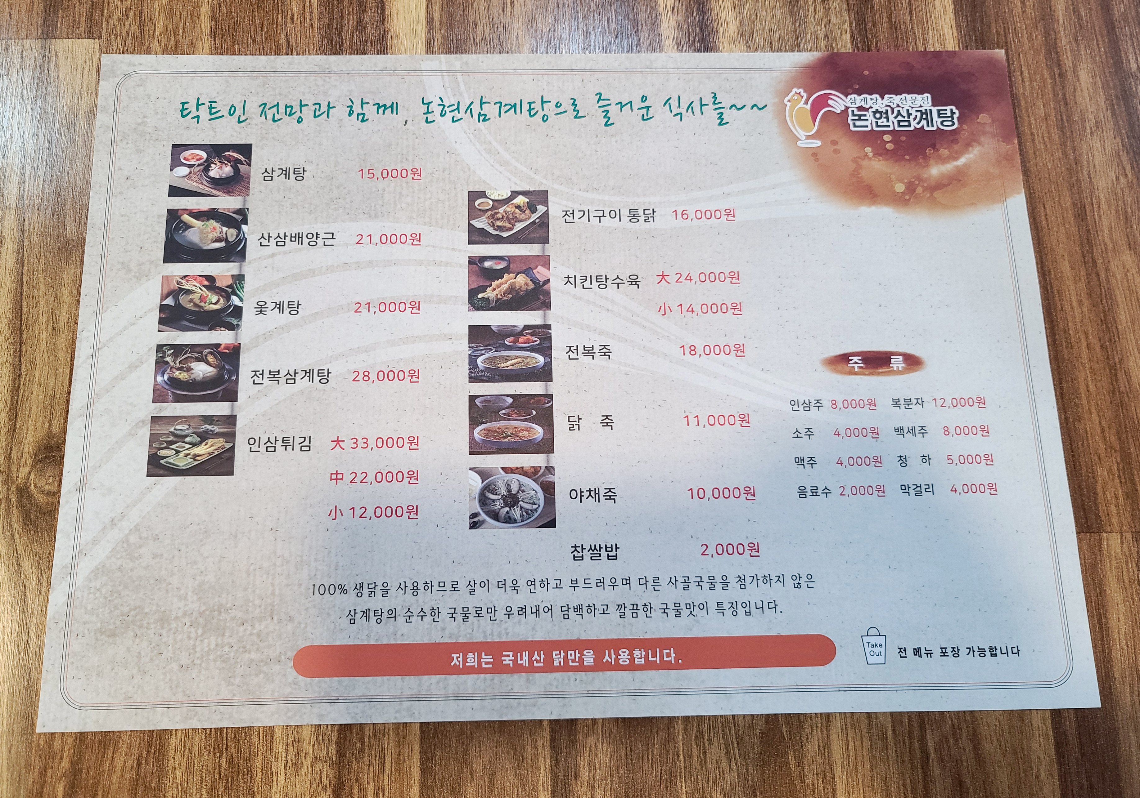 자리를 잡고 메뉴를 살펴보았습니다. 자곡동 논현삼계탕의 메뉴는 위와 같았습니다. 삼계탕, 산삼배양근, 옻계탕, 전복삼계탕, 인삼튀김, 전기구이통닭, 치킨탕수육, 전복죽, 닭죽, 야채죽, 찹쌀밥 등 이 있었습니다. 저희는 삼계탕, 전복삼계탕, 전기구이 통닭을 주문하였습니다.