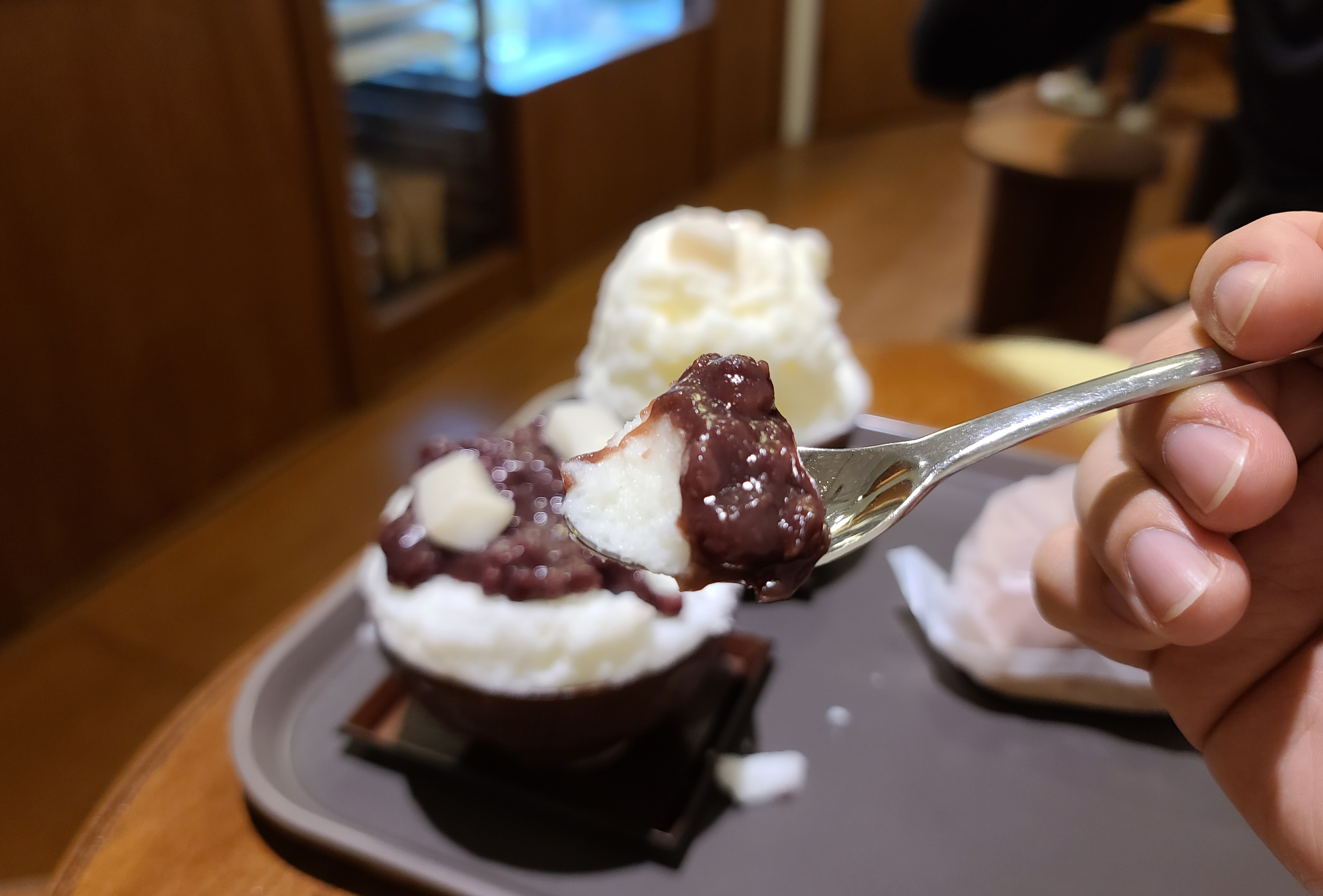 먼저 가게 분위기도 깔끔하면서 아늑한 느낌이 좋았고, 가마솥팥빙수와 밀크 팥빙수 메뉴 둘 다 맛이 괜찮았습니다. 팥 디저트 전문점답게 단팥빵도 괜찮았고, 팥빙수의 앙금도 맛이 너무 달지도 않고 좋았습니다. 고명으로 떡이 올라가는데, 인절미 떡 같더라고요.