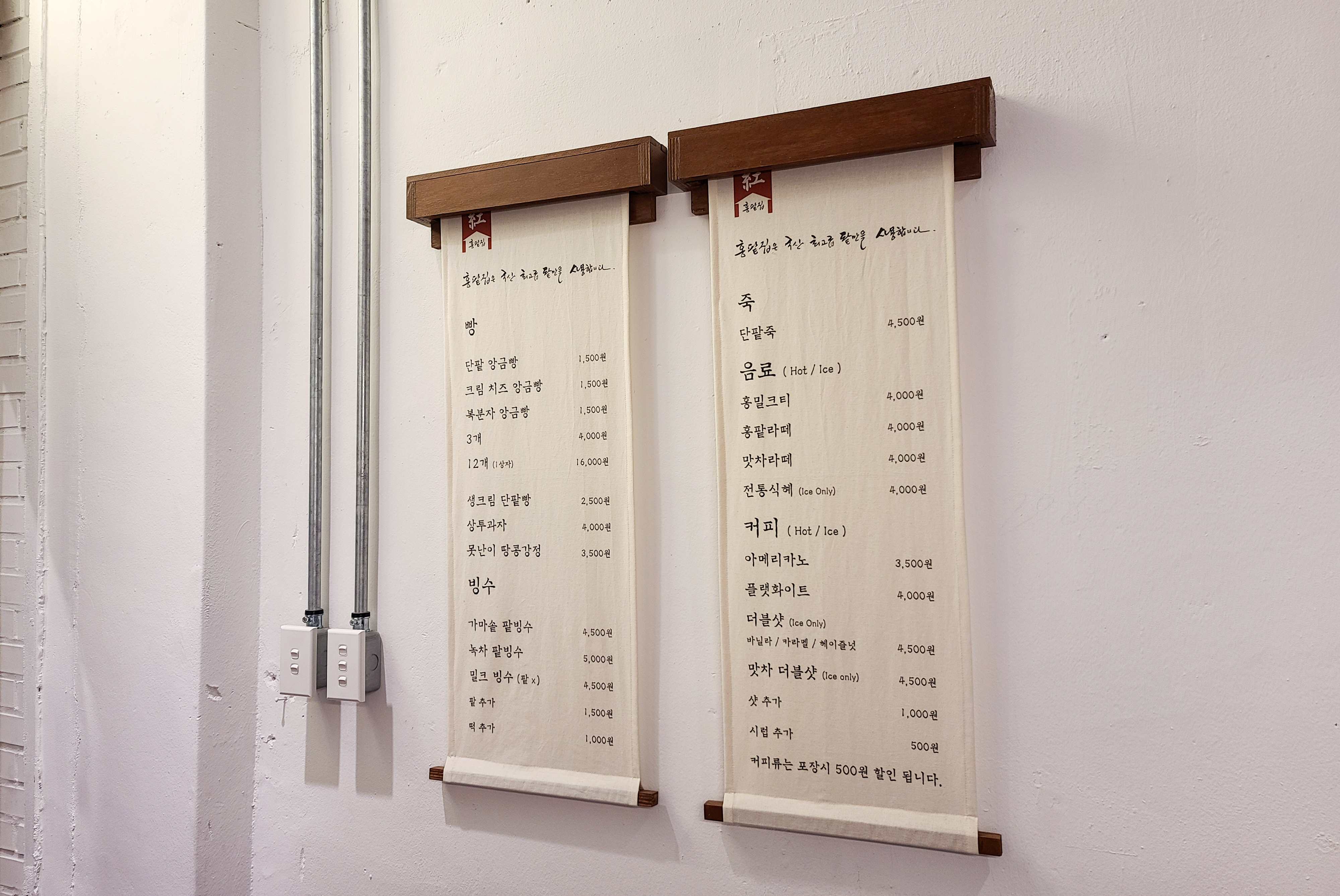홍팥집 가게의 메뉴는 위와 같습니다. 단팥앙금빵, 크림치즈앙금빵, 복분자앙금빵, 생크림단팥빵, 상투과자, 못난이땅콩강정, 가마솥팥빙수, 녹차팥빙수, 밀크빙수, 단팥죽, 홍밀크티, 홍팥라떼, 맛차라떼, 전통식혜, 아메리카노, 플랫화이트, 더블샷(바닐라/카라멜/헤이즐넛), 맛차더블샷 등 이 있었습니다. 저는 가마솥 팥빙수와 밀크빙수, 생크림단팥빵을 주문하였습니다.