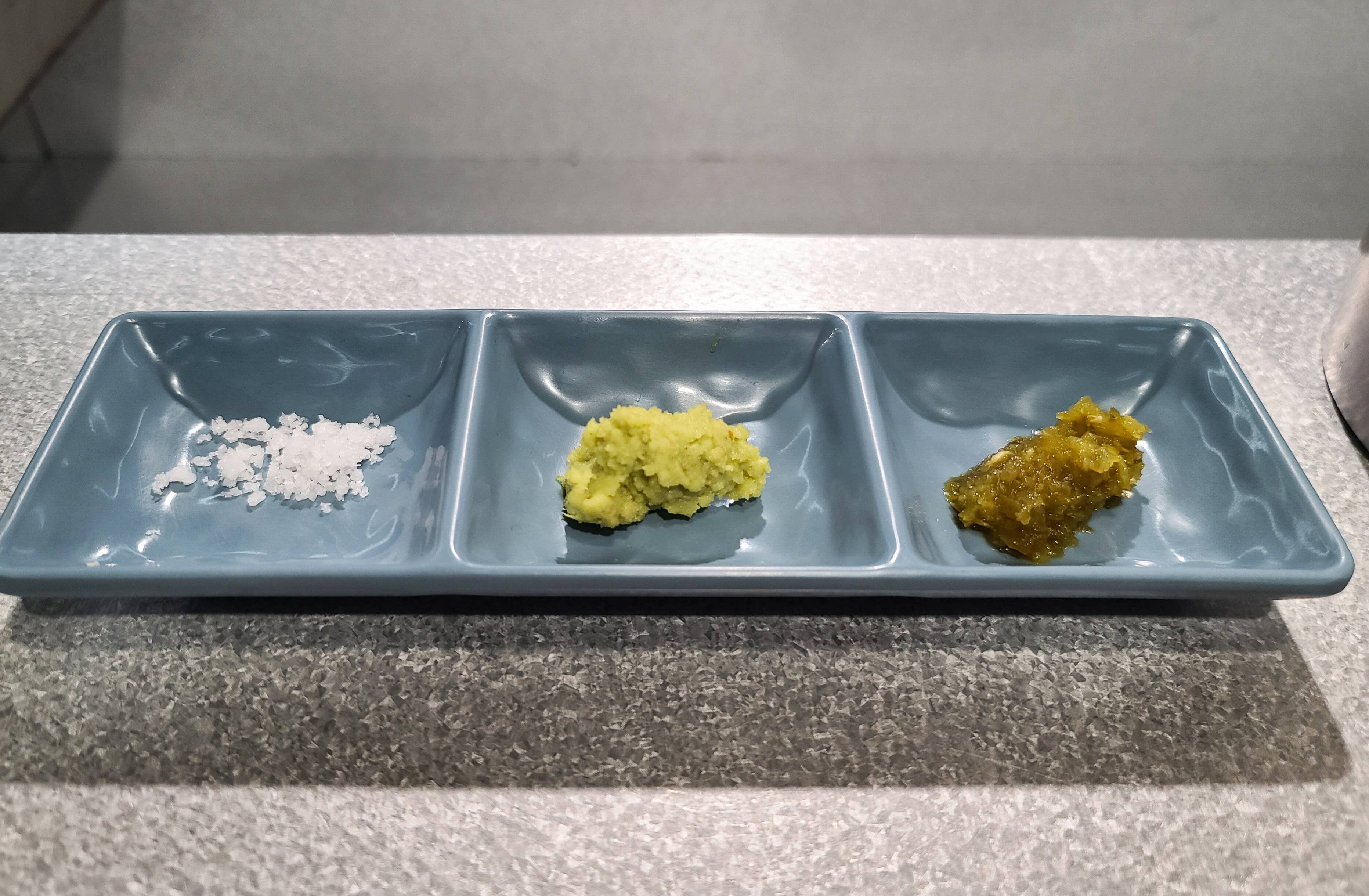 곧이어 반찬들과 함께 고기와 함께 곁들일 양념이 제공되었습니다. 반찬들은 전체적으로 고기와 조화가 잘 이루어졌고, 곧이어 소금 숯불 닭구이부터 준비가 되었습니다.