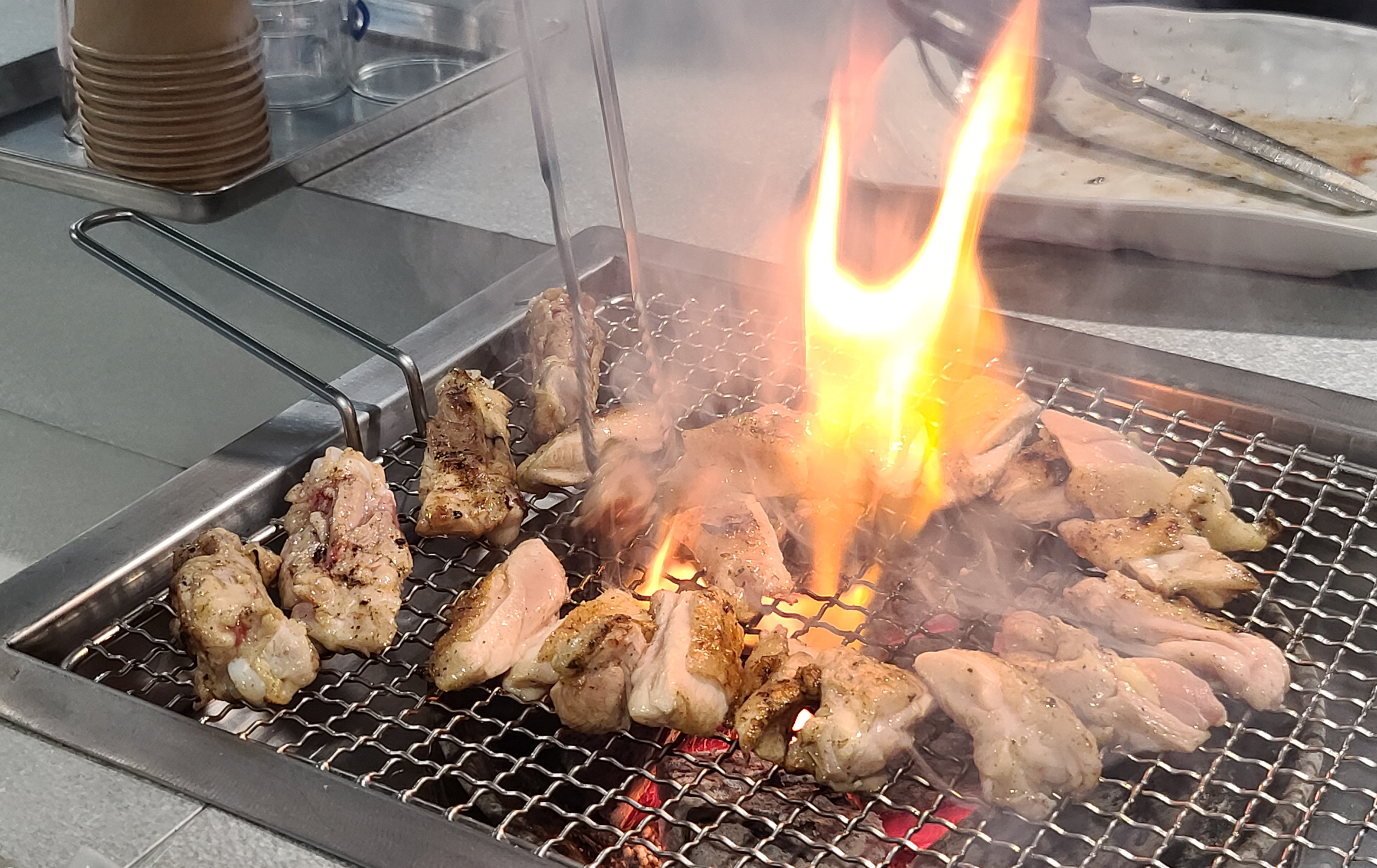 신당동 은화계의 소금 숯불 닭구이는 가게 직원이 직접 자리에서 닭의 뼈 부위와 살코기를 분리하였고, 불판에 직접 닭갈비를 굽기 시작했습니다. 소금 숯불 닭구이는 아무래도 양념 없이 소금으로만 간을 하여 담백한 맛이 좋았습니다.