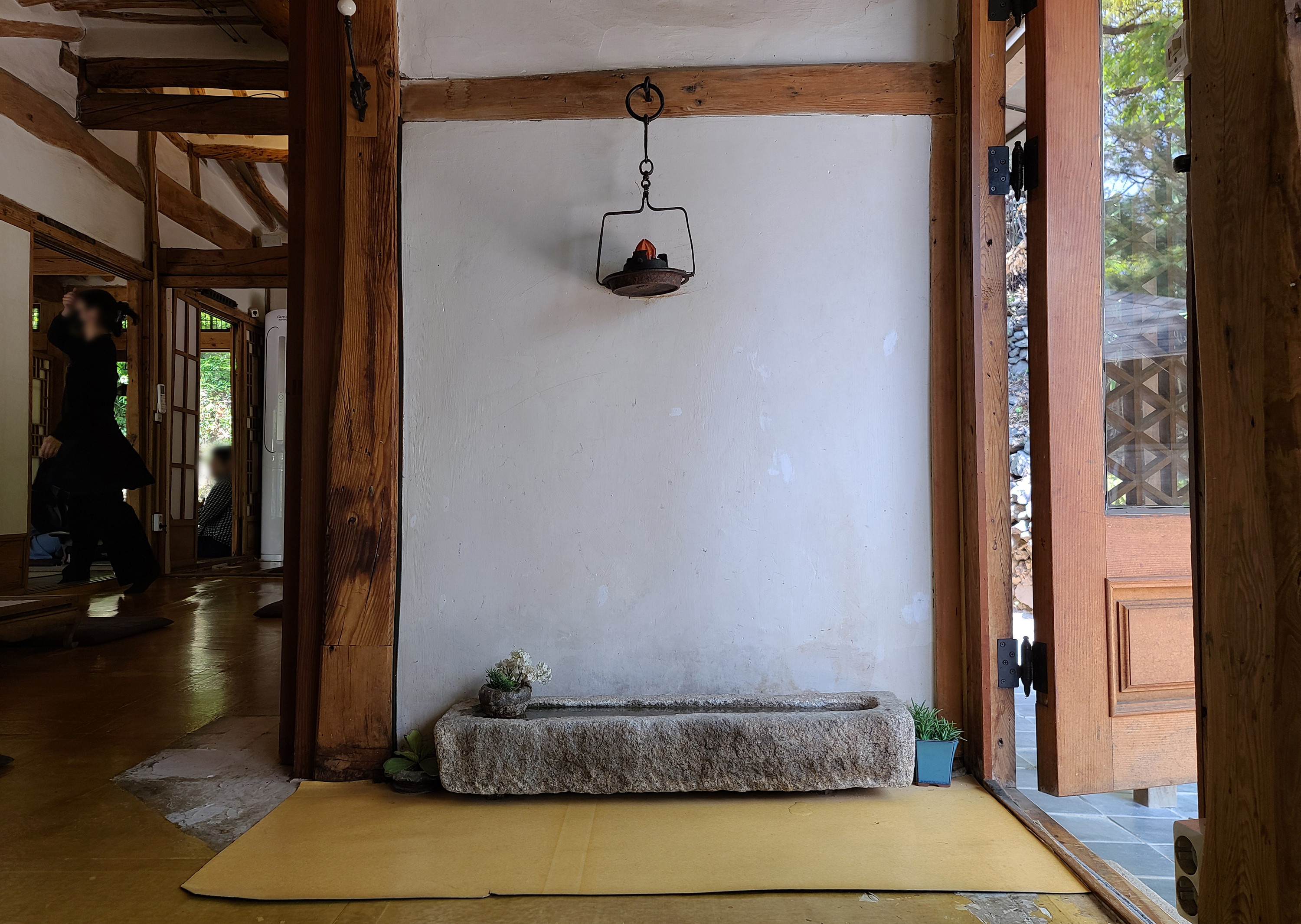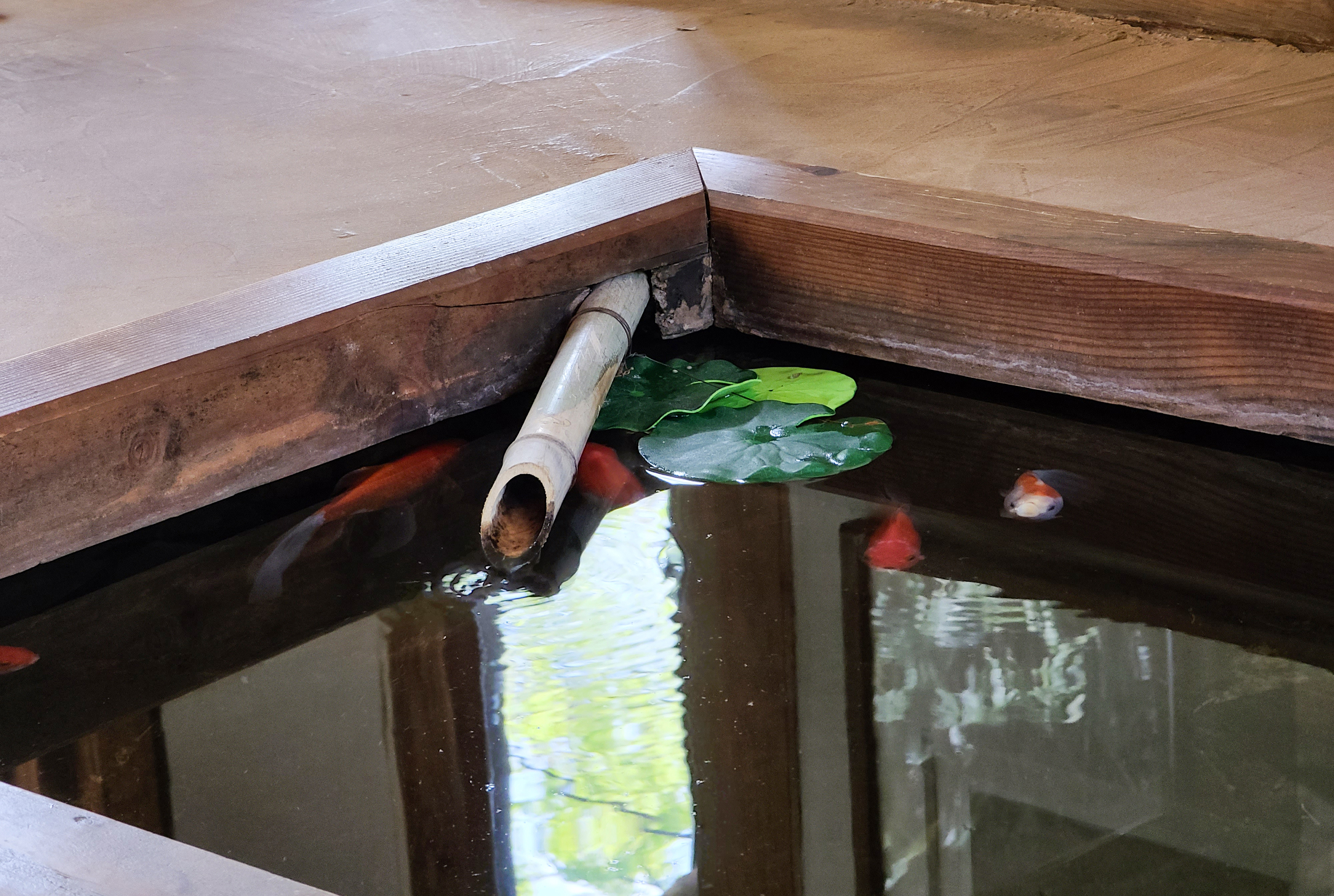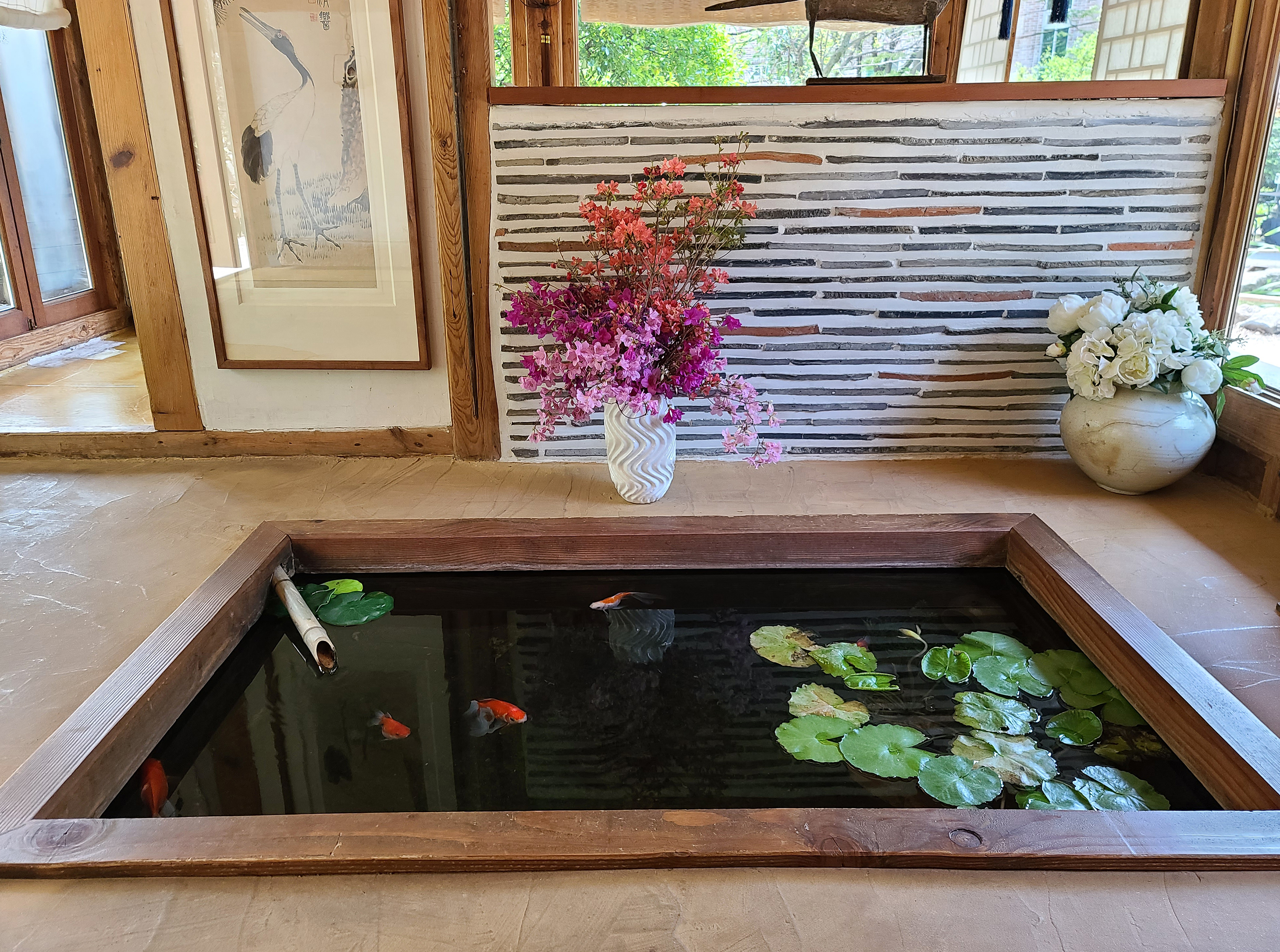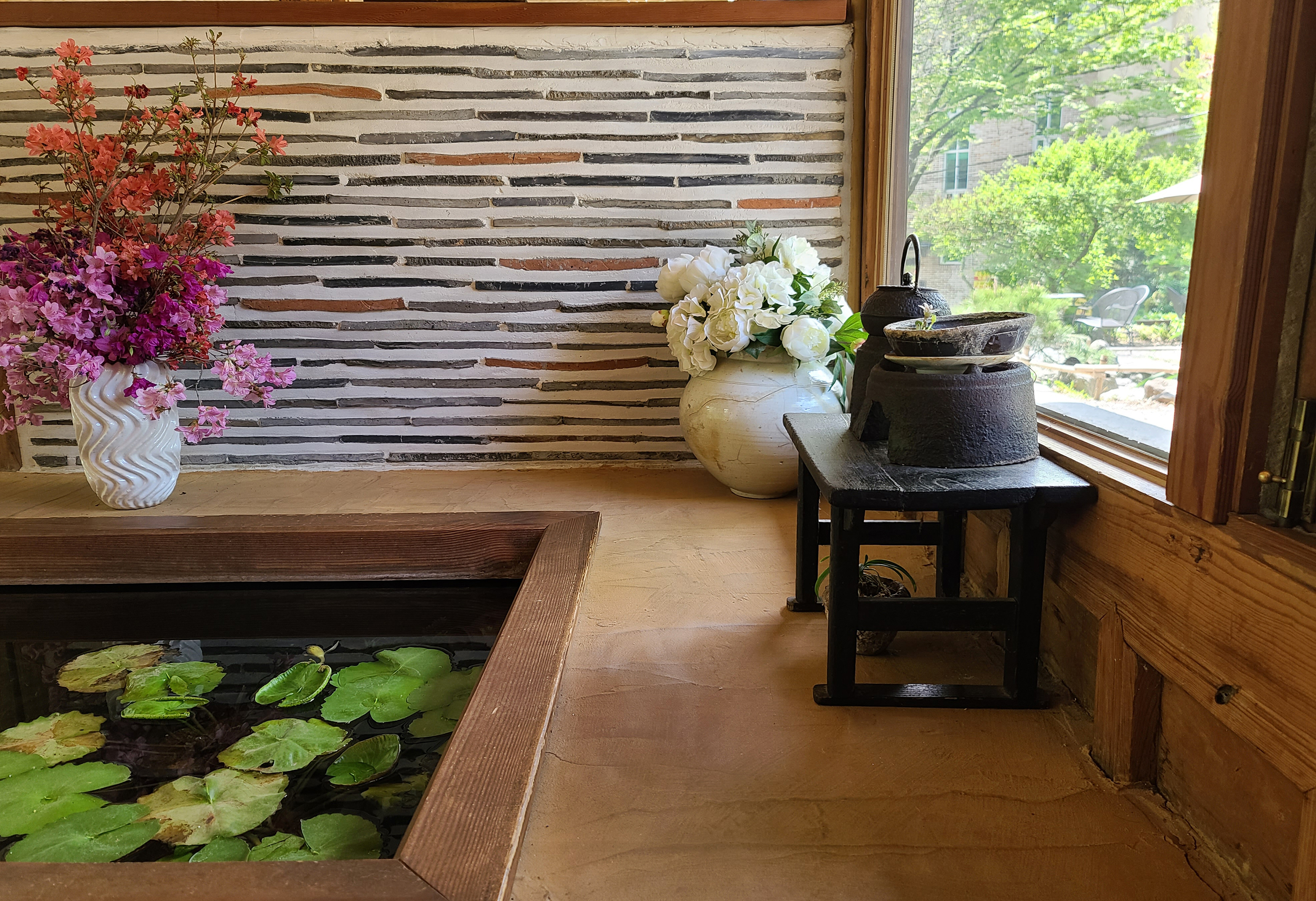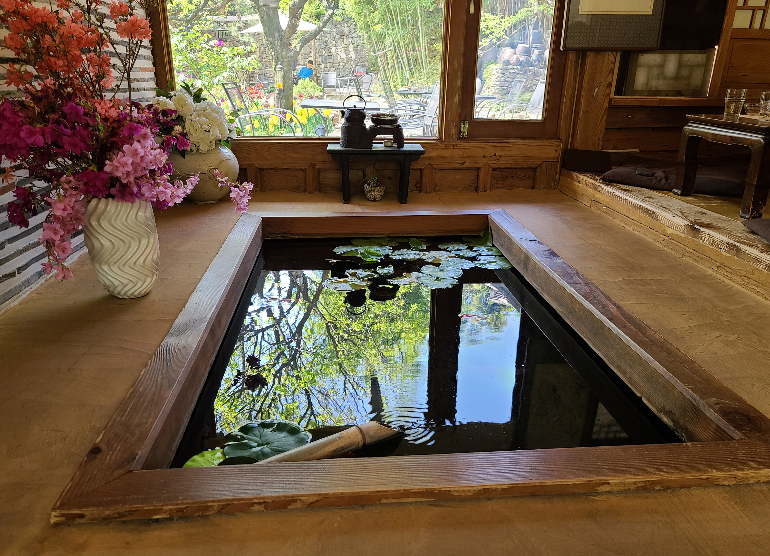 성남 한옥카페 새소리물소리 본채 안의 모습은 위와 같습니다. 현관에는 신발을 벗는 곳이 있었고, 곳곳에 오래되어 보이는 테이블과 방석으로 앉아서 먹는 곳이었습니다. 특히 저에게 마음에 들었던 곳은 이 실내에 작은 연못이었는데요, 연못에 금붕어가 헤엄치는 모습을 보며 커피를 마시는 것을 가장 좋아한답니다.