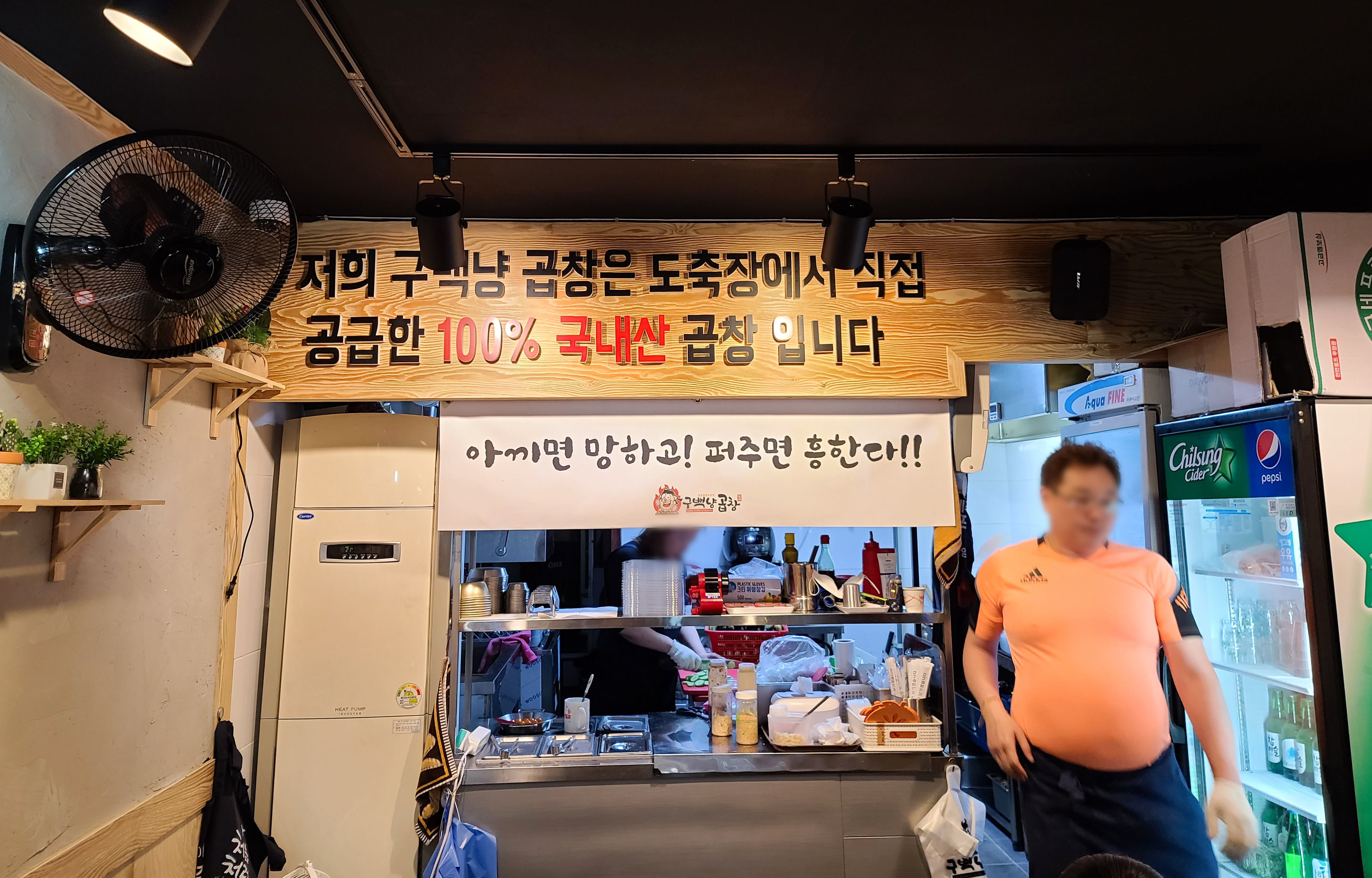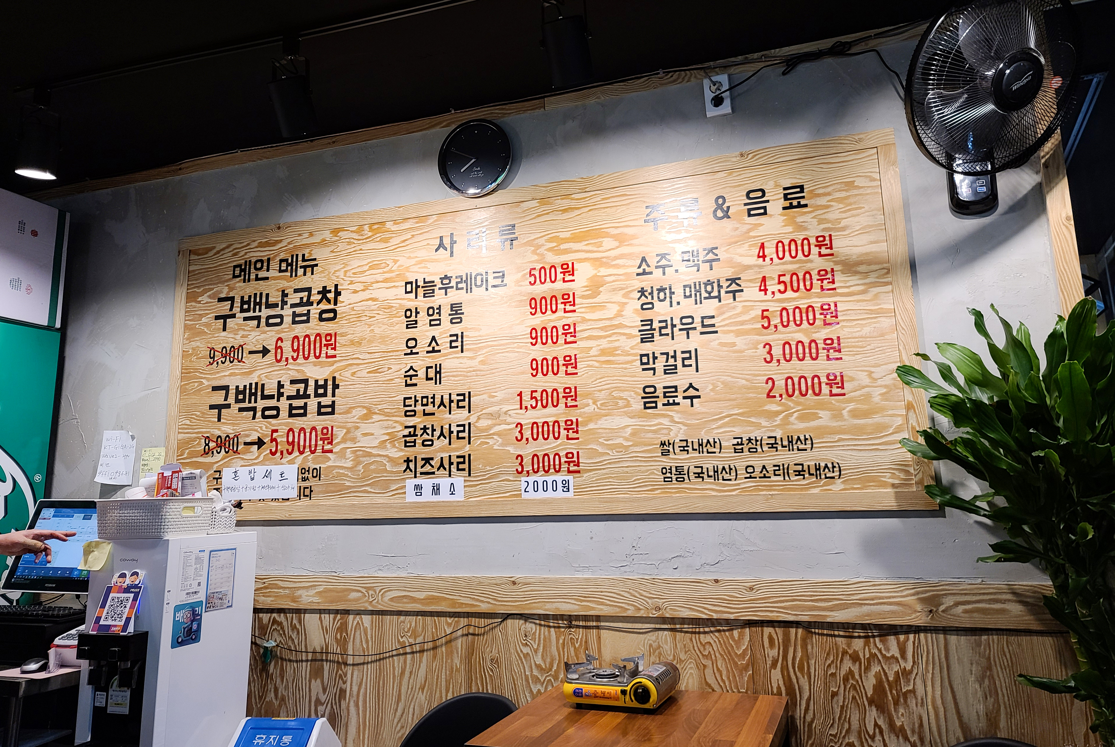 가게에 들어가면 위처럼 큼직한 메뉴를 확인할 수 있습니다. 메뉴는 구백냥곱창, 구백냥곱밥, 마늘후레이크, 알염통, 오소리, 순대, 당면사리, 곱창사리, 치즈사리, 쌈채소 등 이 있었습니다. 저희는 구백냥곱창 3인분, 마늘후레이크, 오소리, 치즈 사리를 추가했습니다.