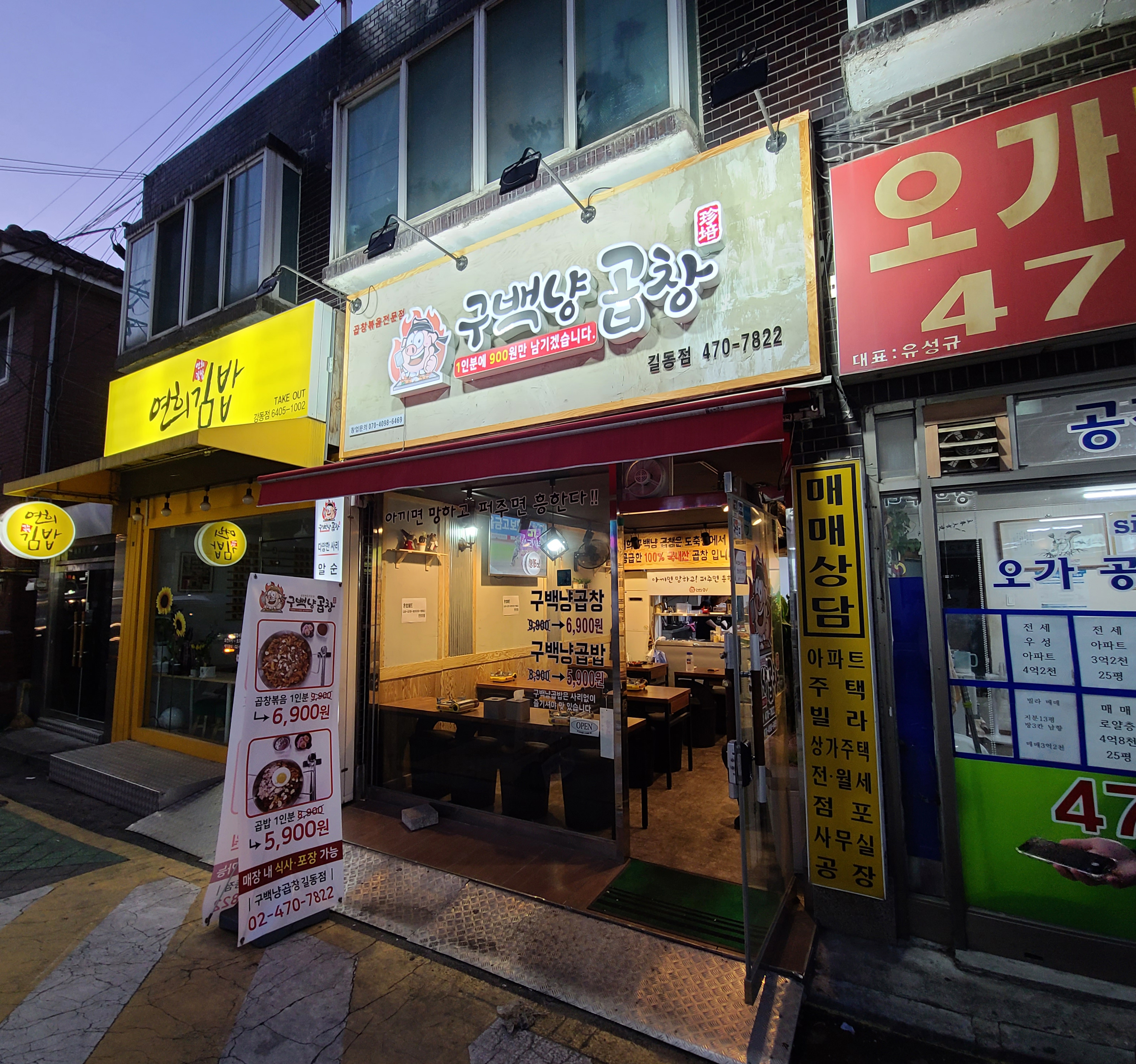 저는 개인적으로 야들야들하고 매콤한 양념의 곱창볶음을 좋아합니다. 신림동의 <구백냥곱창> 이용후 만족감이 높아서, 다른 곳에 위치한 <구백냥곱창>은 다른 지인과 함께 방문해보기로 하였습니다. 제가 찾은 곳은 길동의 <구백냥곱창> 인데요, 여기도 신림동처럼 잘 나오더라고요. (가게 내 주차공간은 없었습니다.)
