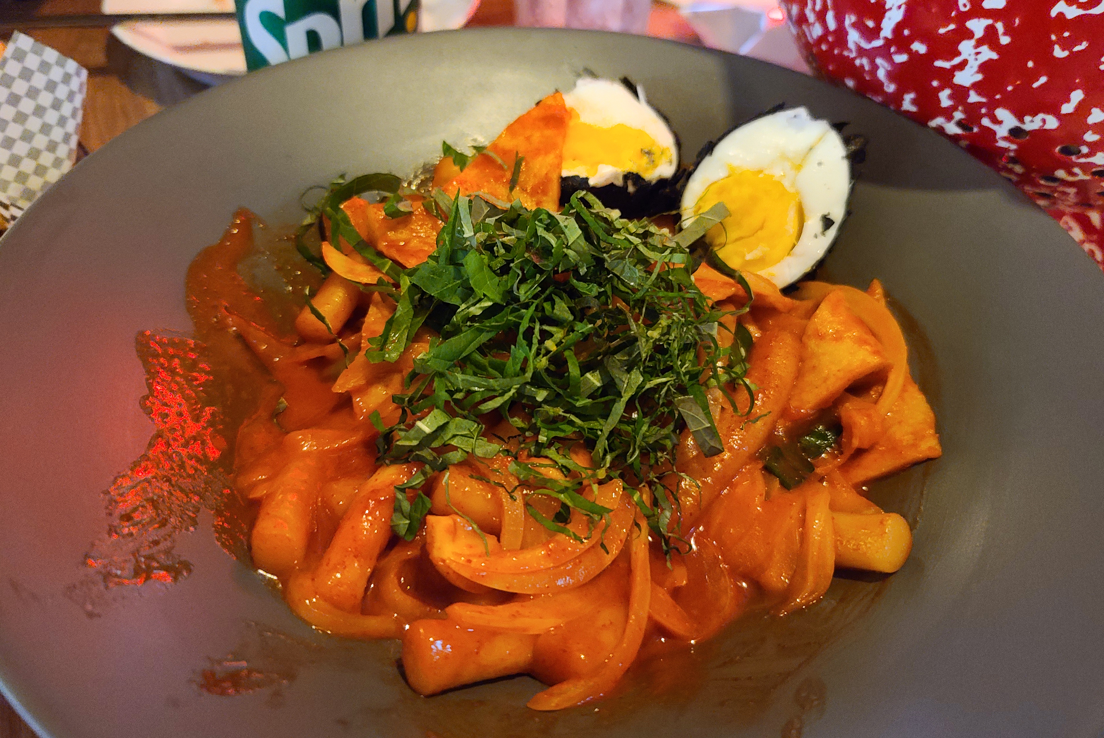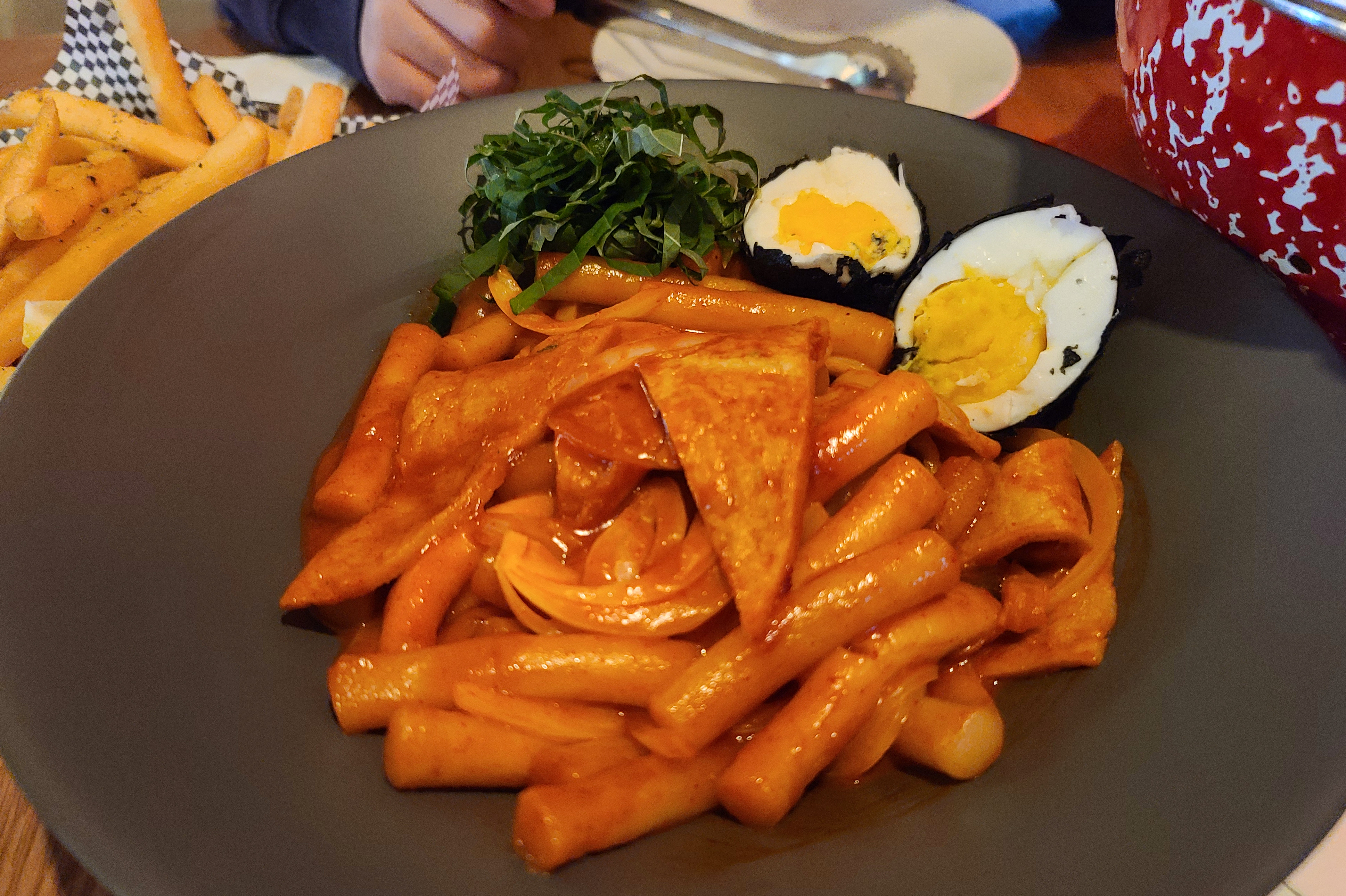 압구정 로켓 크리스피 치킨 '에그 블랙 떡볶이'는 매콤한 떡볶이에 깻잎이 고명으로 올라가며 로데오컬리치킨의 컬리플라워처럼 검은색 튀김옷을 입은 계란이 들어간 메뉴였습니다. 떡볶이도 기대는 안 했는데, 생각보다 입맛에 맞았습니다.